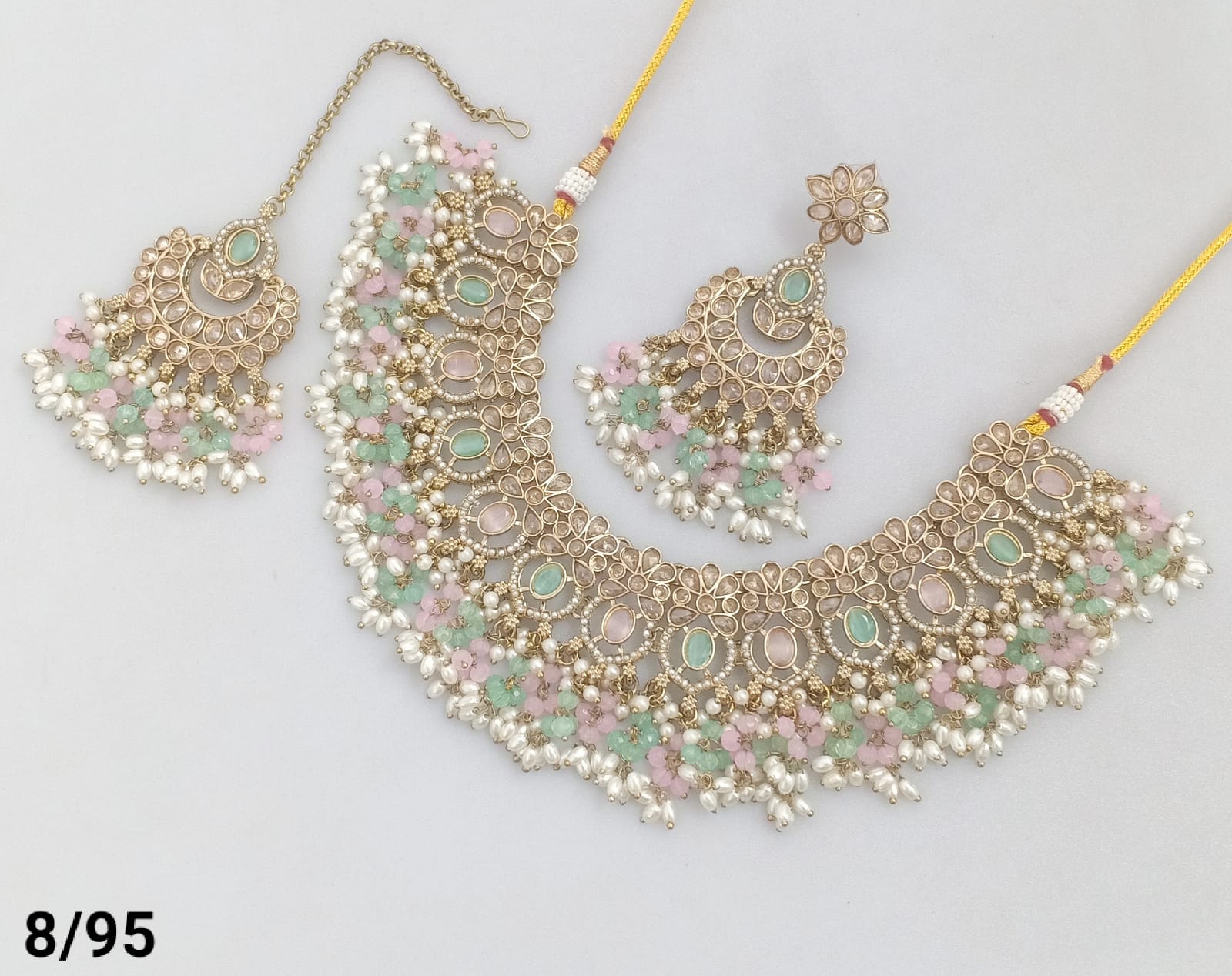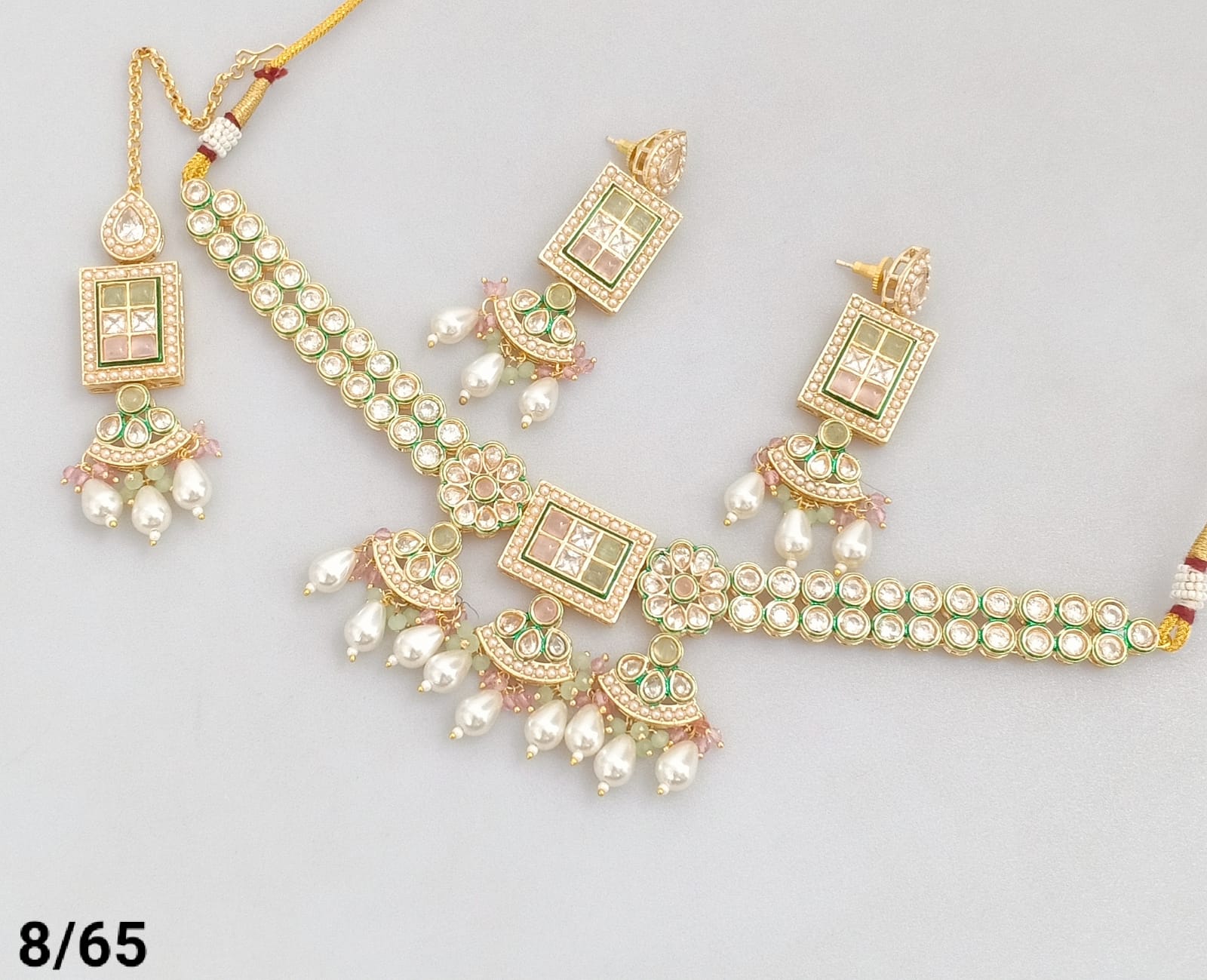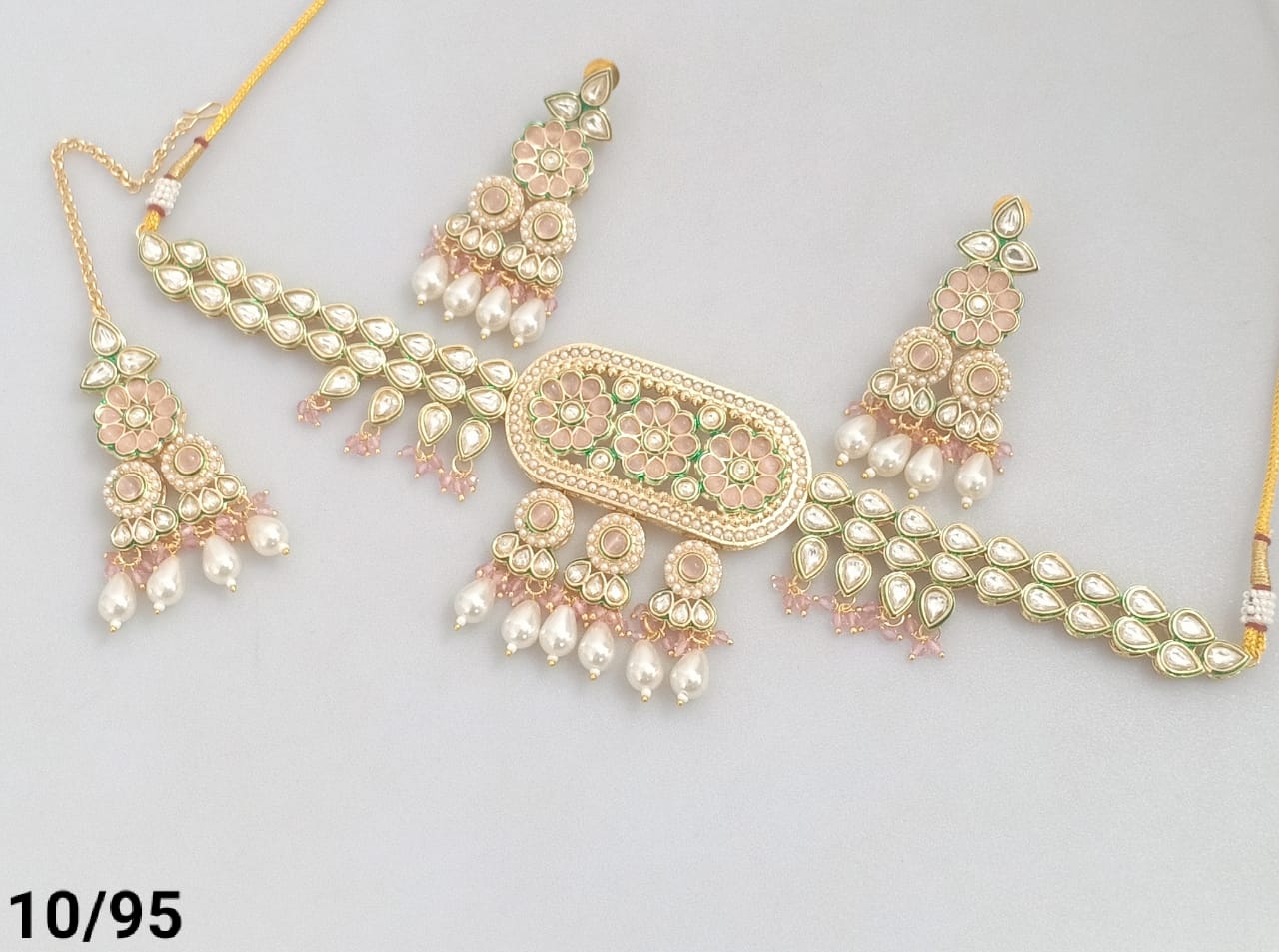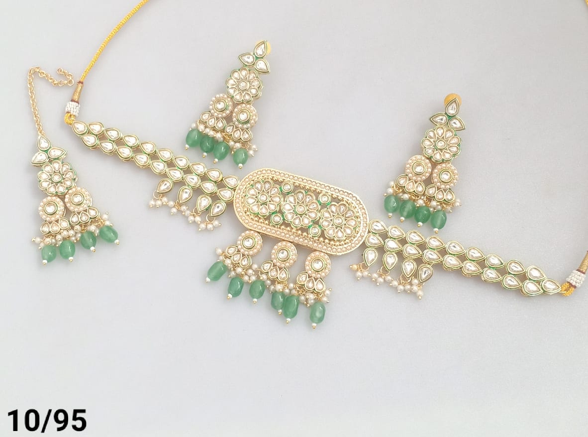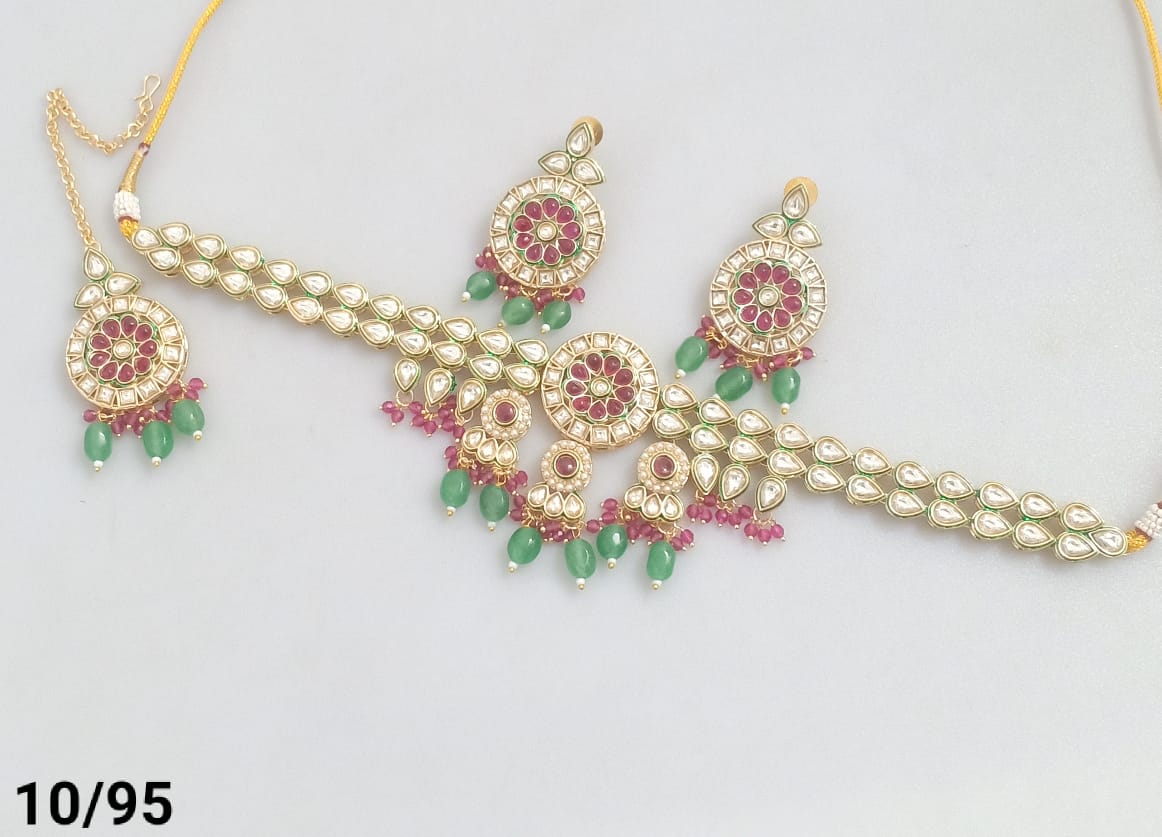 This elegant choker set showcases intricate Kundan work enhanced by a gold plating, perfect for adding a classic touch to your jewelry collection. It Has A...