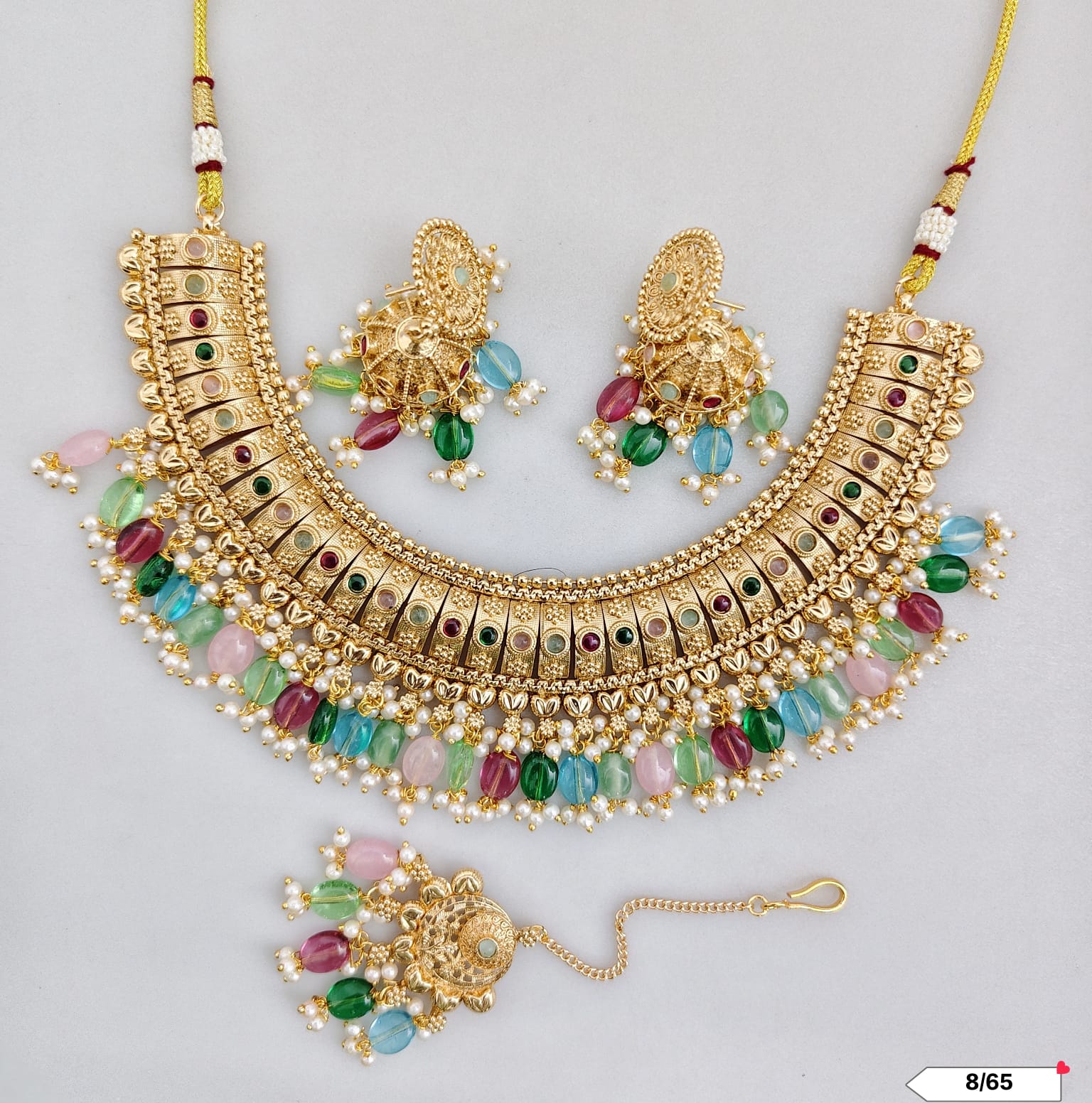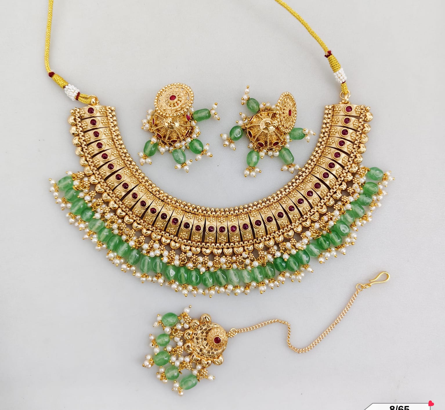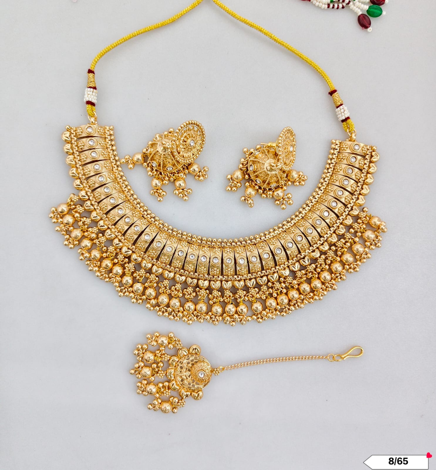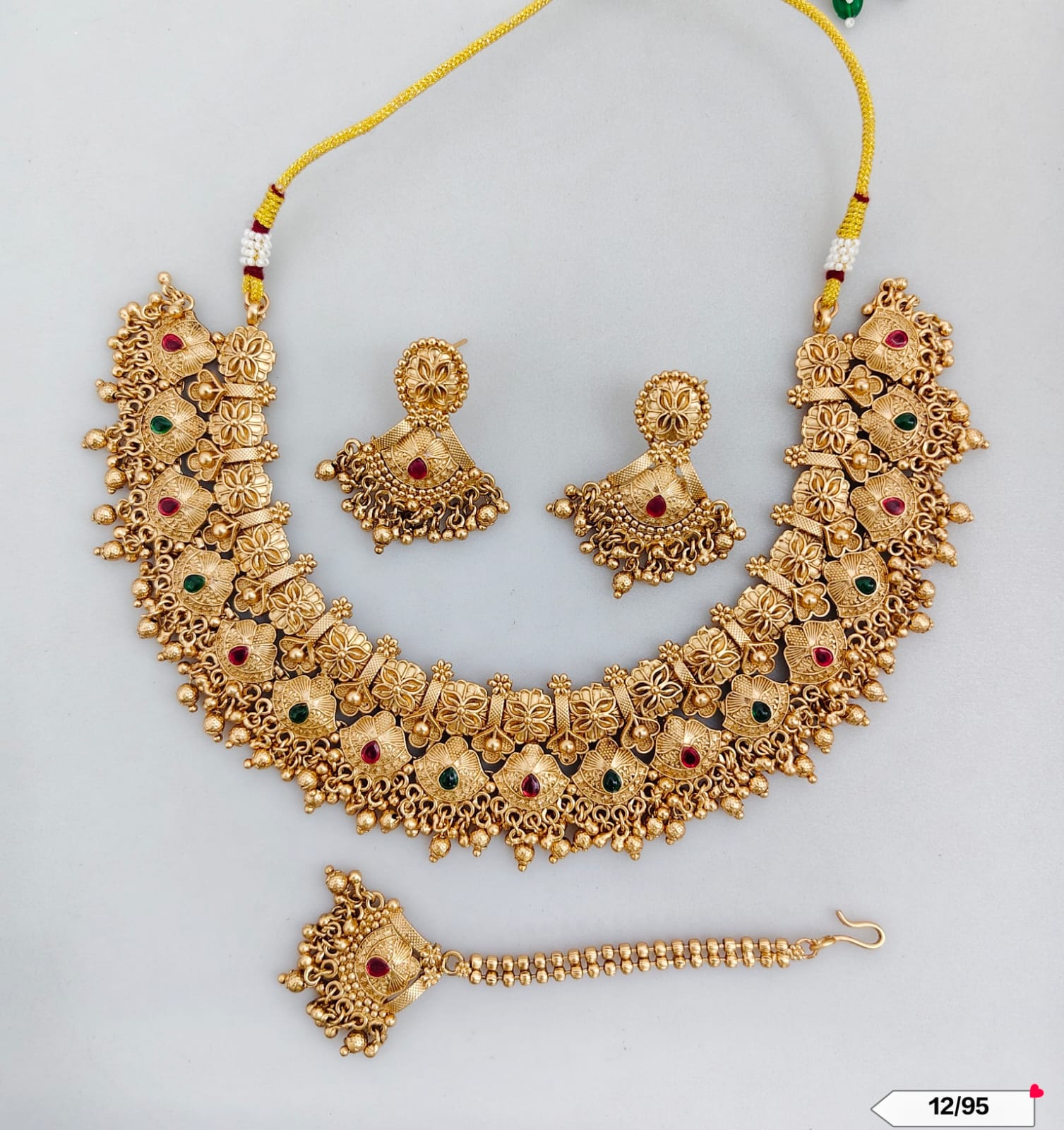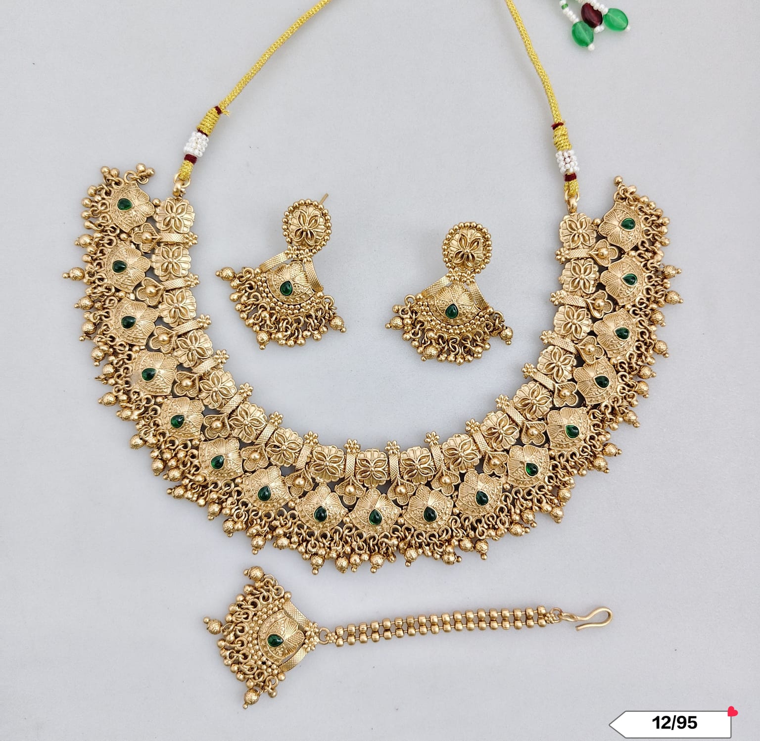 Choker necklace set featuring a sophisticated antique gold plating, exemplifying classic artistry and style. It Has A Pack Of :-1 Necklace Set,1 Pair Of Earrings,1 Mangtika.Material...