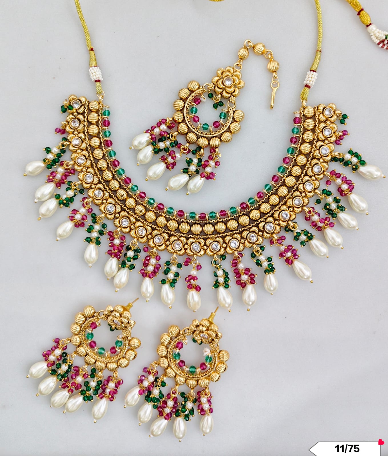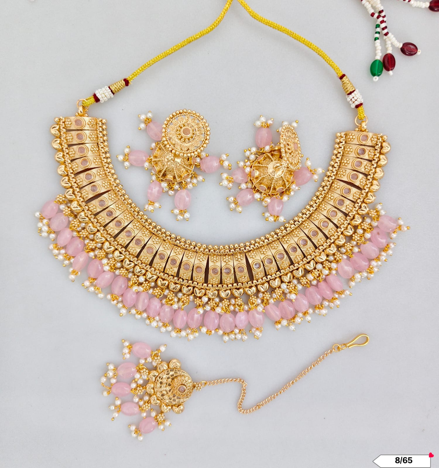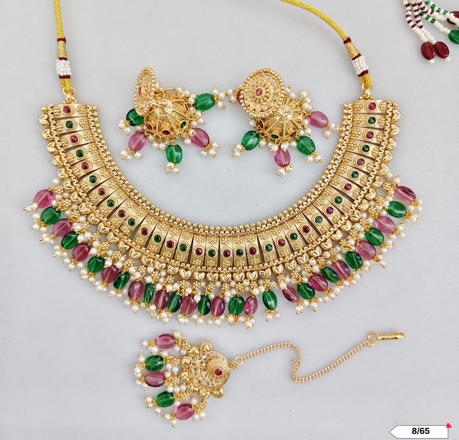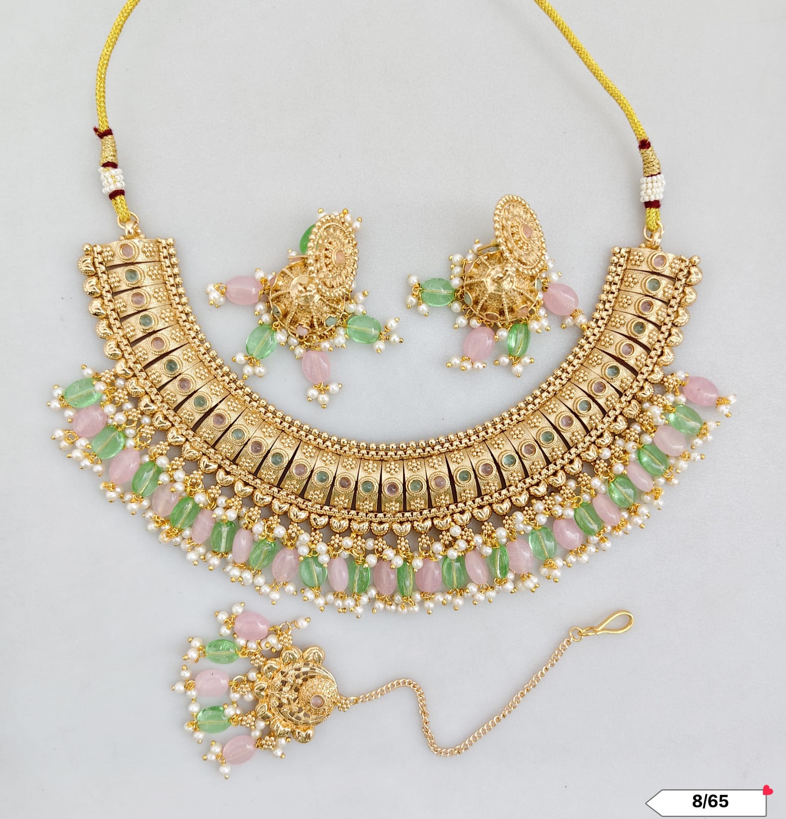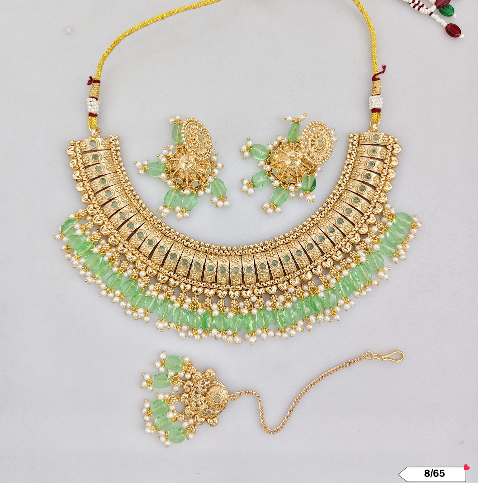 Choker necklace set featuring a sophisticated antique gold plating, exemplifying classic artistry and style. It Has A Pack Of :-1 Necklace Set,1 Pair Of Earrings,1 Mangtika.Material...