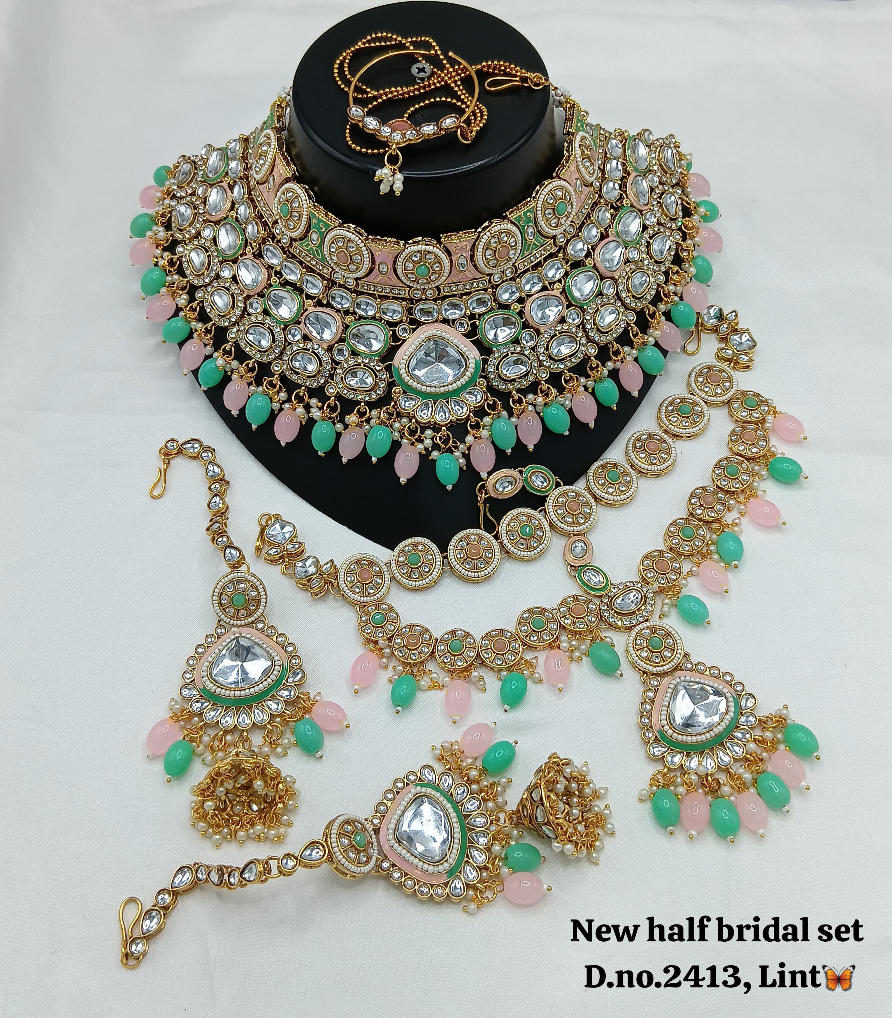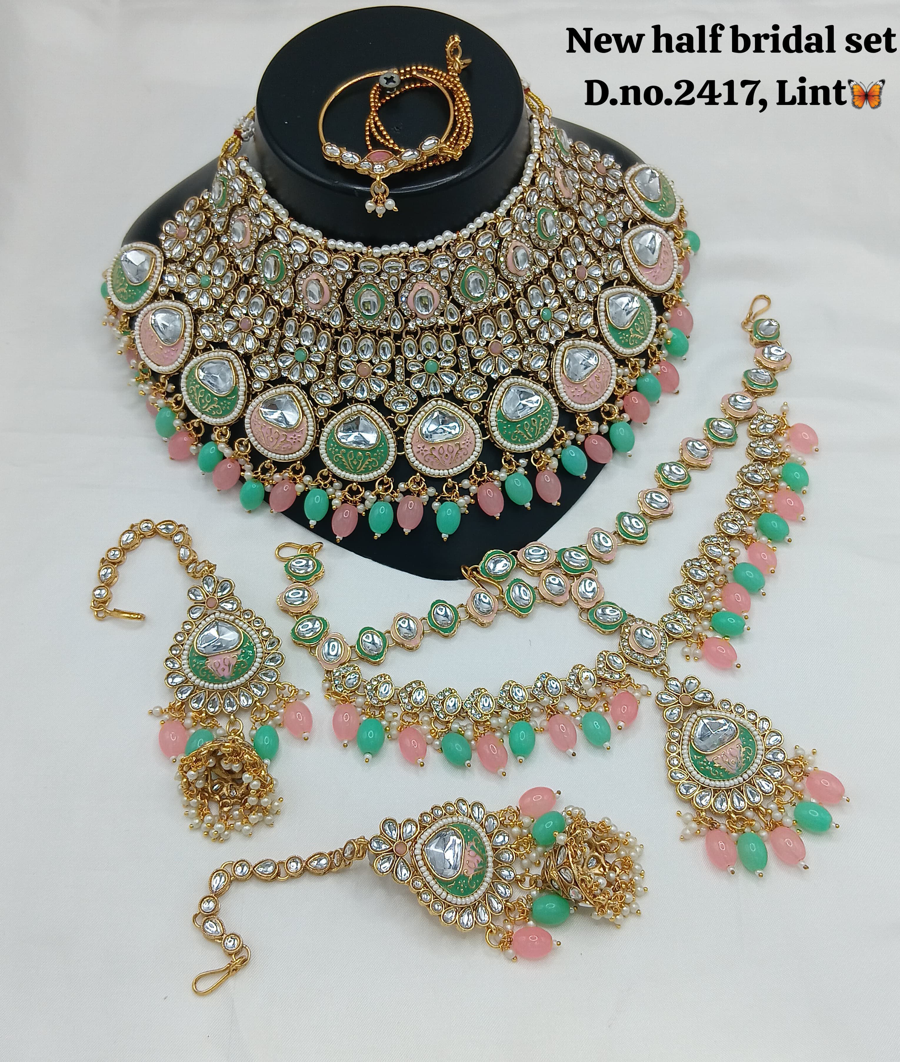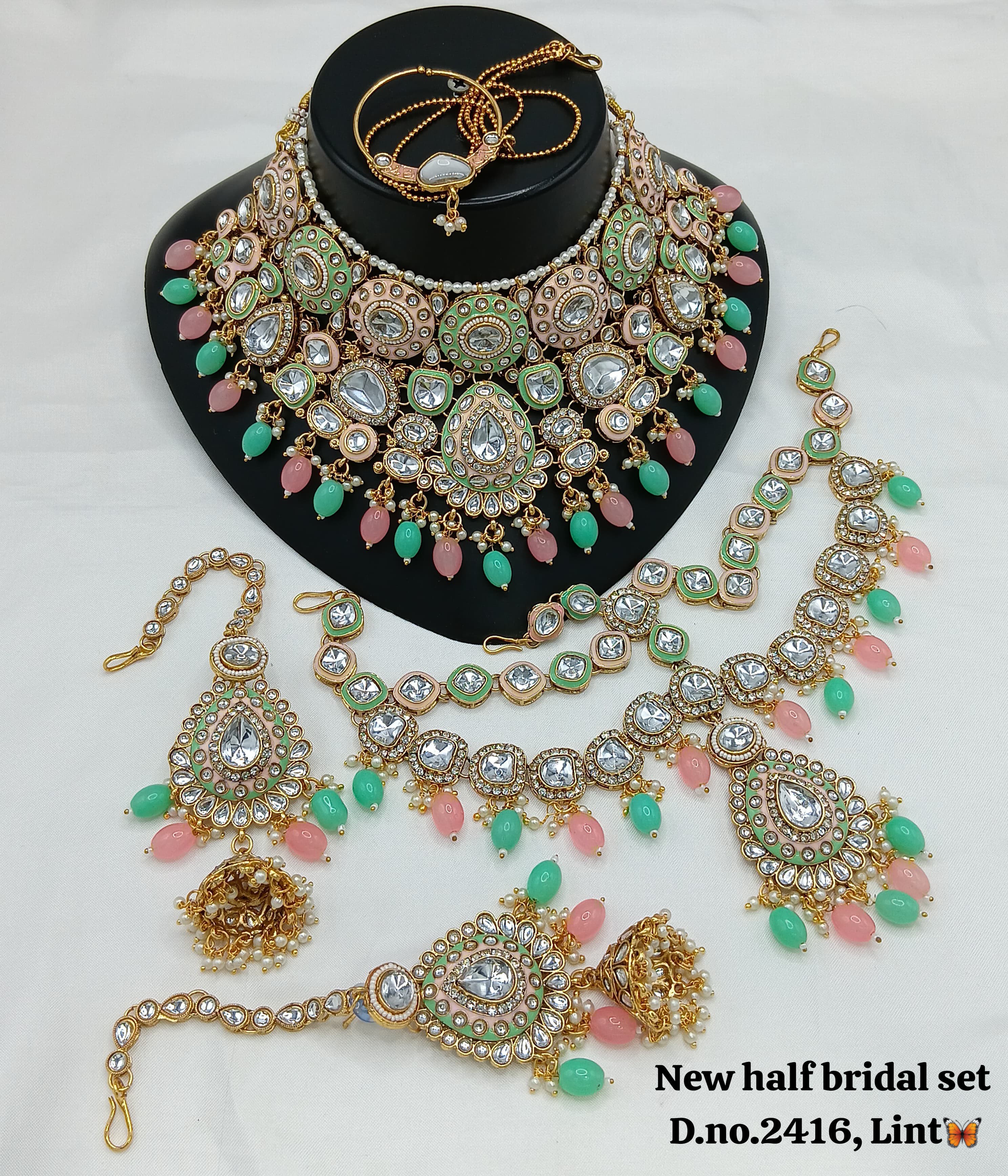 This exquisite half bridal set features intricate Meenakari work, beautifully enhanced with a gold-plated finish, perfect for adding a traditional yet elegant touch to your bridal...