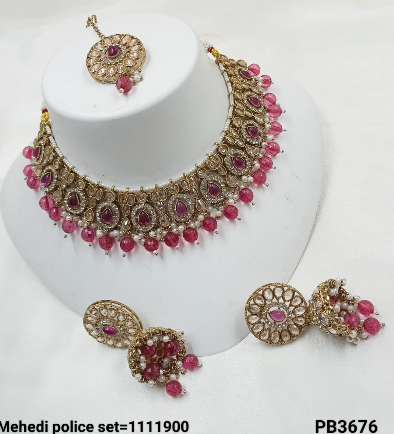 This exquisite Kundan necklace set features an antique design enhanced with a rose gold plating, showcasing timeless elegance and expert craftsmanship. It Has A Pack Of...