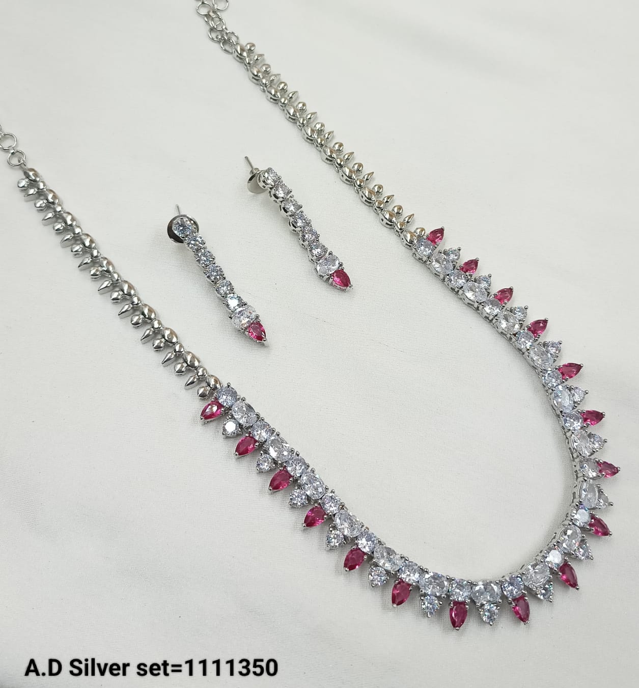 This exquisite long necklace set features American diamonds elegantly set on a silver-plated base, combining timeless sparkle with sophisticated design. Ideal for enhancing formal and festive...