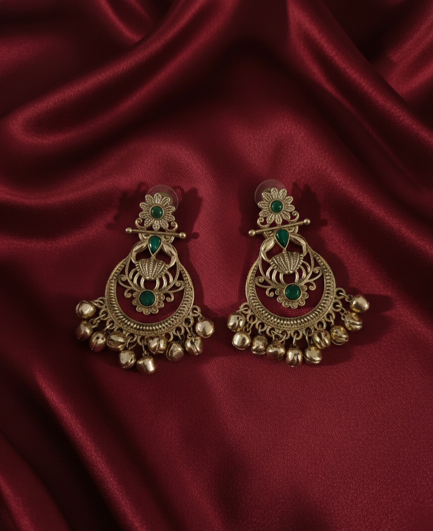 Product Highlights: Artisanal Design: Intricate filigree metalwork on the bell offers a classic "temple jewelry" aesthetic. Royal Color Palette: The deep emerald green stone contrasts beautifully...
