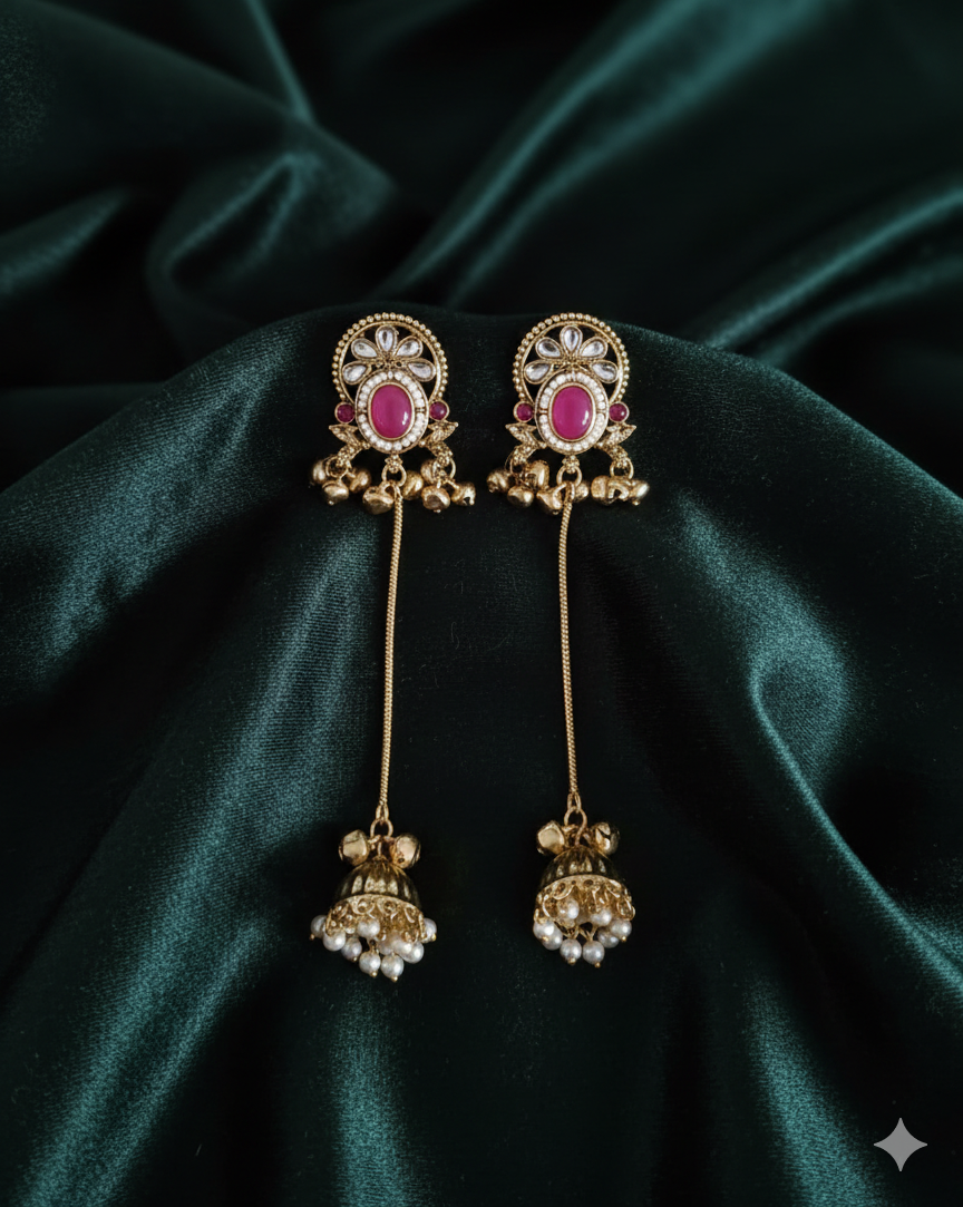 Product Highlights: Sunburst Floral Stud: A beautifully detailed circular stud featuring a prominent ruby center and radiant white stone petals. Ornate Filigree Dome: The Jhumka bell...