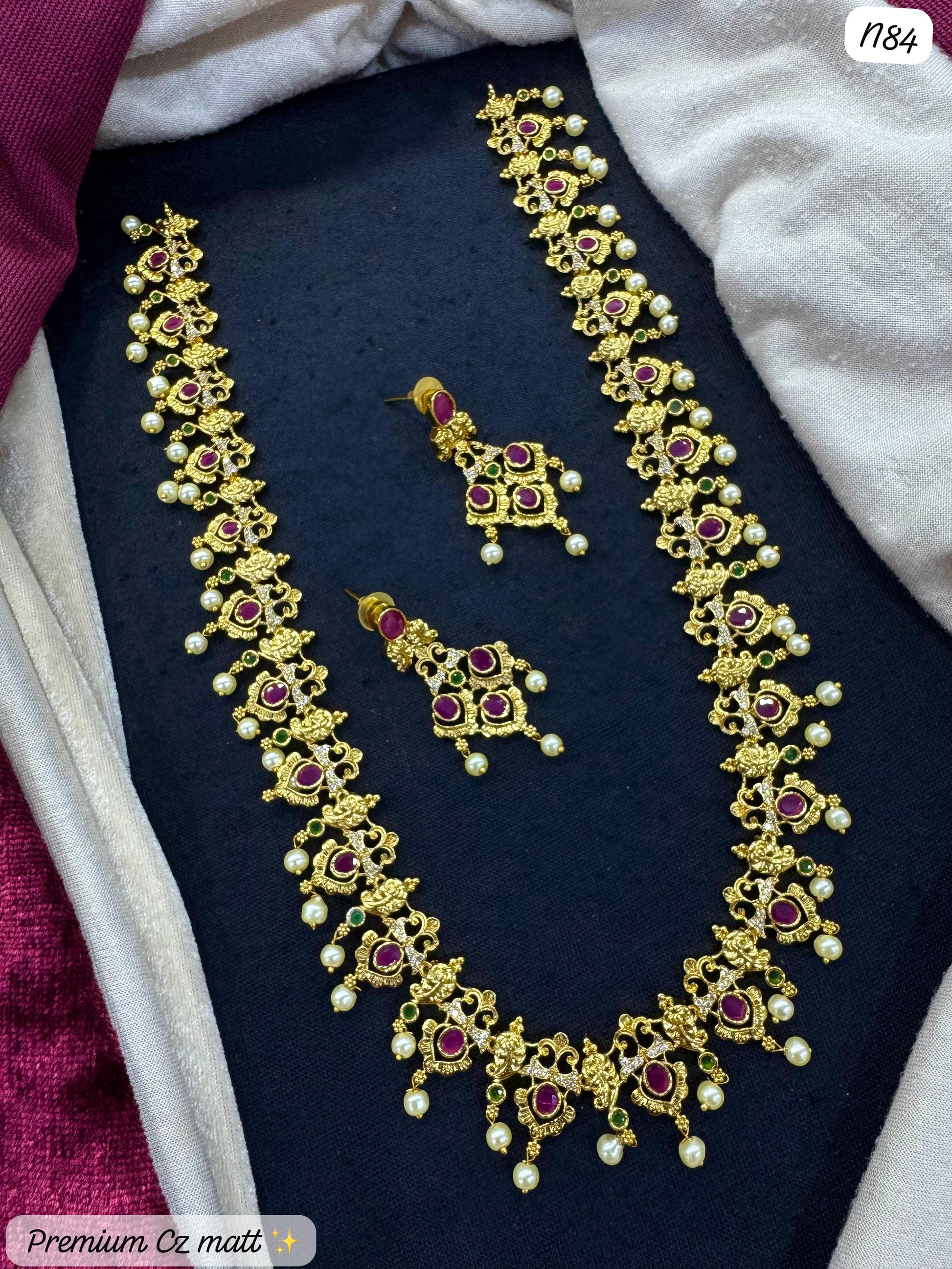 Add timeless elegance to your traditional look with this exquisite AD Long Necklace Set, inspired by classic South Indian temple jewelry. Adorned with ruby-colored stones, lustrous pearl drops, this set radiates royal charm and cultural richness.Perfect for weddings, festive celebrations, and traditional events, the long necklace pairs beautifully with the matching earrings to complete your ethnic ensemble.