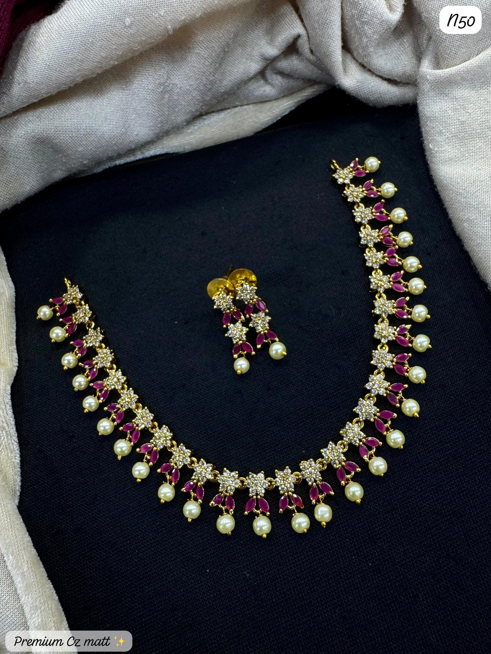 AD Matte Necklace & Earring Set with Ruby Stones & Pearl Drops