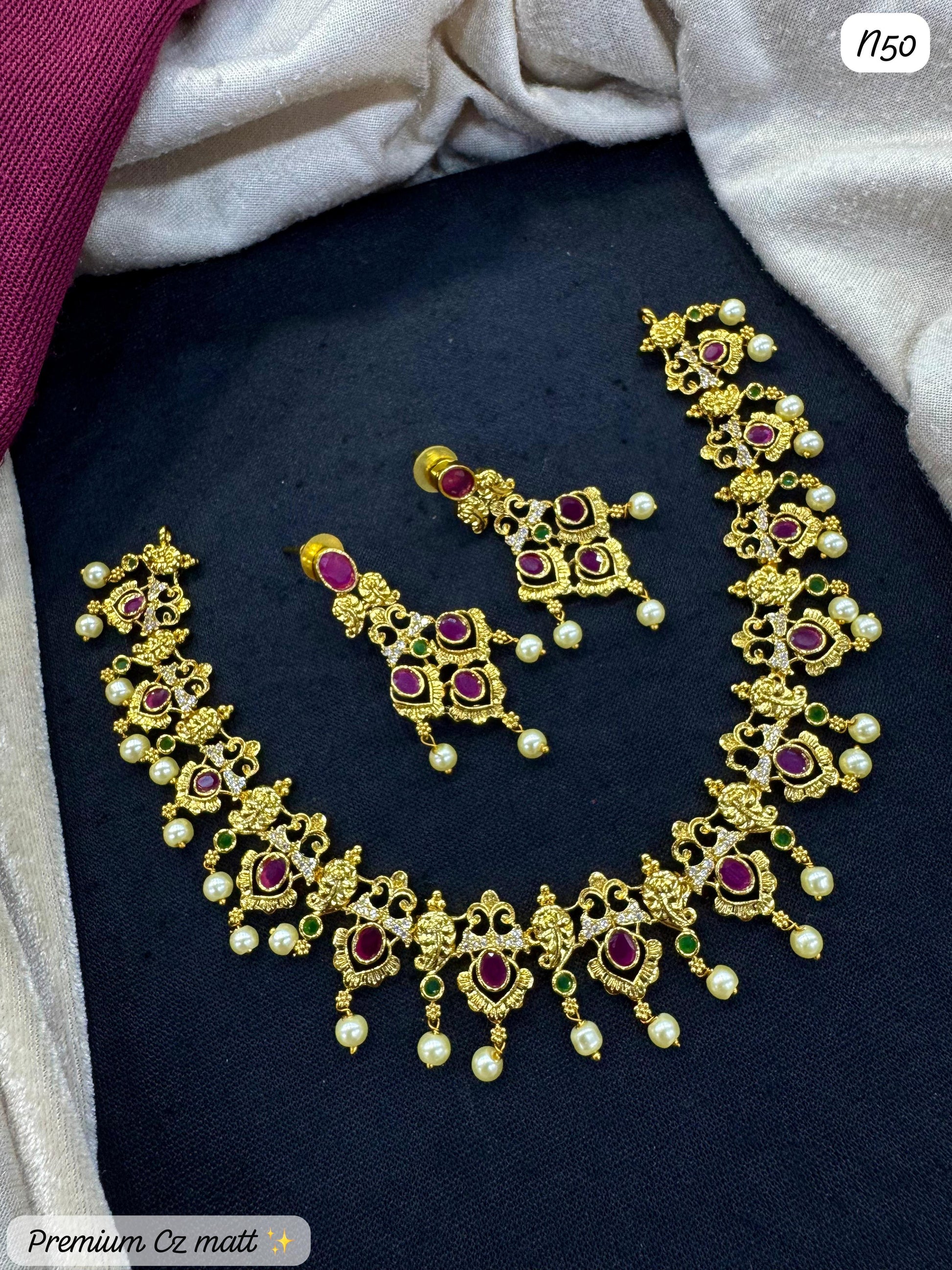 Elevate your ethnic ensemble with this stunning AD Necklace Set, intricately designed in a traditional temple jewelry style. Featuring sparkling American Diamonds (AD), rich ruby-red stones, and elegant pearl drops, this set brings regal charm and heritage elegance to any outfit.This set includes a beautifully crafted necklace and matching earrings, both adorned with intricate motifs and fine detailing inspired by South Indian temple jewelry.