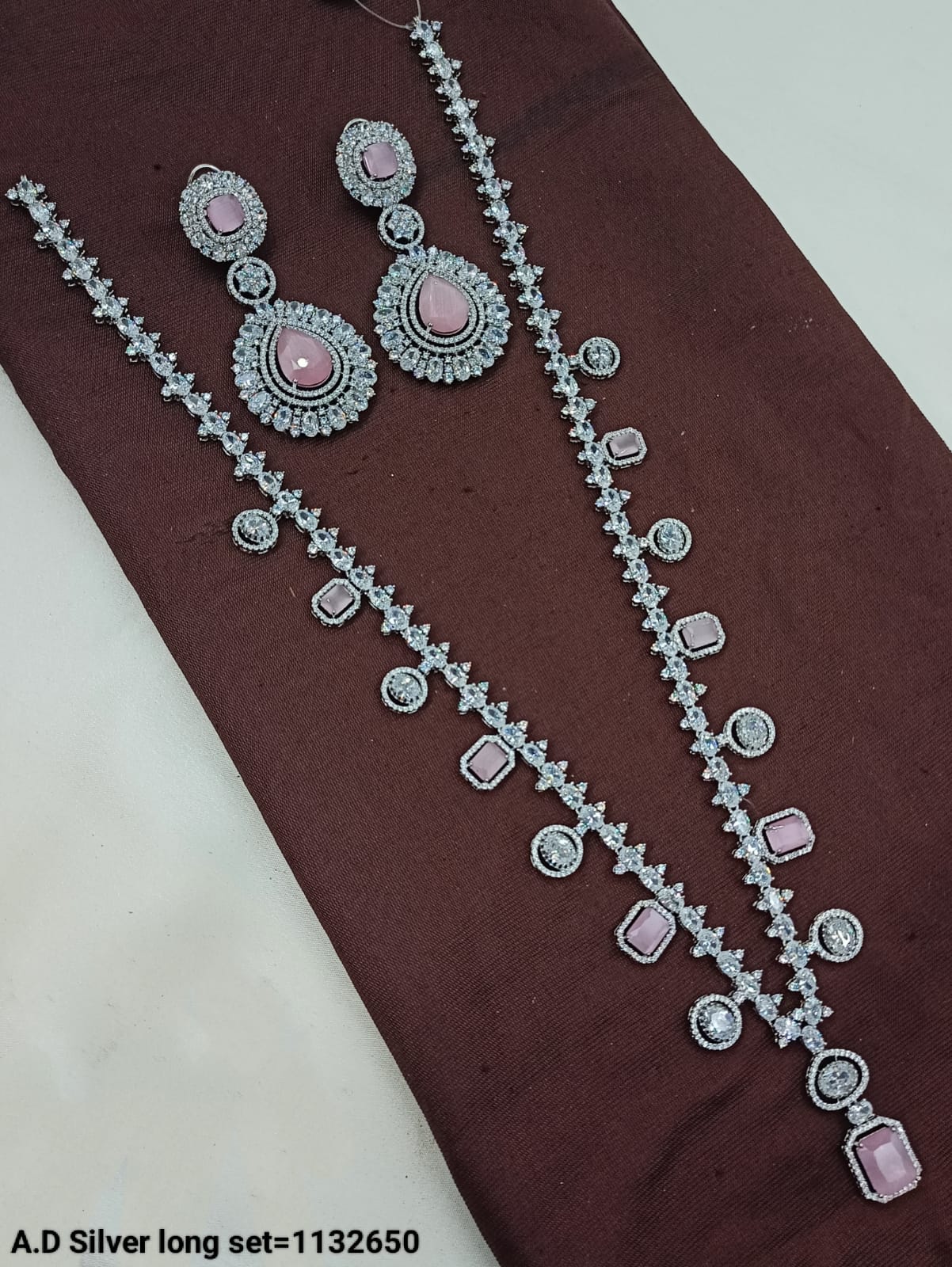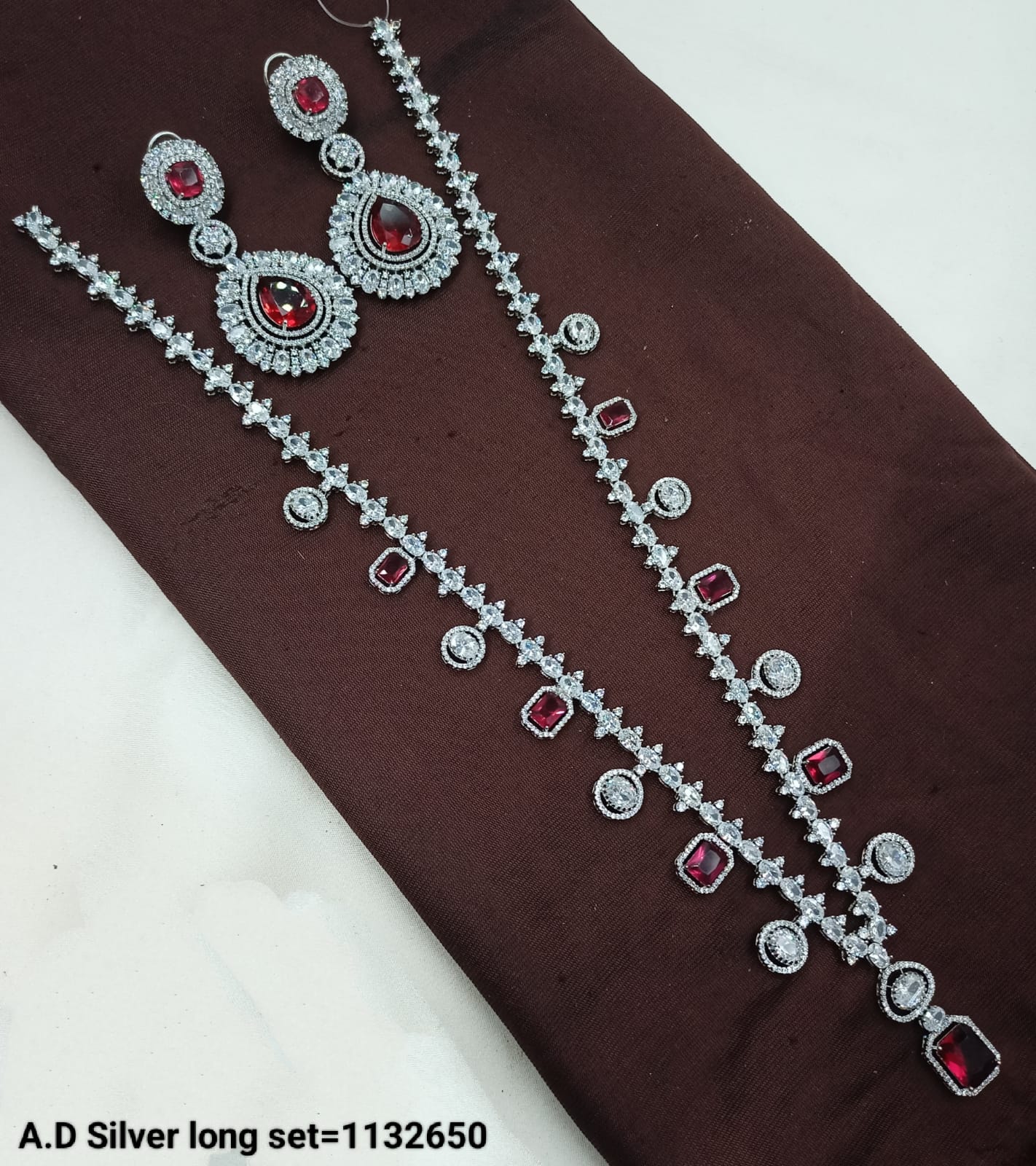 AD Silver Long Necklace and Earring Set with Stone Detailing - Lucentemarket