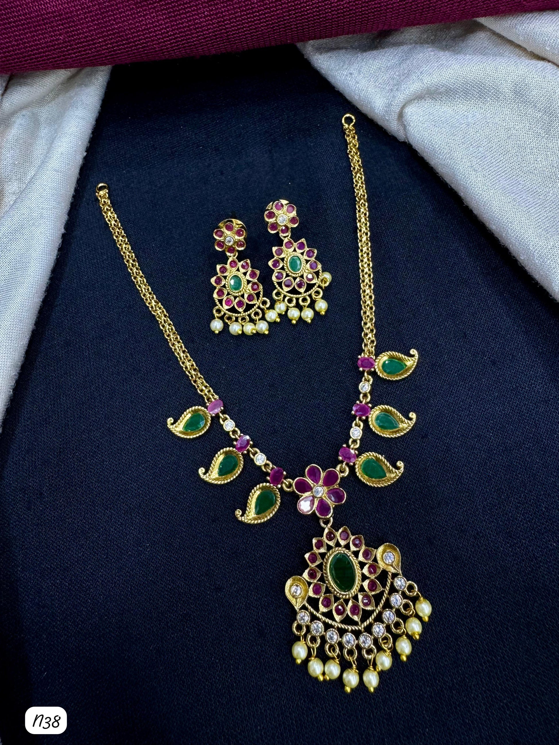 Step into timeless elegance with this A.D Traditional Kundan-Style Necklace and Earring Set. Designed with intricate craftsmanship, this set features a beautiful blend of traditional motifs, sparkling American Diamonds, and elegant pearl drops. The rich detailing and artistic design make it an ideal accessory for weddings, festivals, and cultural celebrations. Add a regal charm to your ensemble with this stunning heritage-inspired piece.
