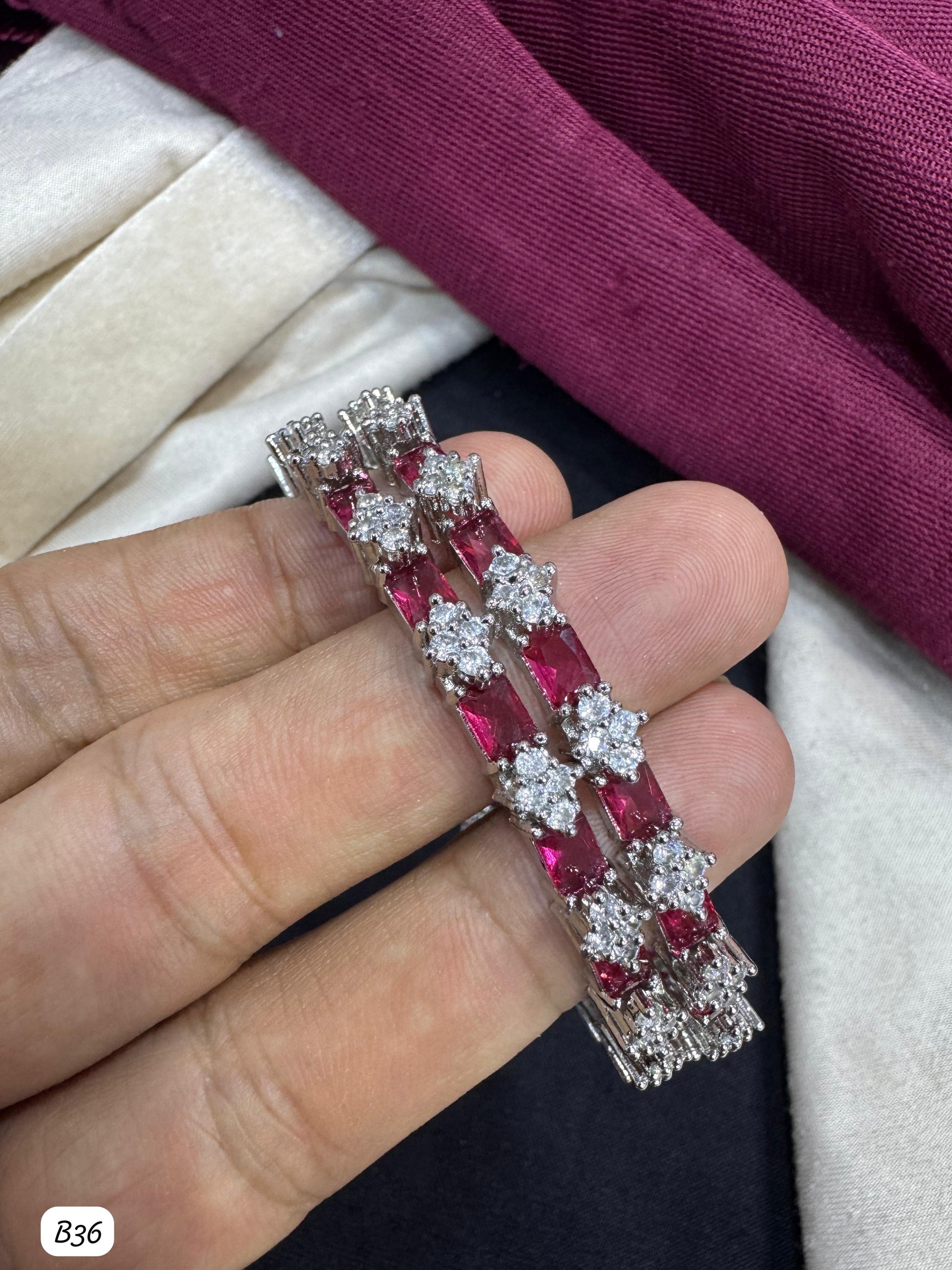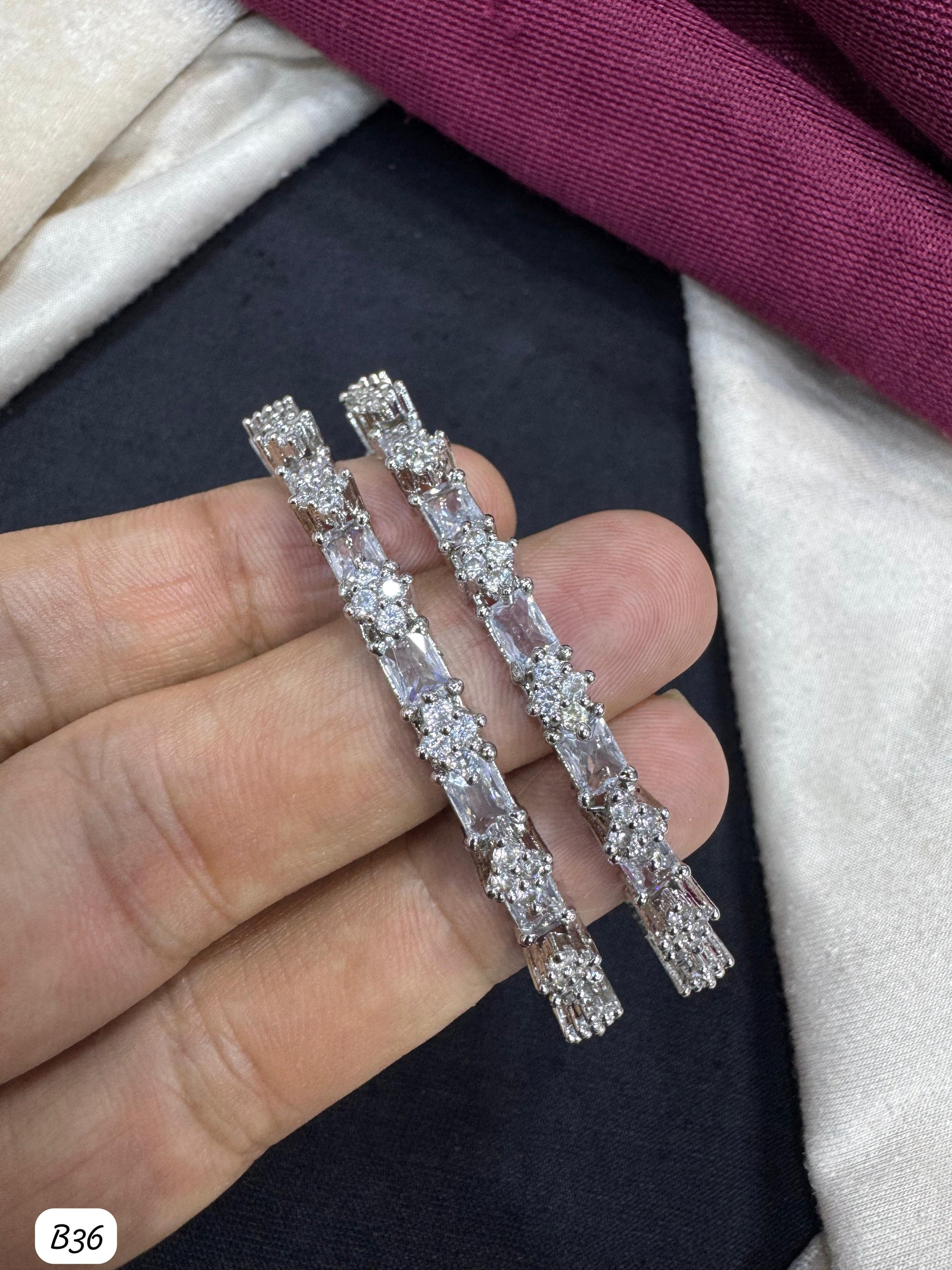 Make a graceful statement with this Elegant AD Stone Bangle, designed to blend contemporary elegance with timeless beauty. Featuring sleek baguette-cut stones paired with delicate floral motifs, this bangle exudes sophistication and sparkle. Crafted with attention to detail, it is perfect for weddings, parties, or elevating your everyday ethnic and fusion outfits. A must-have for every jewelry lover who values elegance with a hint of glamour.