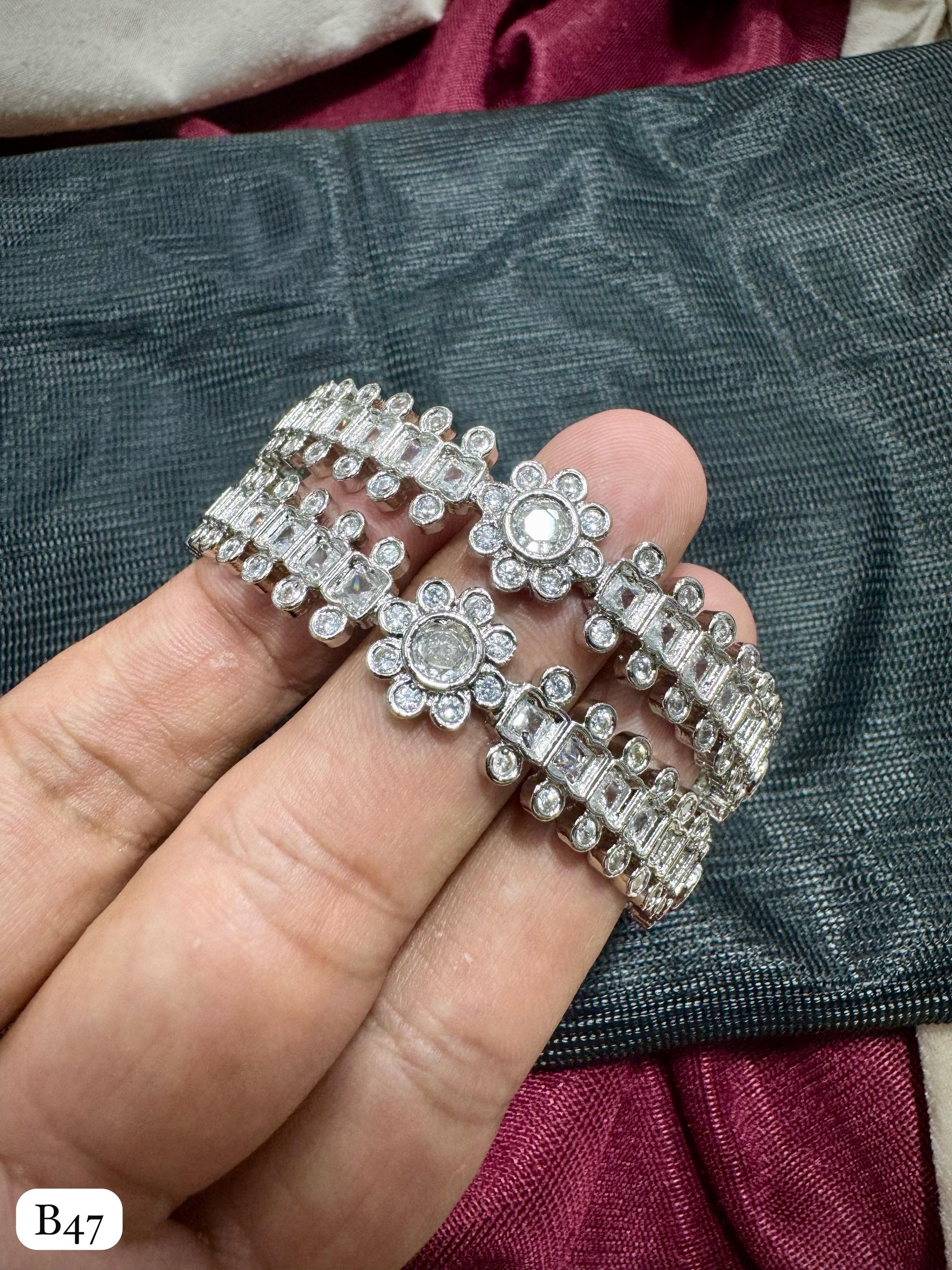Crafted with elegant American Diamond and silver plating, these bangles are sure to elevate your style. The sparkling diamonds add a touch of glamour while the silver plating ensures durability. Perfect for any occasion, these bangles will be a statement accessory in your collection.