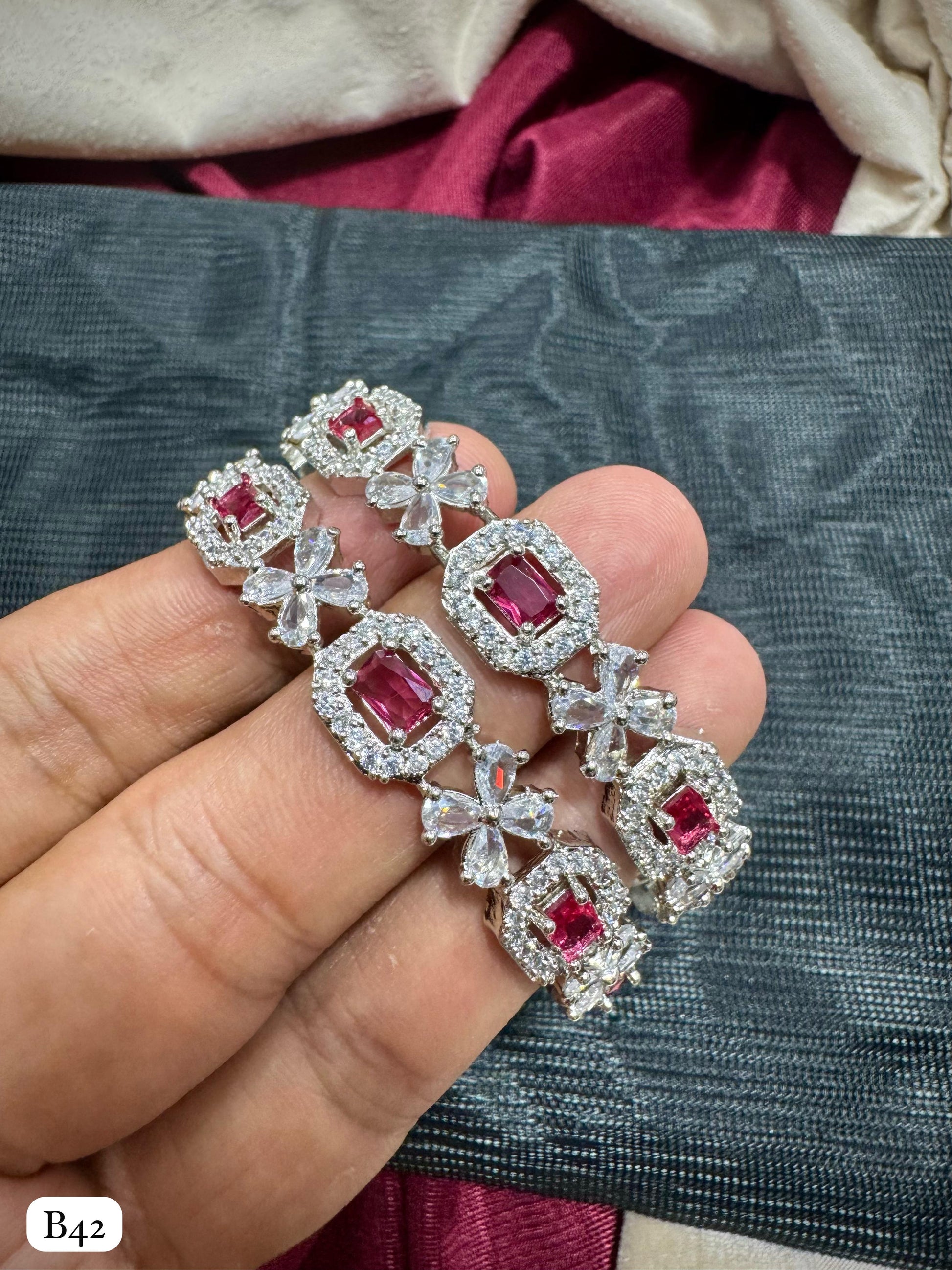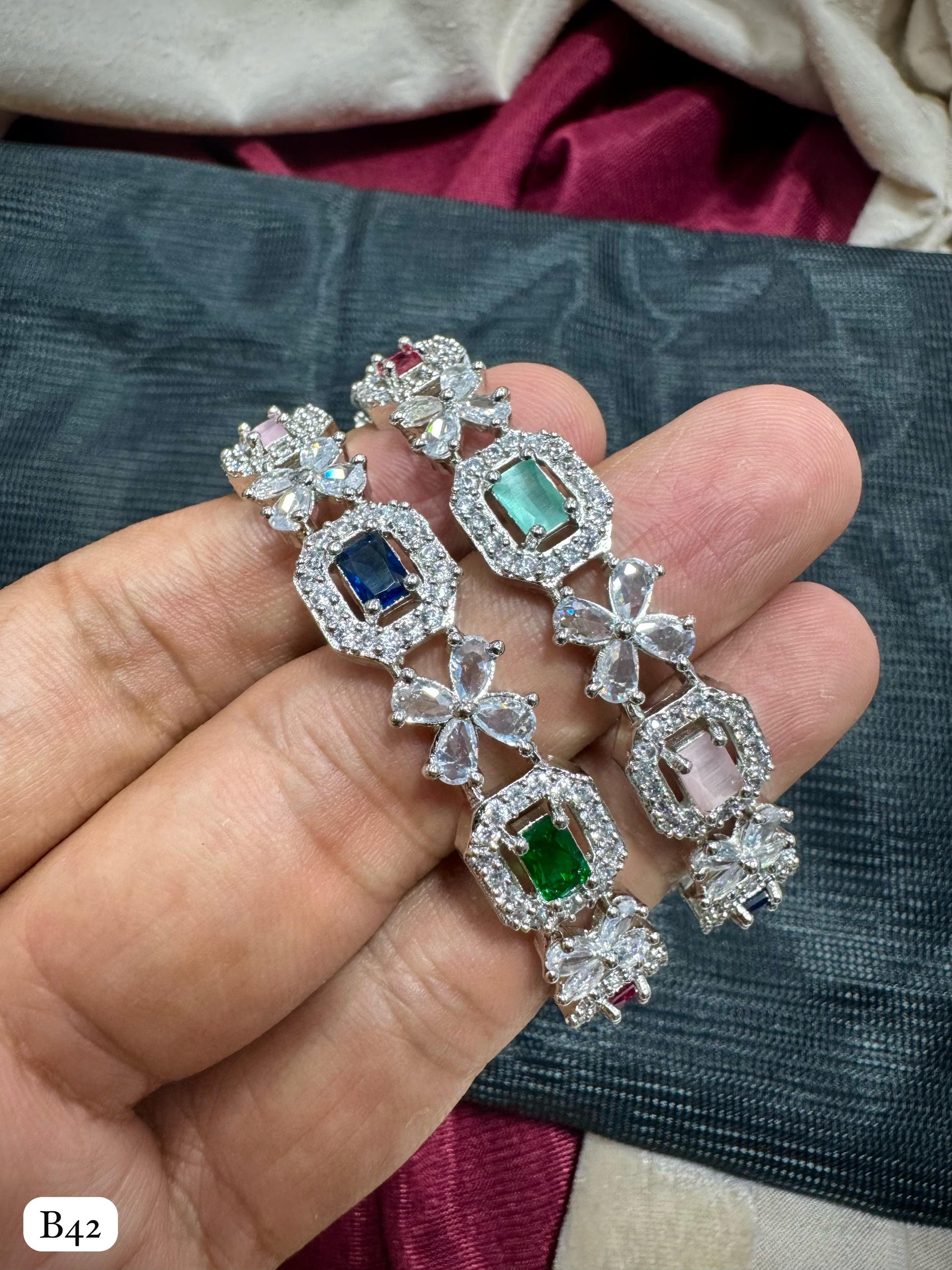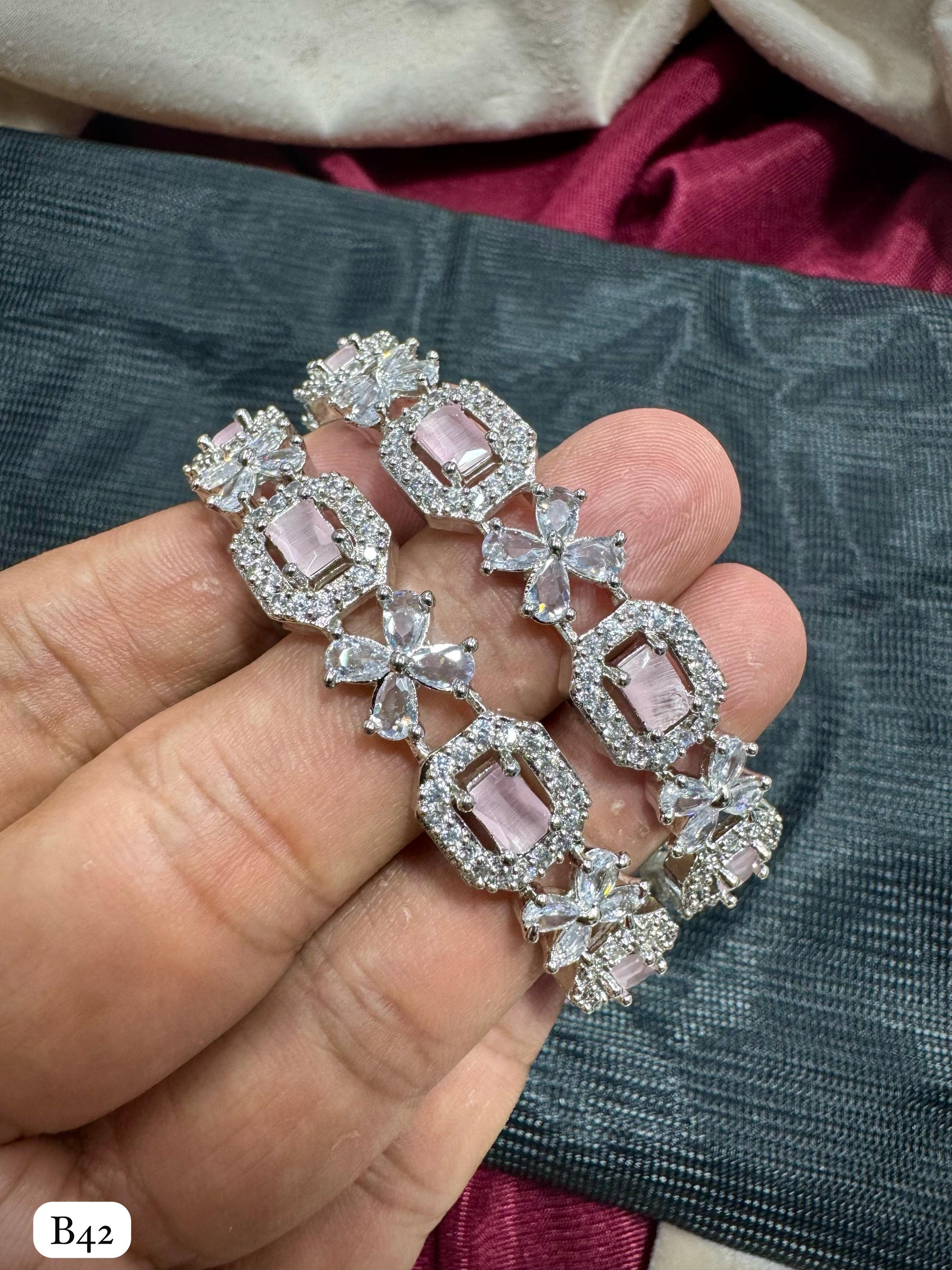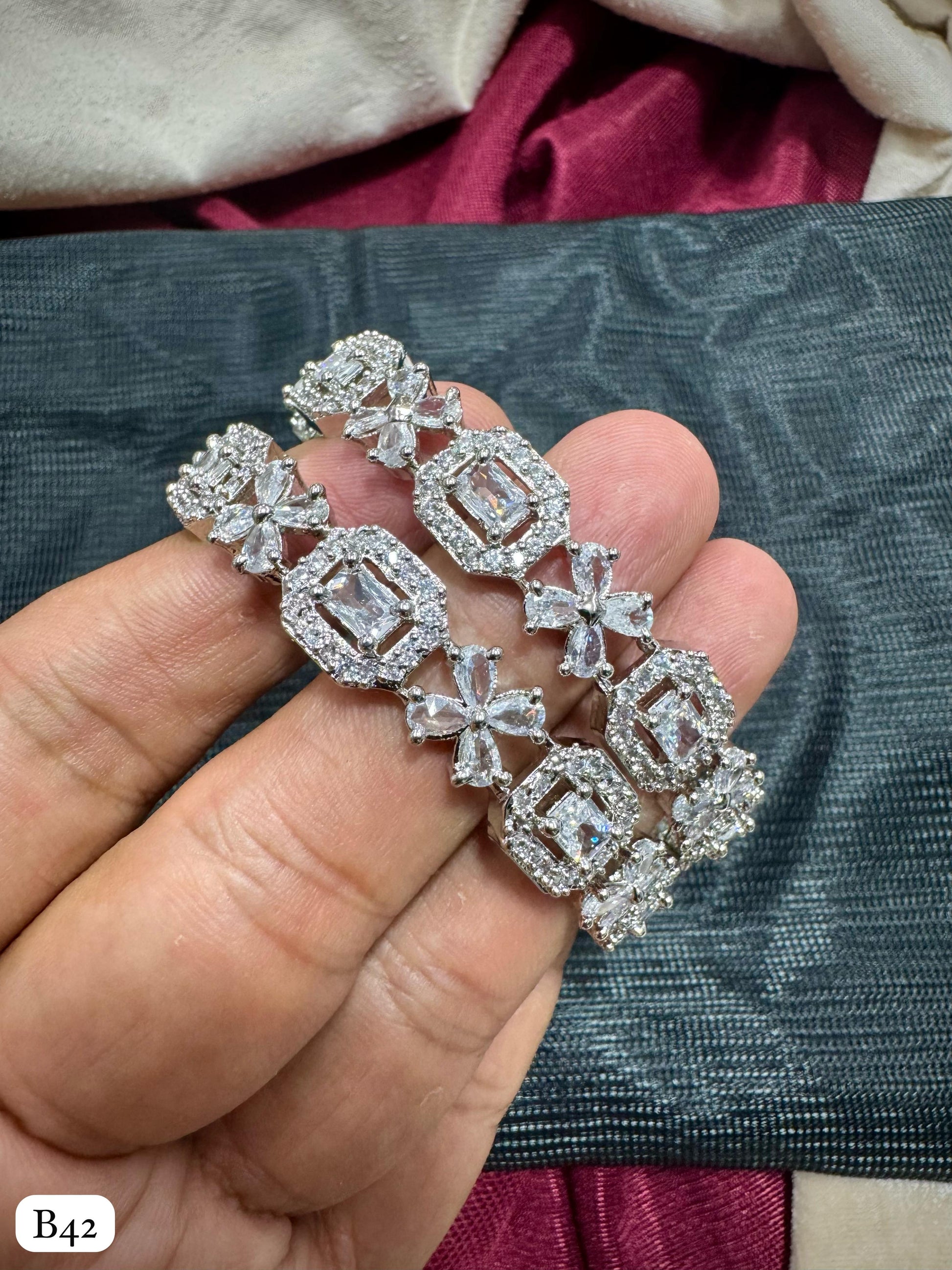 Enhance your jewelry collection with these American Diamond Silver Plated Bangles. These bangles feature the perfect blend of American diamonds and silver plating, adding an elegant touch to any outfit. Crafted with high-quality materials, these bangles are the perfect accessory for any occasion.