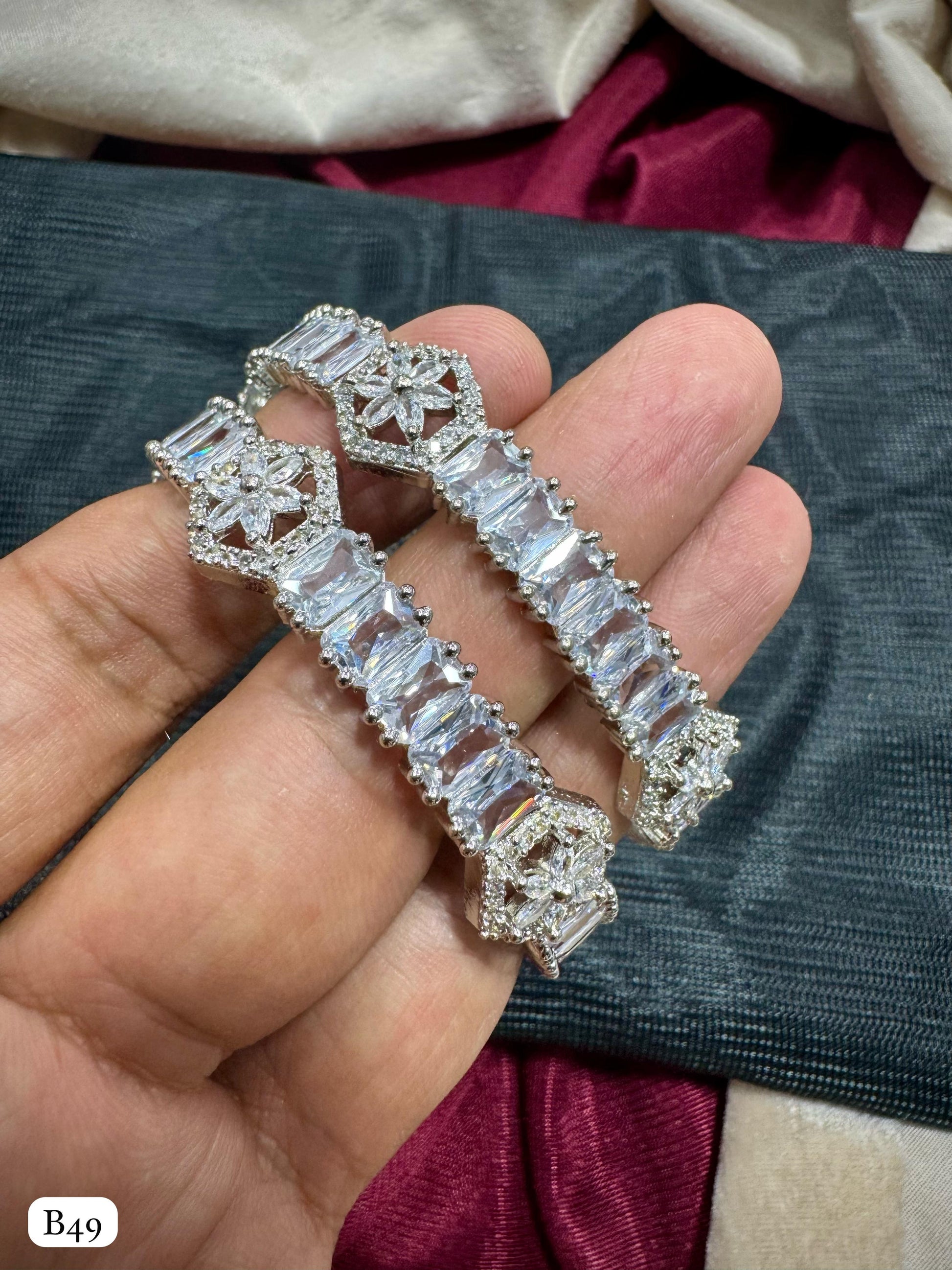 These bangles are made with American diamonds for a beautiful, sparkling look. Crafted with a silver-plated finish, they are both elegant and durable. Perfect for any occasion, these bangles will effortlessly elevate any outfit with their timeless design and lasting quality.