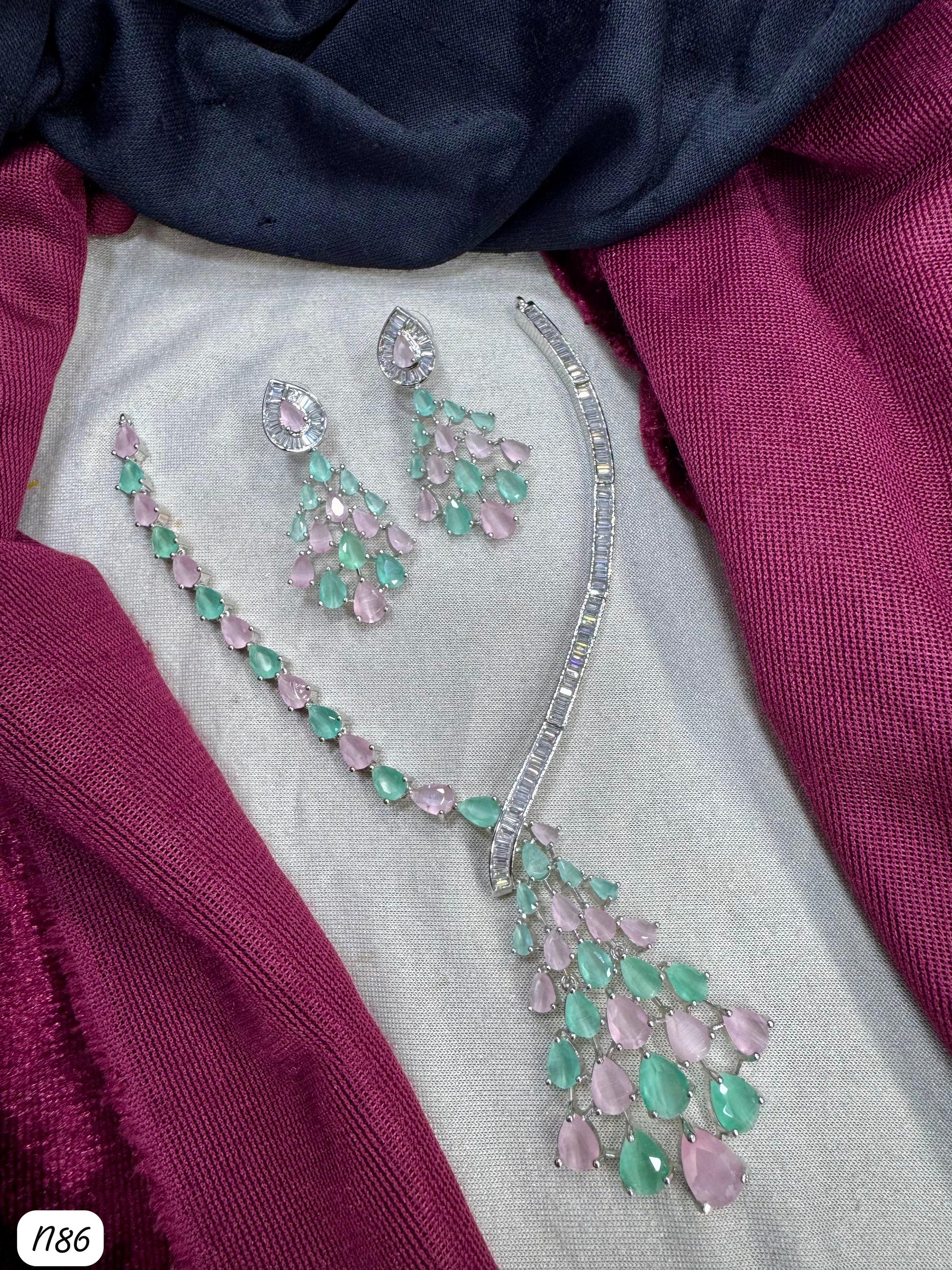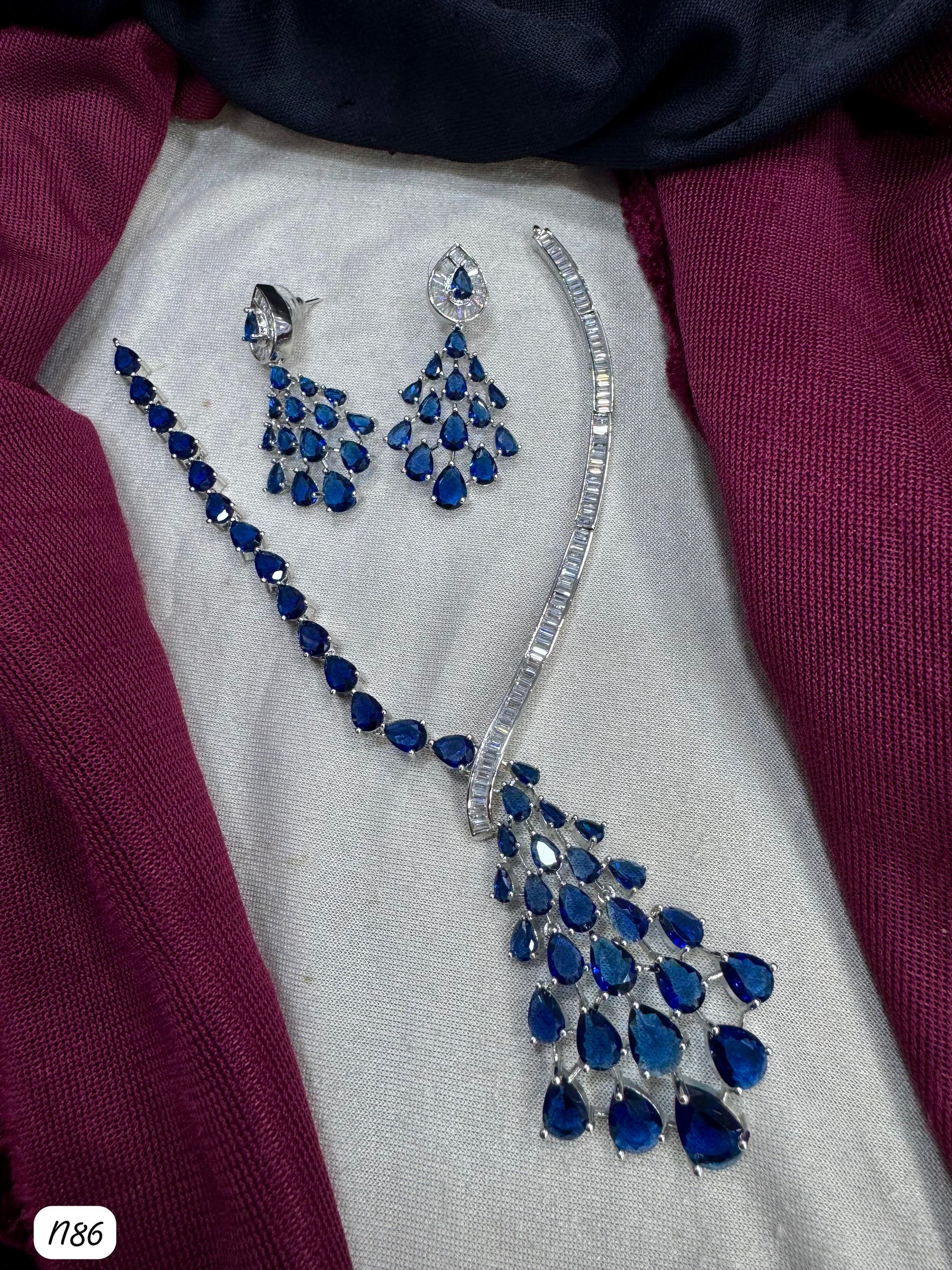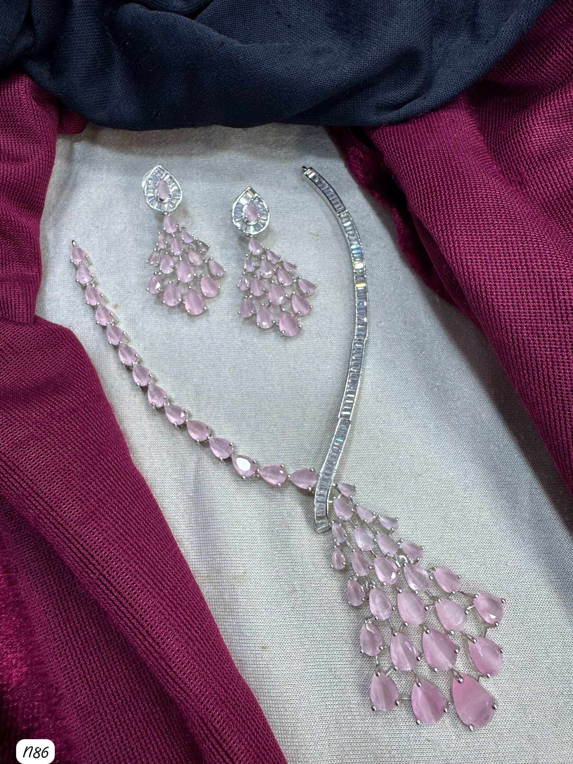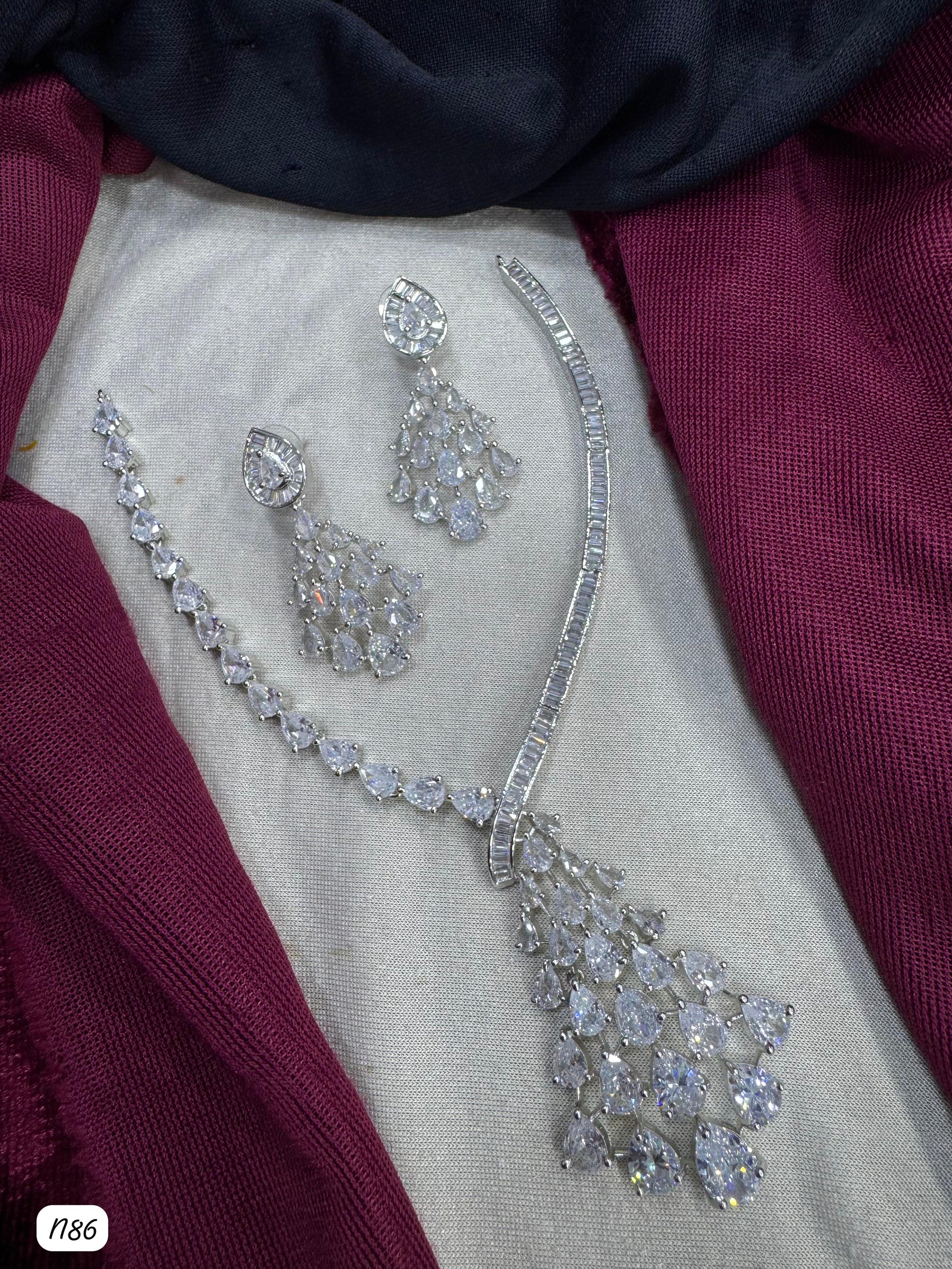 This necklace set features American diamonds elegantly set on a silver-plated base, combining timeless beauty with expert craftsmanship.