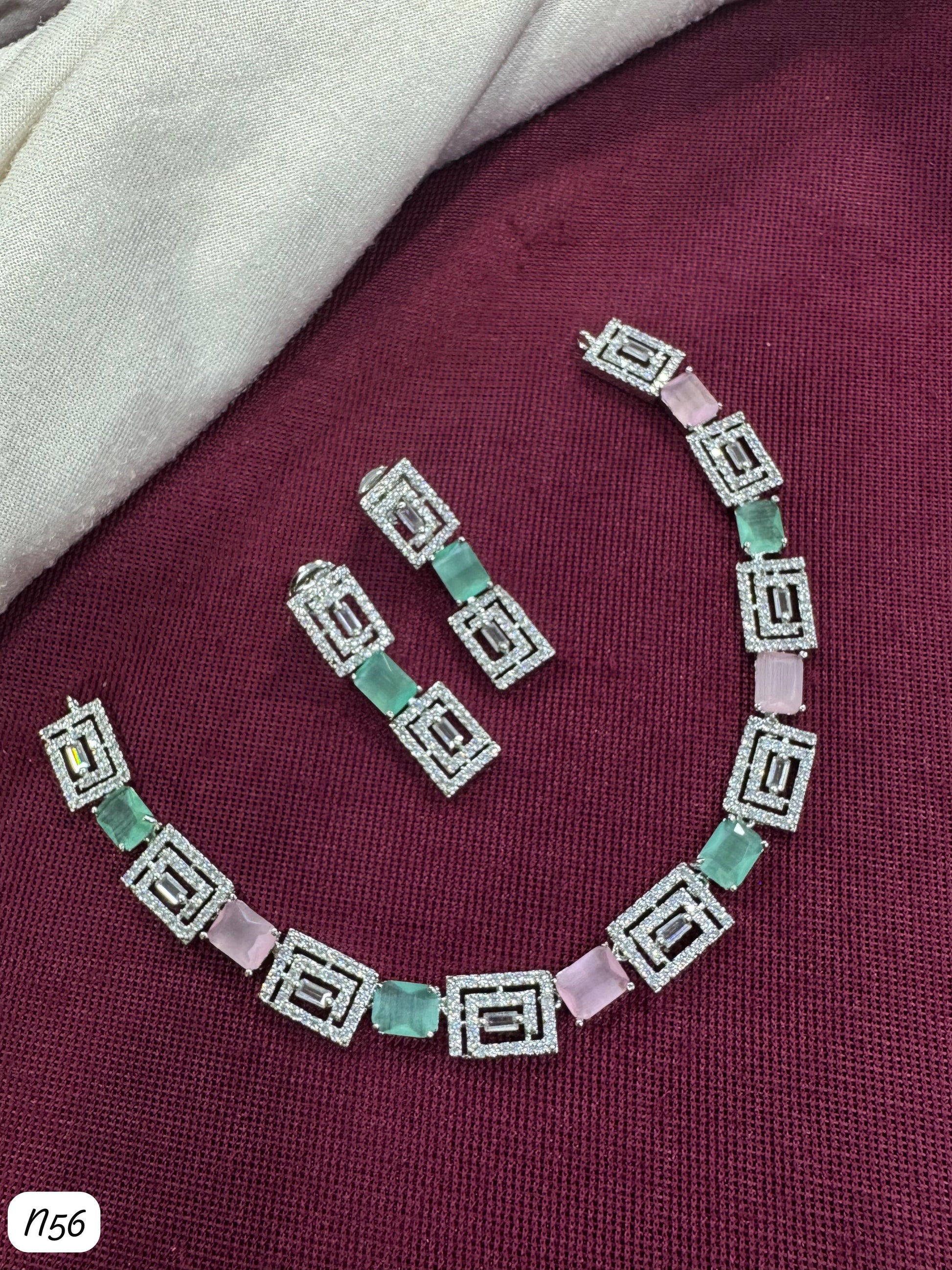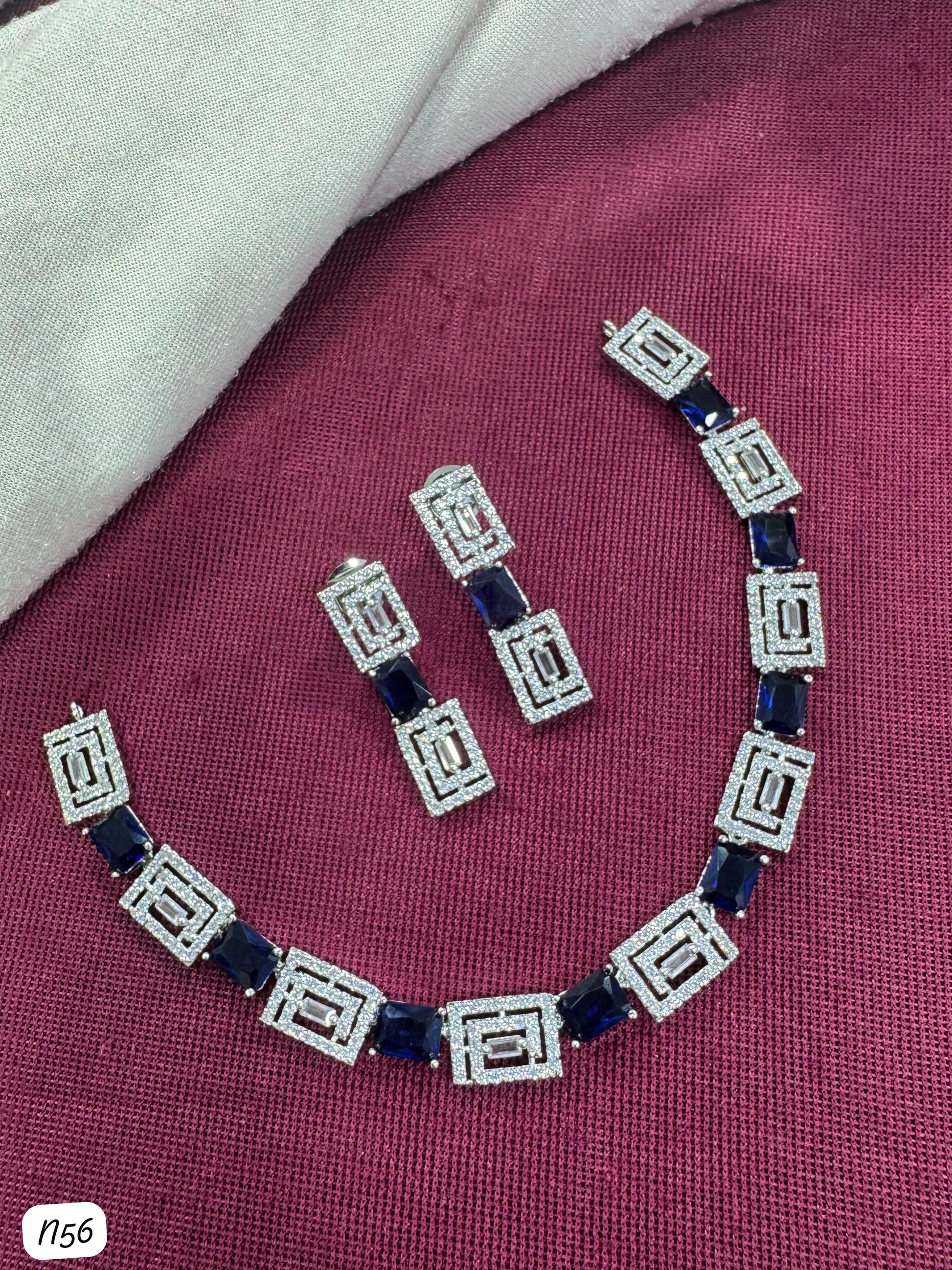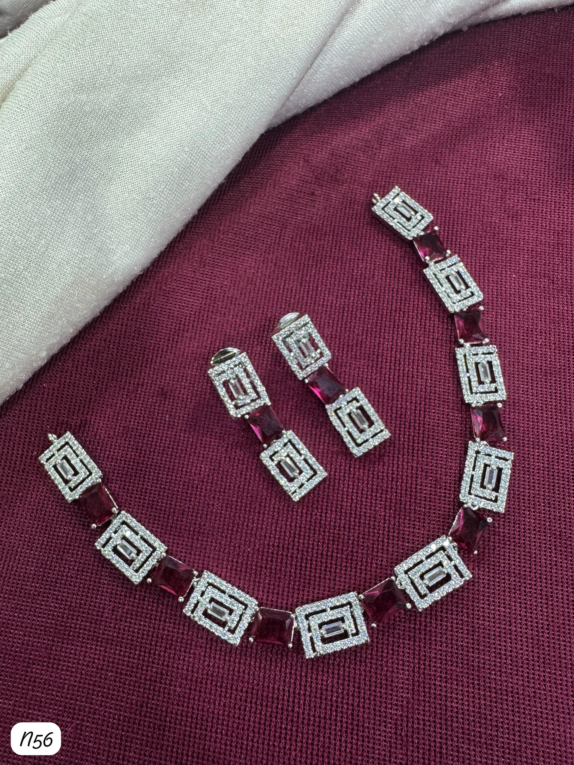 This elegant necklace and earrings set features a stunning geometric design adorned with sparkling stones. Perfect for special occasions or adding a touch of sophistication to your everyday look, this set combines modern style with timeless charm. The intricate craftsmanship ensures a comfortable fit while making a bold statement.