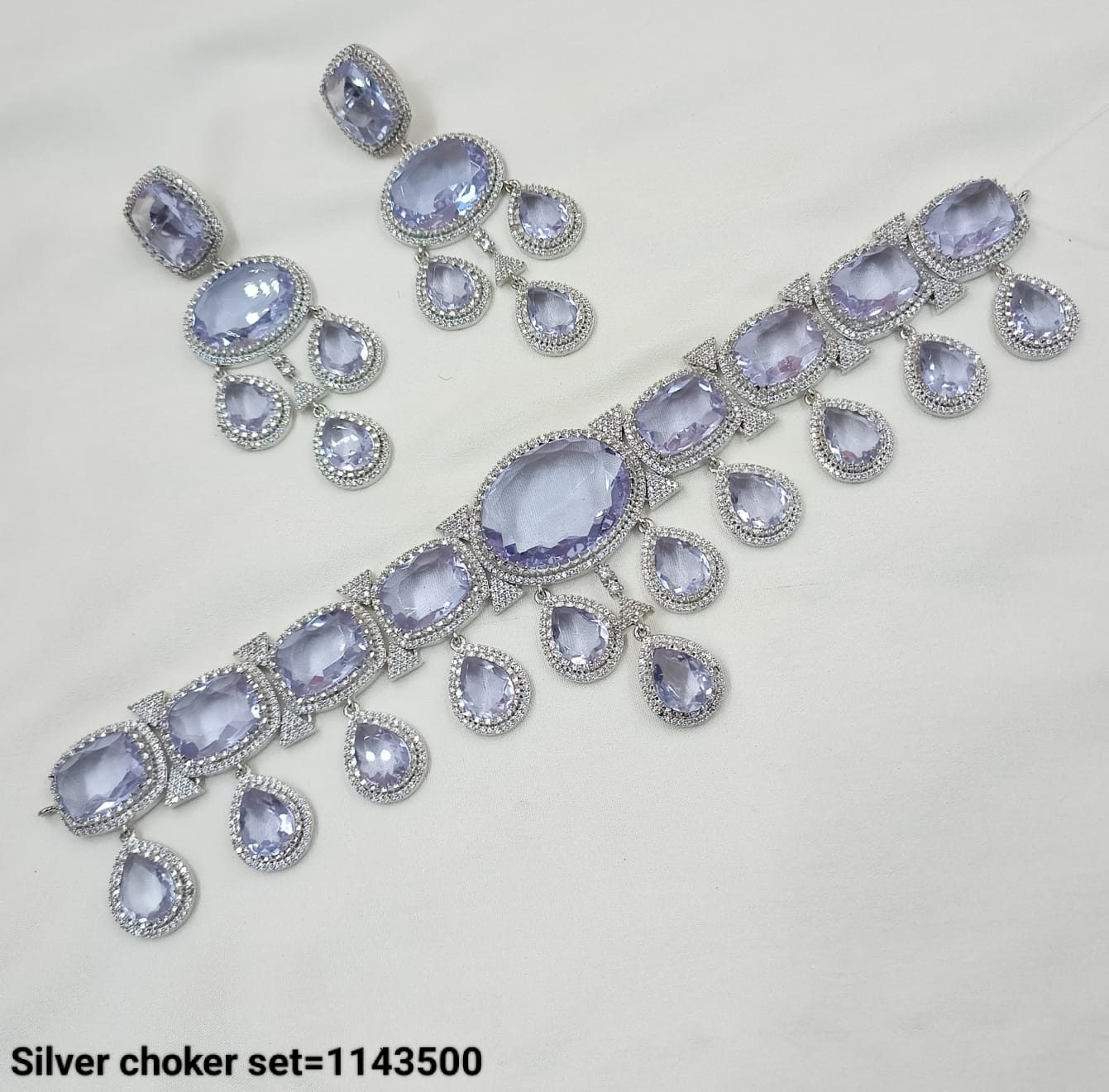 This exquisite necklace set features American diamonds meticulously set on a silver-plated base, combining elegance with lasting shine for a sophisticated accessory.