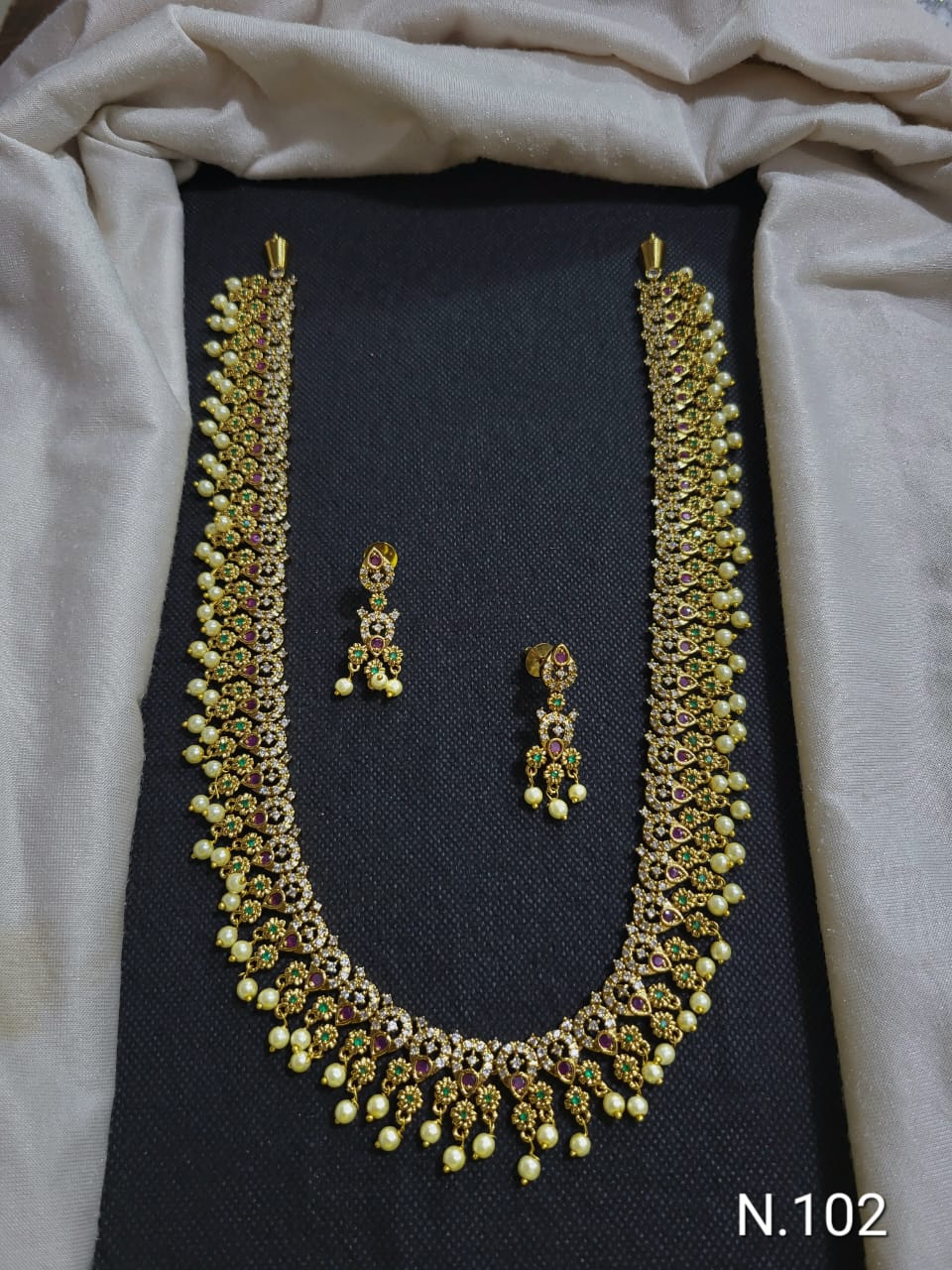 Elevate your traditional collection with this elegant necklace and earrings set featuring intricate craftsmanship and delicate pearl detailing. Perfect for festive occasions and cultural celebrations, this set adds a timeless charm and sophistication to any outfit.