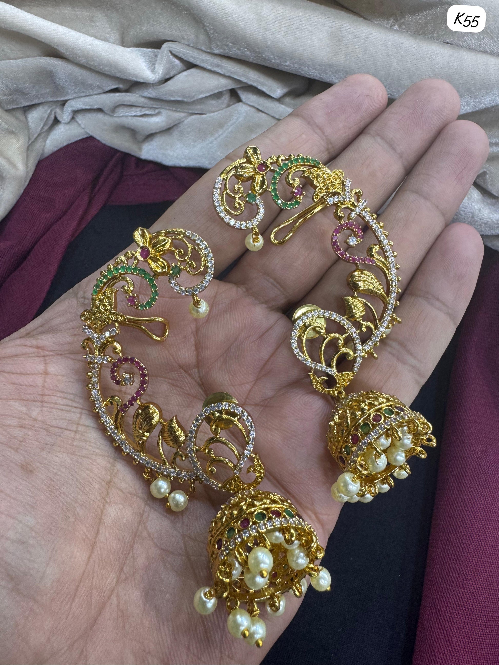 This American Diamond Traditional Gold Plated Earcuff for women offers a refined blend of classic design and modern elegance. Featuring high-quality gold plating and sparkling American diamonds, it provides a luxurious look without requiring pierced ears. Perfect for enhancing traditional attire or adding a touch of sophistication to everyday wear, this earcuff is expertly crafted for comfort and style .Delicate leaf shapes with sparkling AD stones, perfect for a touch of understated elegance.