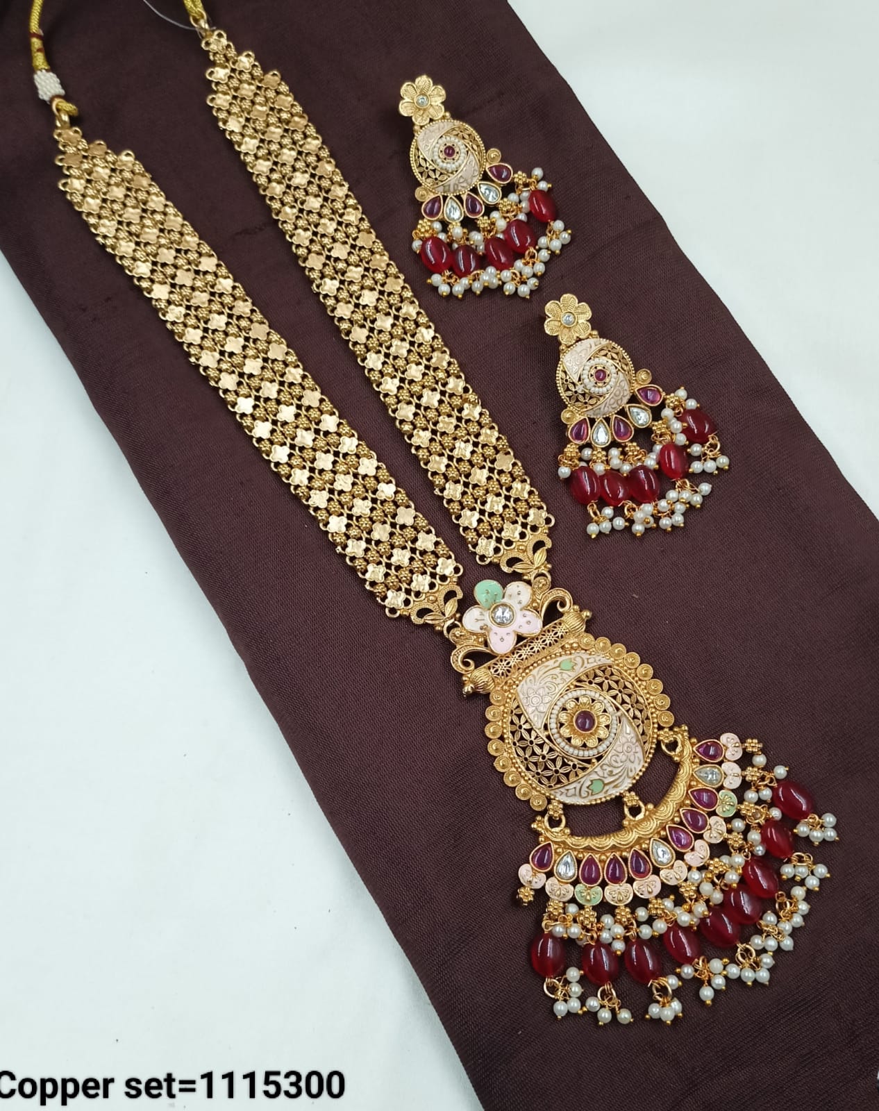 Make a regal impression with this traditional long necklace set from LucentEmarket, meticulously designed for weddings, festive wear, and cultural elegance. The set features a beautifully carved pendant with enamel accents, surrounded by layered stone drops and pearls. The dual-layered antique chain enhances the grand look, while the matching jhumka-style earrings complete the ensemble with finesse.