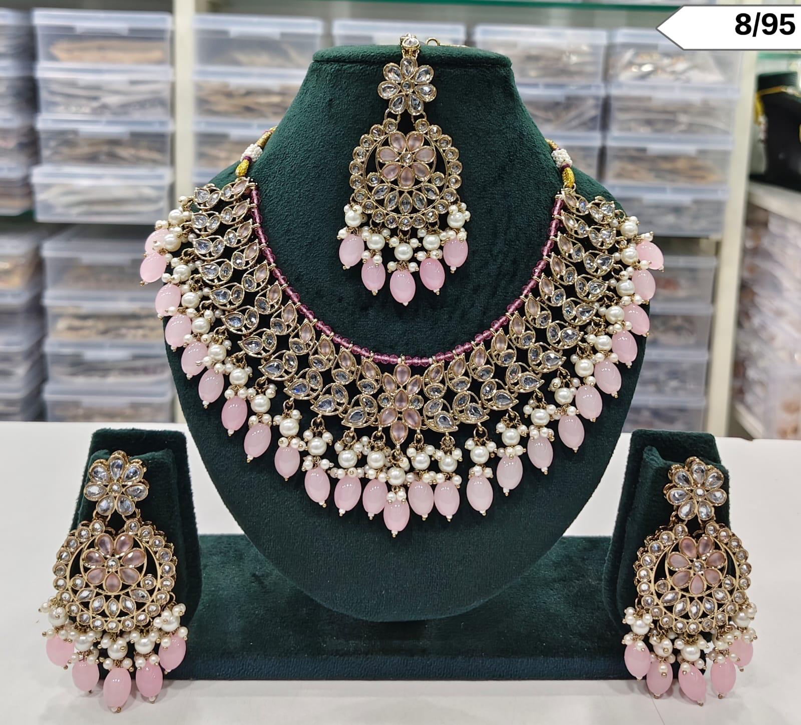 This set features a beautifully designed choker necklace studded with sparkling cubic zirconia stones, delicate floral motifs, and bead drops. Paired with matching earrings and a maang tikka, it creates a complete and graceful look for any special occasion. Perfect for weddings, receptions, engagements, and cultural celebrations, this choker set pairs wonderfully with sarees, lehengas, and traditional attire, making it an essential piece in every bridal jewellery collection.