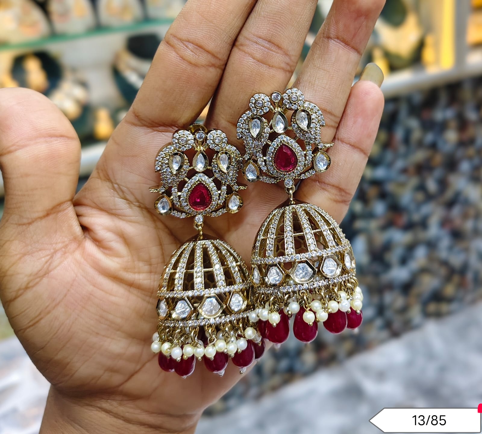 This exquisite jhumki set features an antique gold plating adorned with sparkling American diamonds, blending traditional craftsmanship with elegant design.
