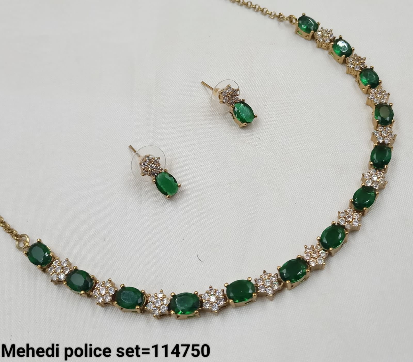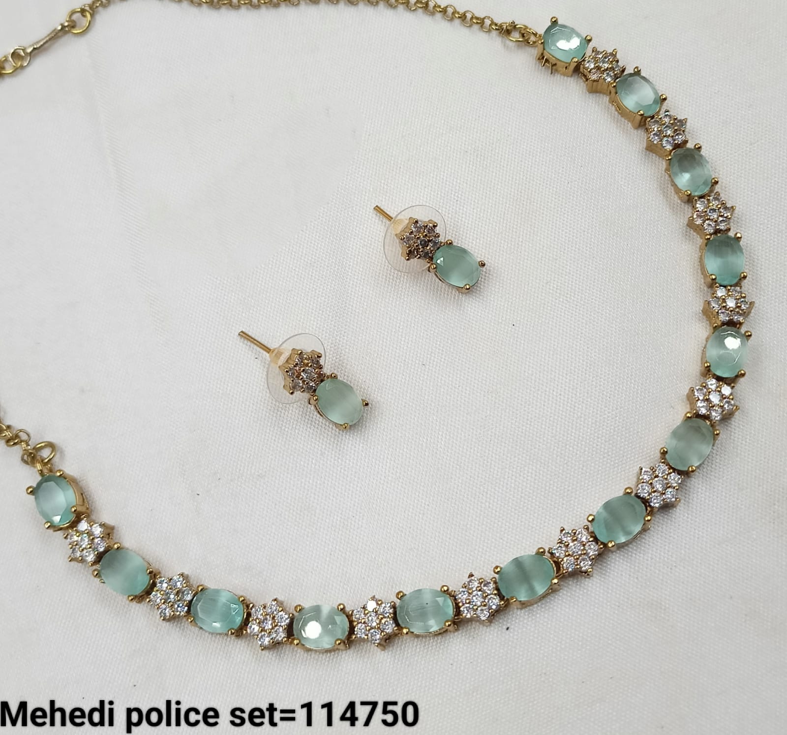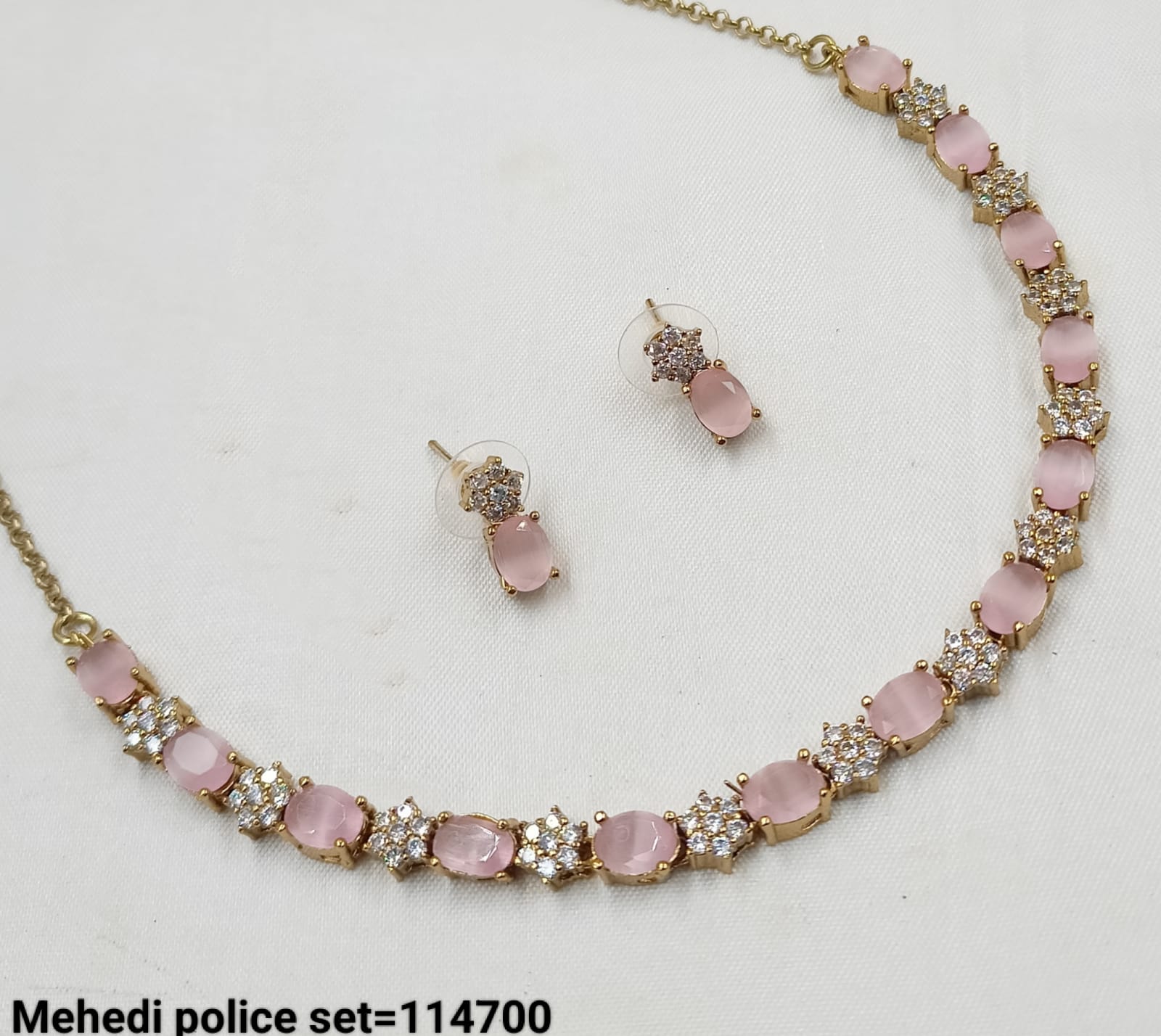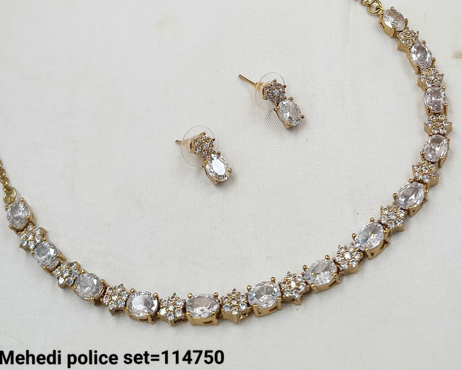 This exquisite necklace set features an antique gold plating adorned with sparkling American diamonds, combining timeless elegance with expert craftsmanship.