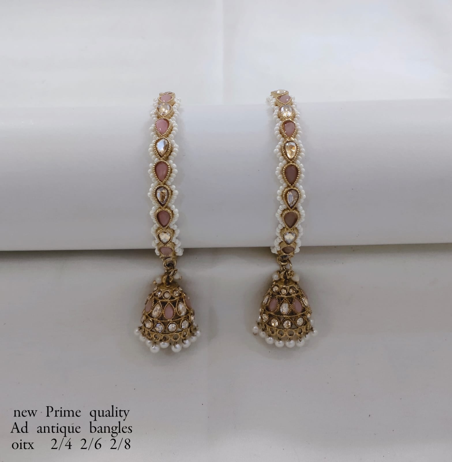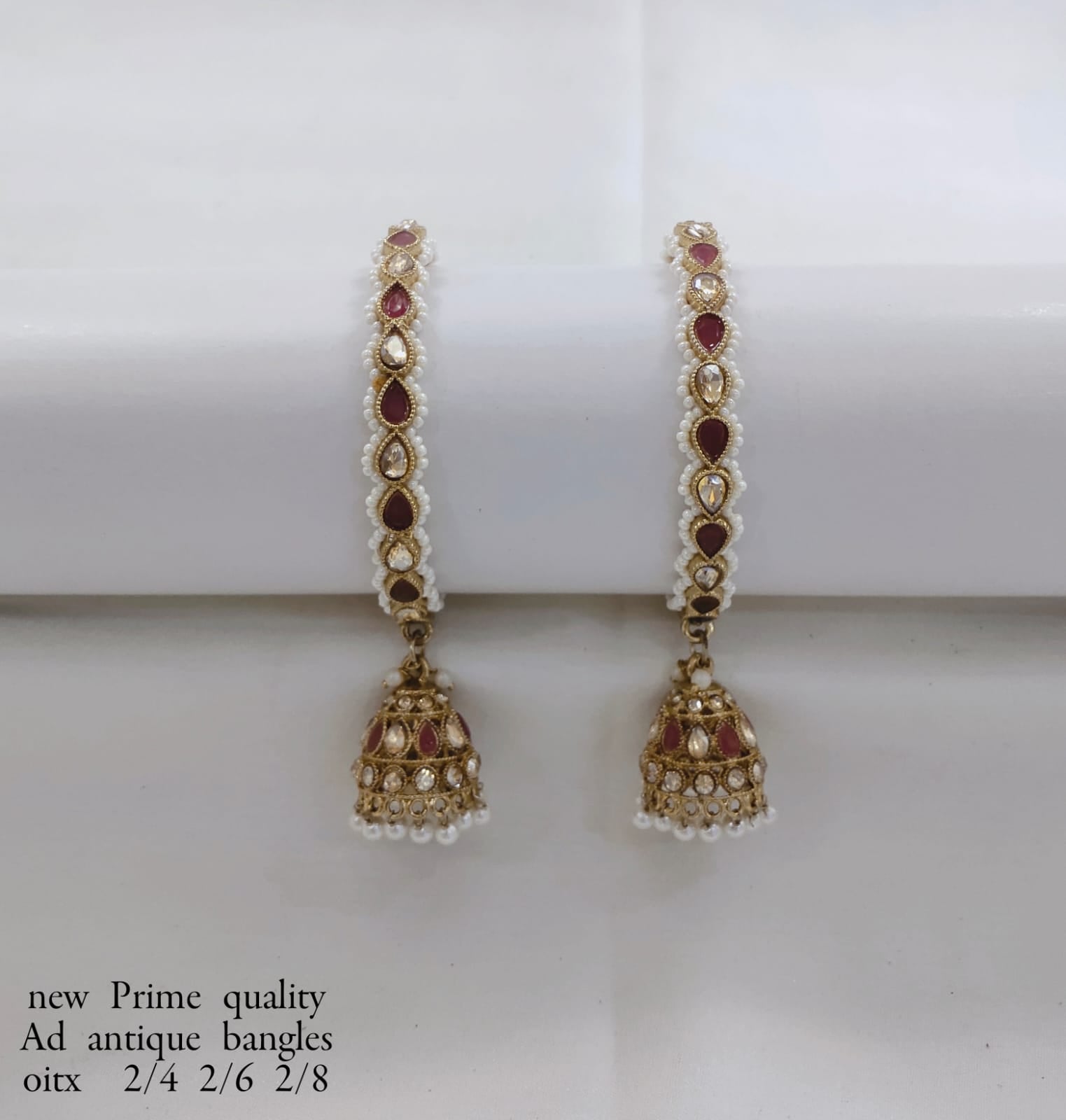 Add a regal touch to your ethnic ensemble with these exquisite Antique Gold-Plated Bangles featuring green and white AD stones, framed with delicate pearl beading. Designed in a traditional style with jhumka-style danglers, these bangles bring timeless elegance and festive charm to any outfit. Whether you're dressing for a wedding, festival, or special occasion, these bangles will make you stand out with their intricate craftsmanship and vintage appeal.