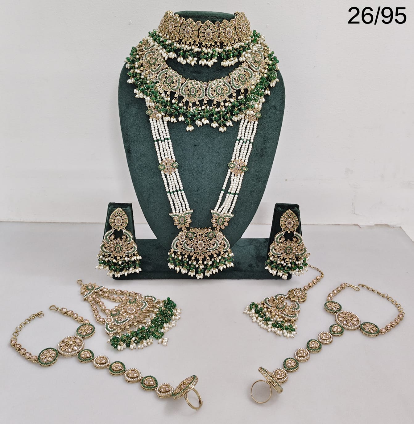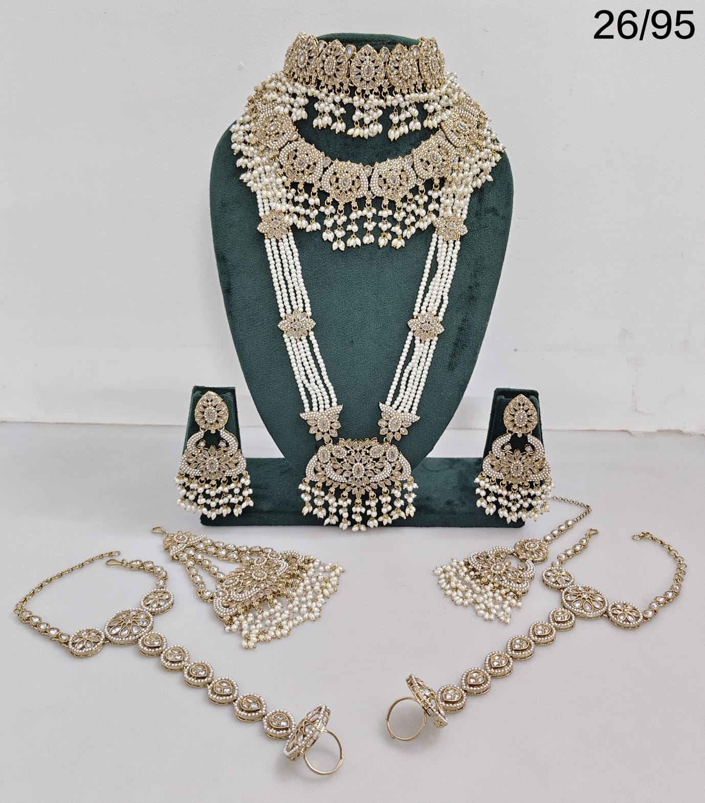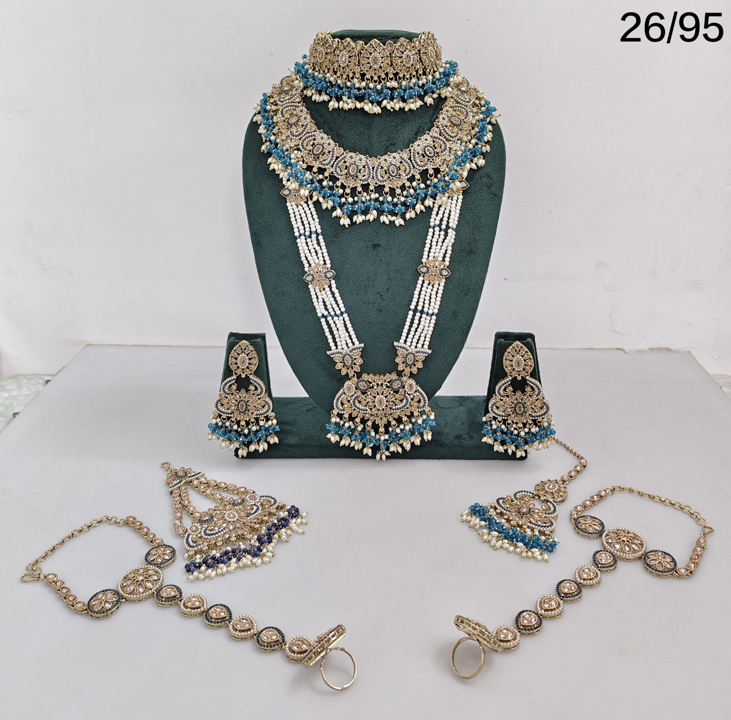Elevate your bridal look with this elegant jewelry set, crafted with intricate detailing and designed to make a statement. The set includes a 3-piece necklace, matching earrings, delicate hand harnesses, and a traditional pasha, all thoughtfully designed to enhance your wedding or special occasion ensemble. Lightweight yet stunning, this set balances classic charm with modern sophistication, making it perfect for brides who want to shine with timeless grace.