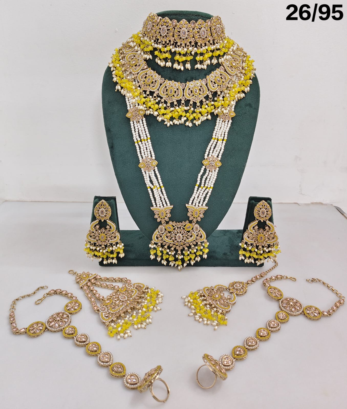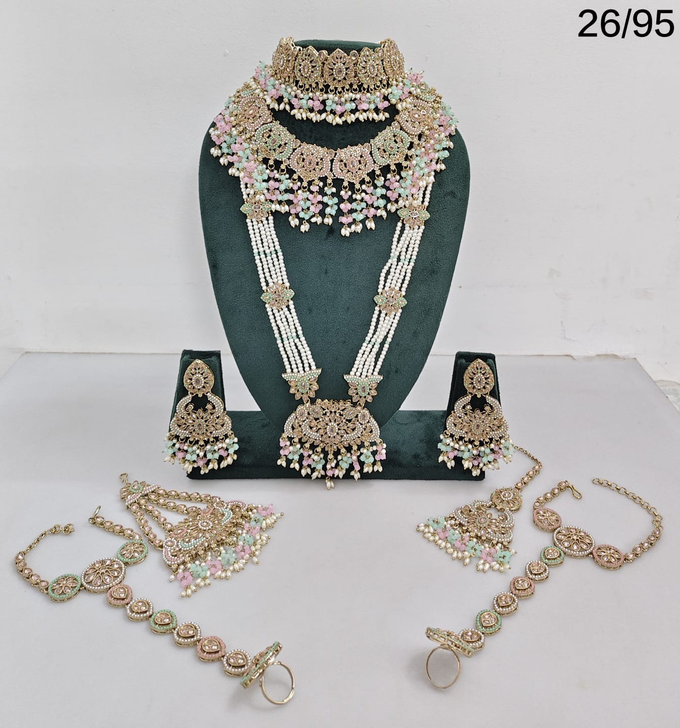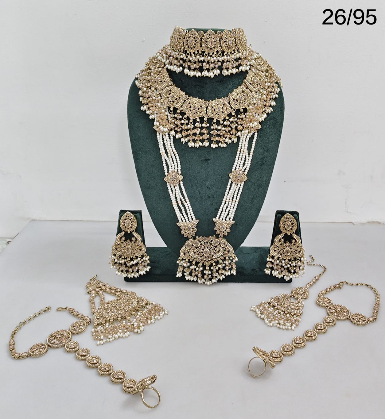 Elevate your bridal look with this elegant jewelry set, crafted with intricate detailing and designed to make a statement. The set includes a 3-piece necklace, matching earrings, delicate hand harnesses, and a traditional pasha, all thoughtfully designed to enhance your wedding or special occasion ensemble. Lightweight yet stunning, this set balances classic charm with modern sophistication, making it perfect for brides who want to shine with timeless grace.