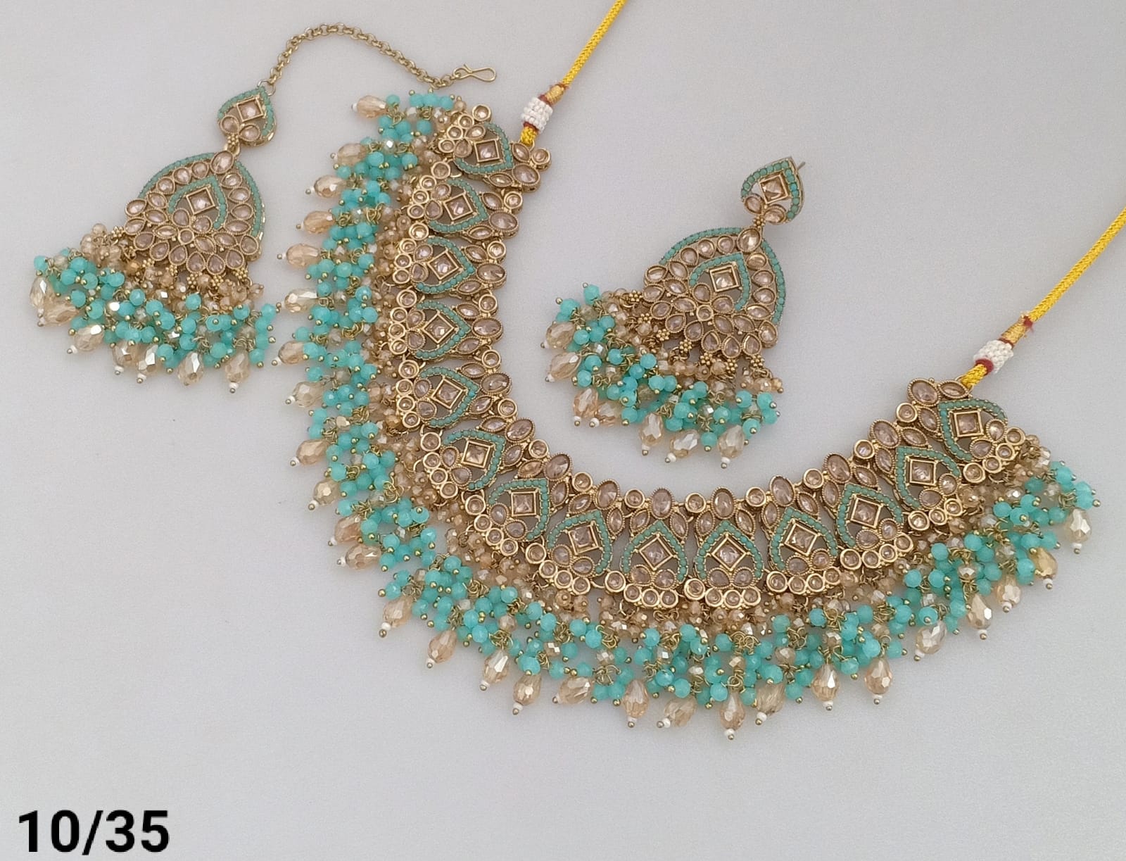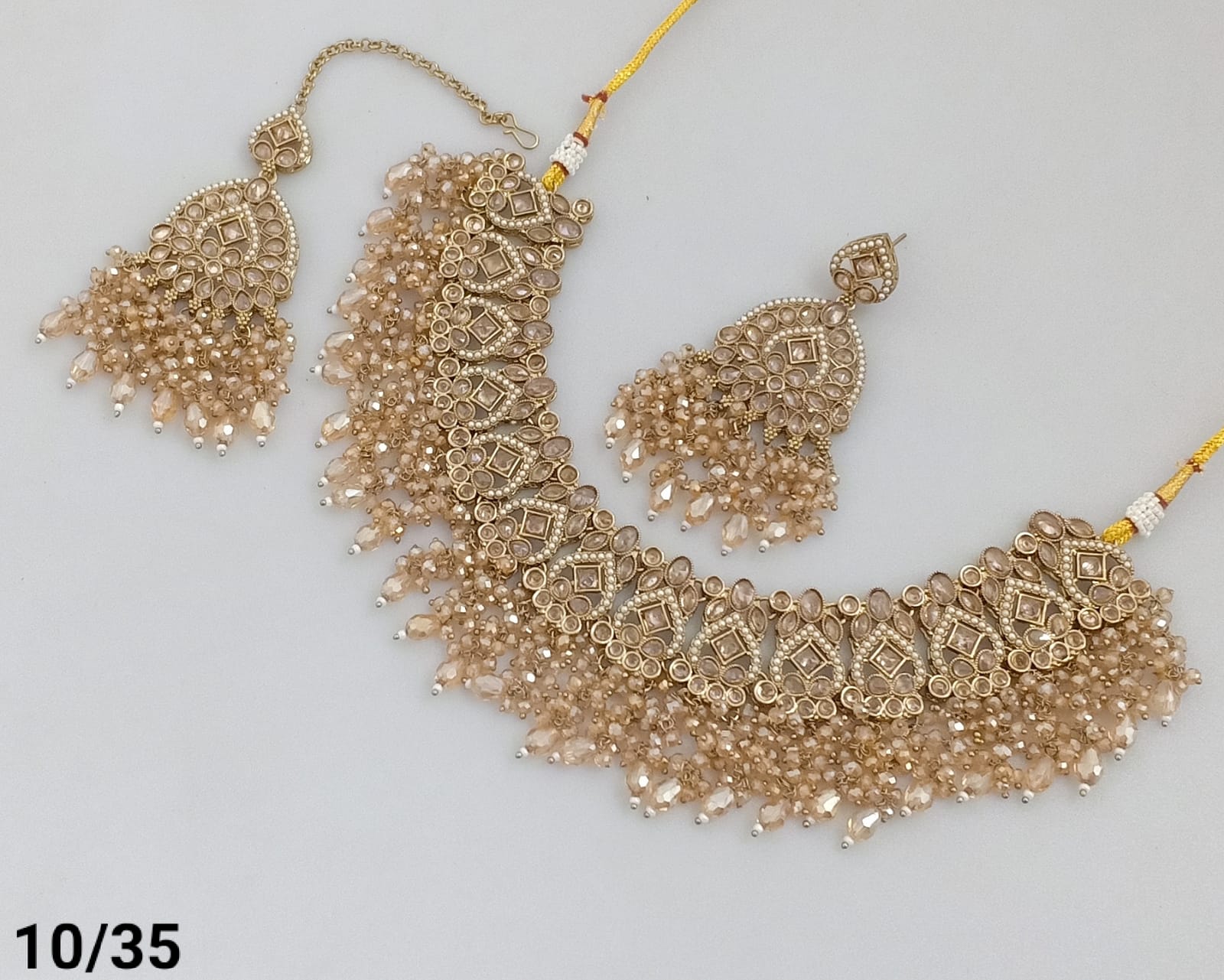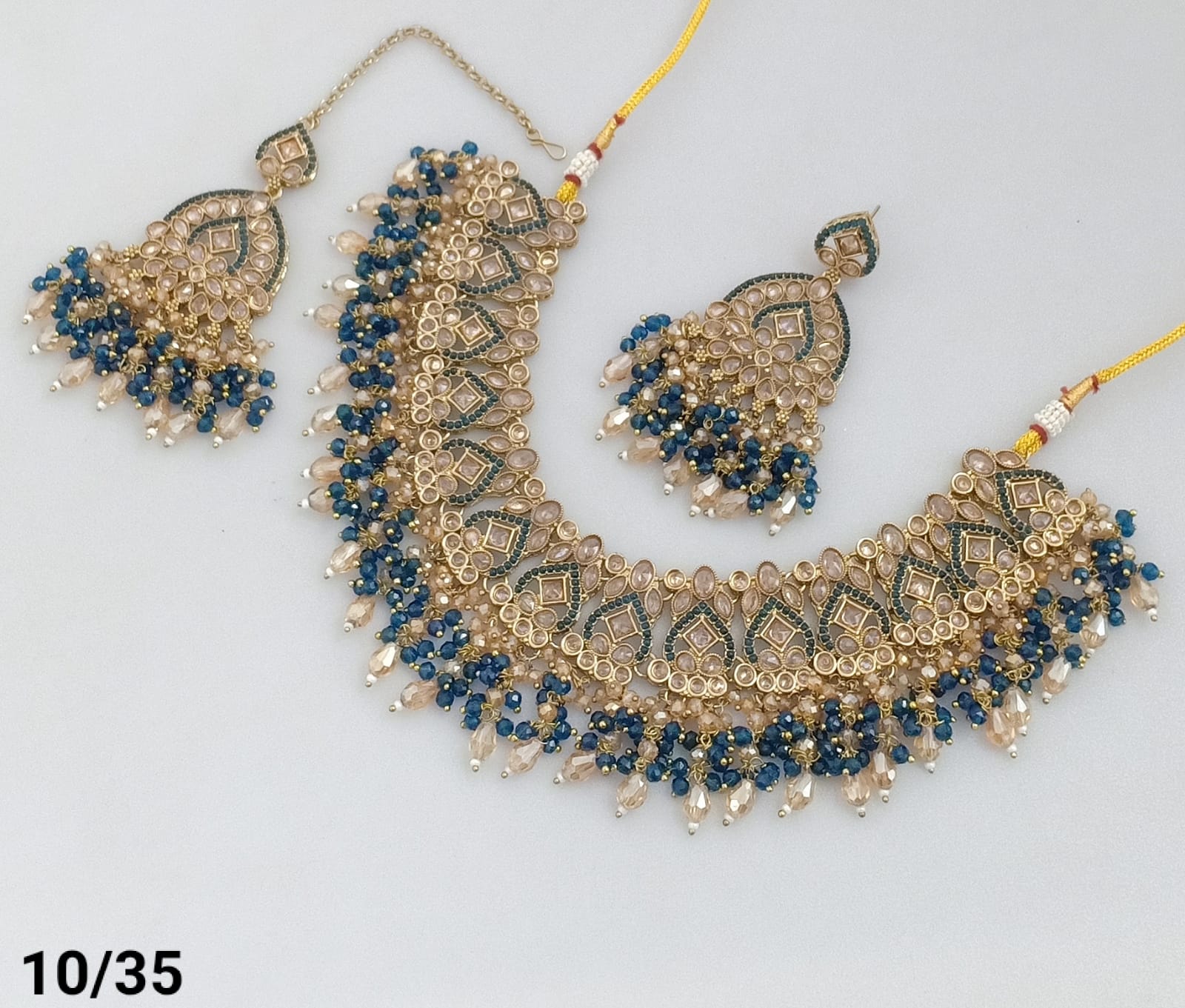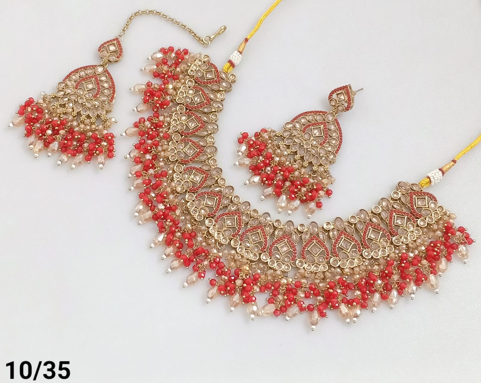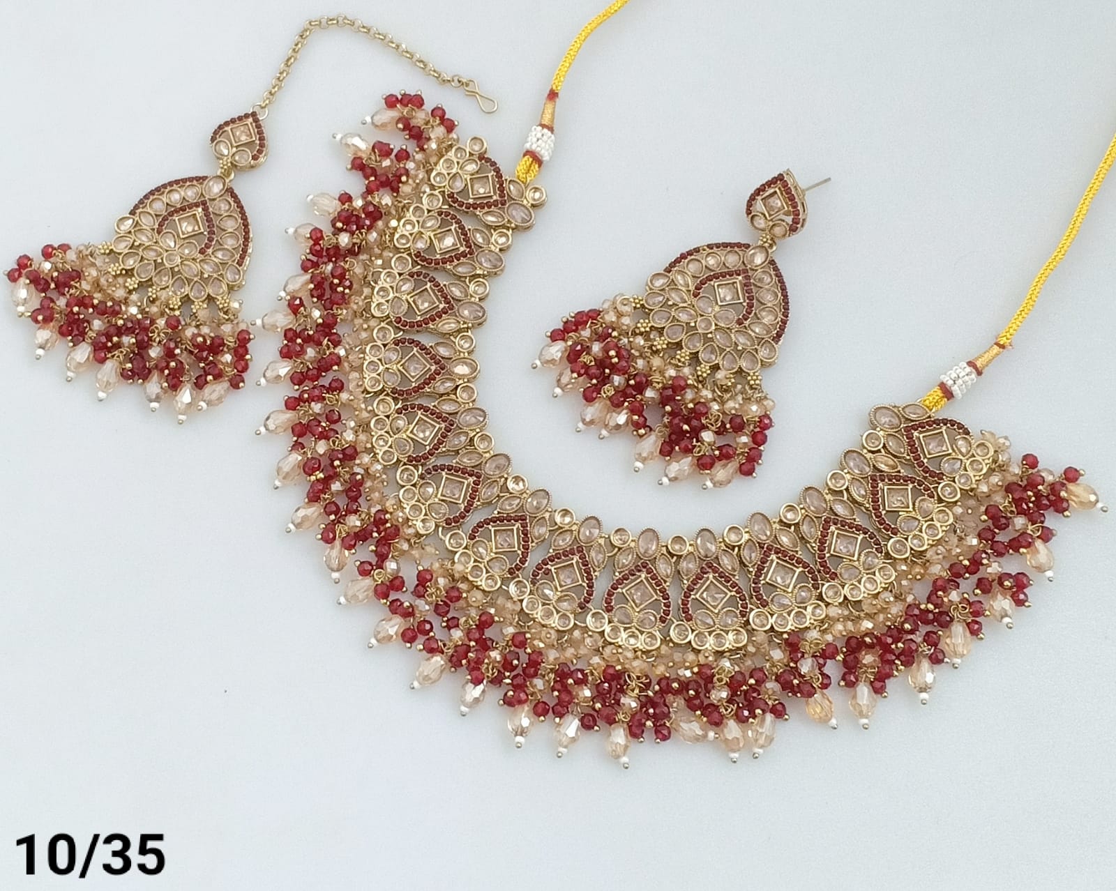 Features exquisite pearls and beads, blending classic elegance with intricate craftsmanship. The gold plating offers a rich, vintage look, Ideal for enhancing traditional and formal ensembles, this set delivers a refined statement with expert detailing.