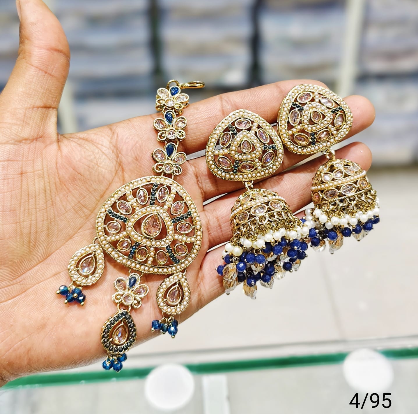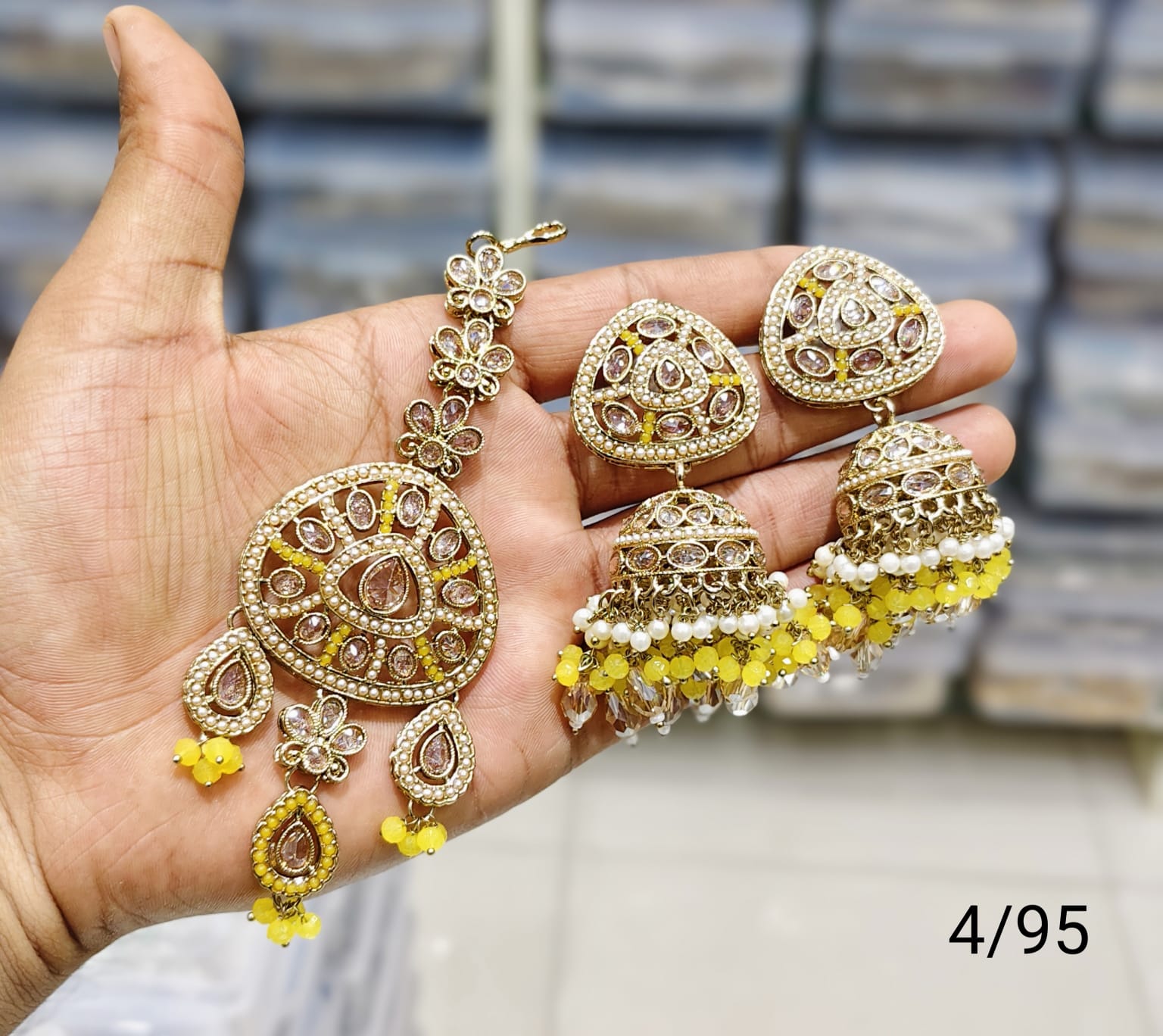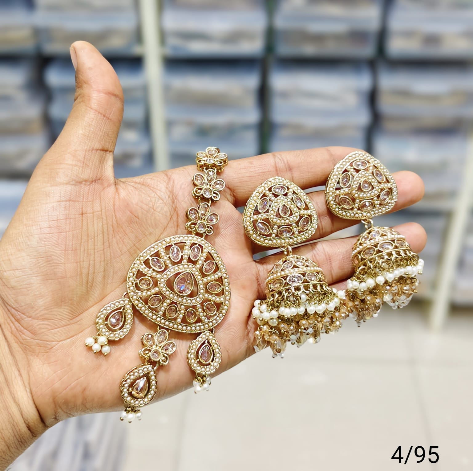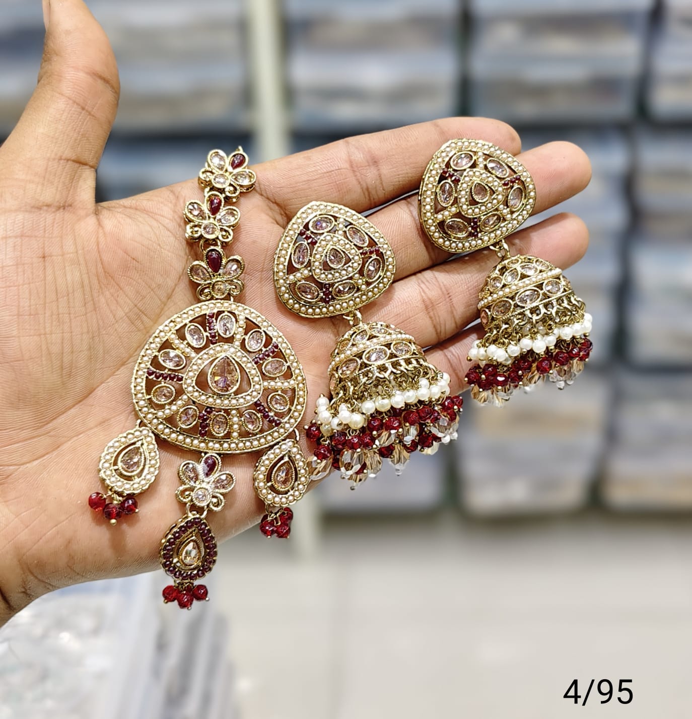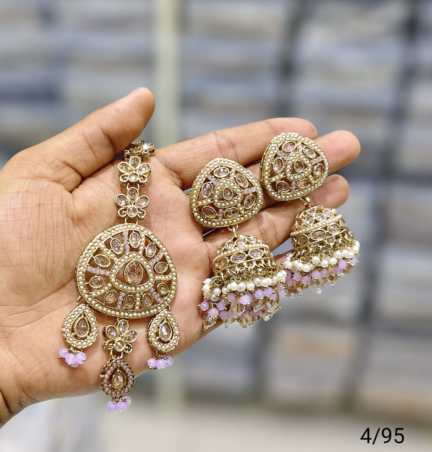 This set features antique-style earrings and a mangtika, beautifully finished with gold plating to enhance traditional elegance.