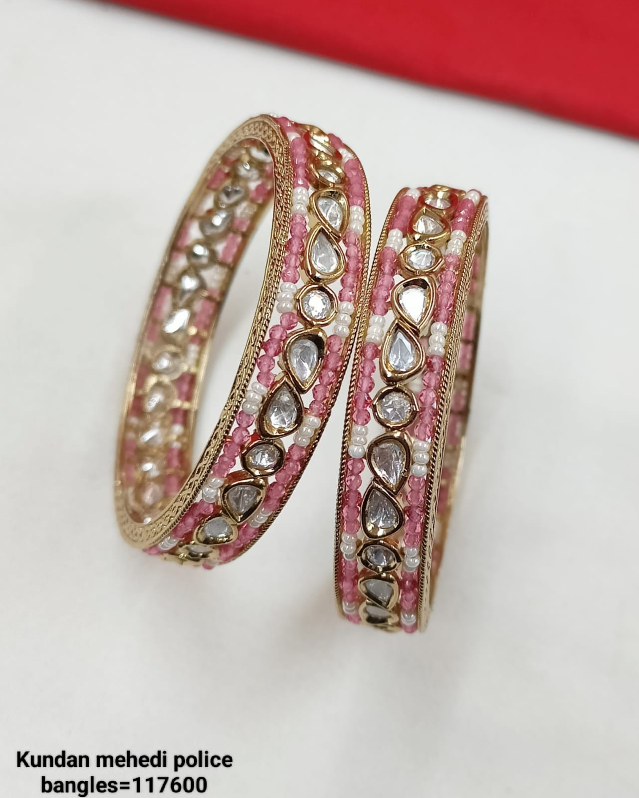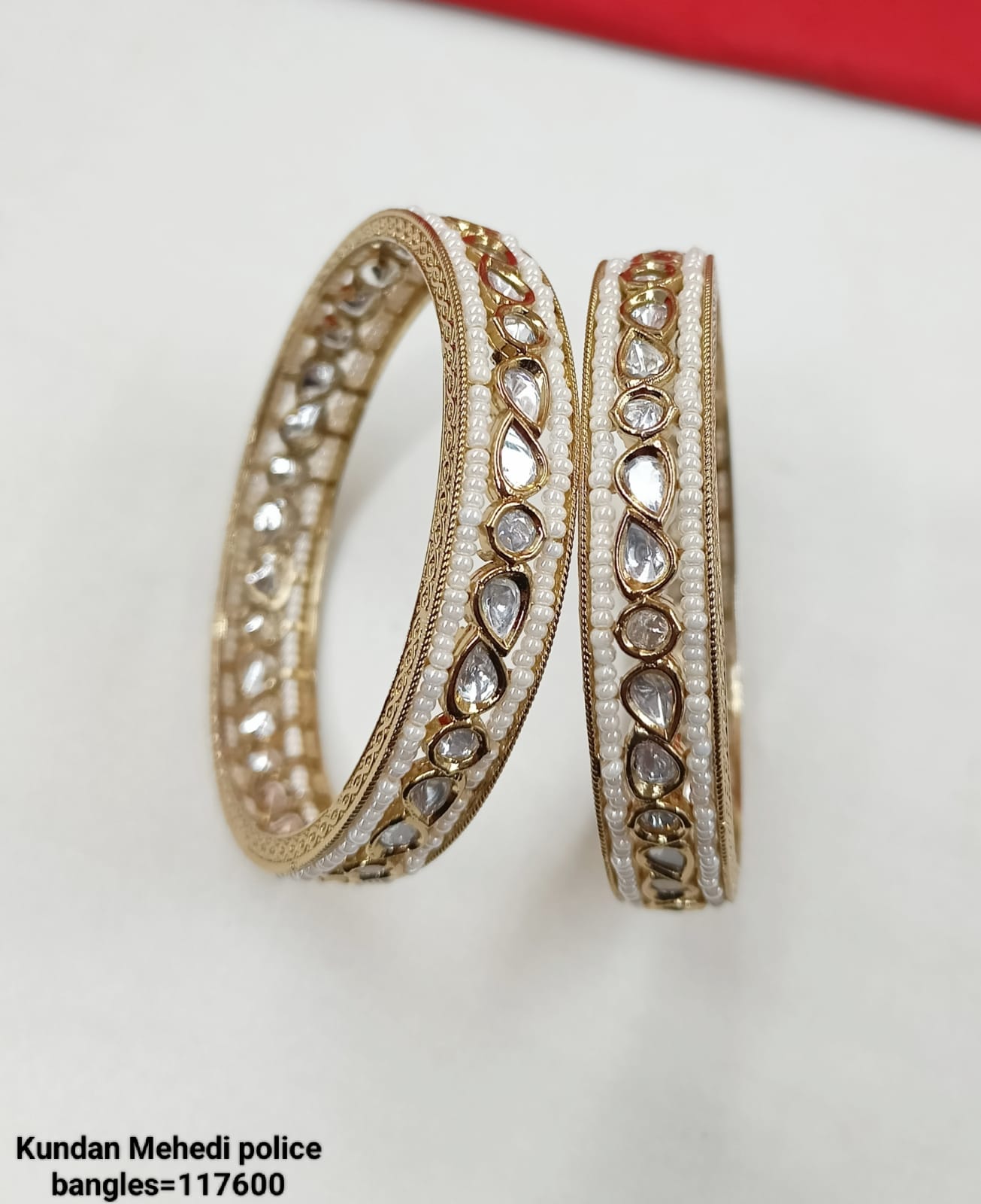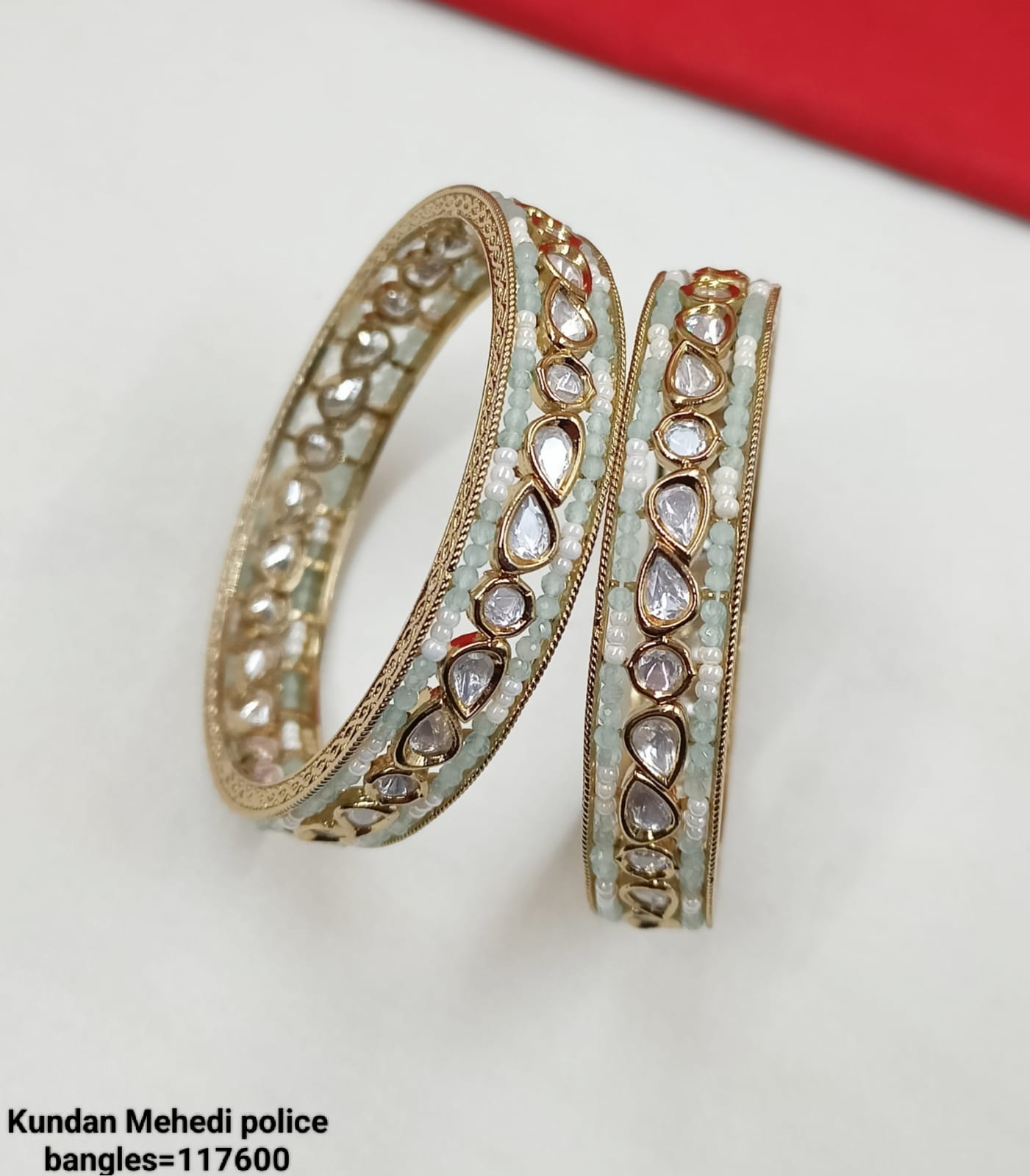 This set features bangles plated in antique gold, adorned with traditional Kundan craftsmanship, offering a timeless and elegant accessory choice.