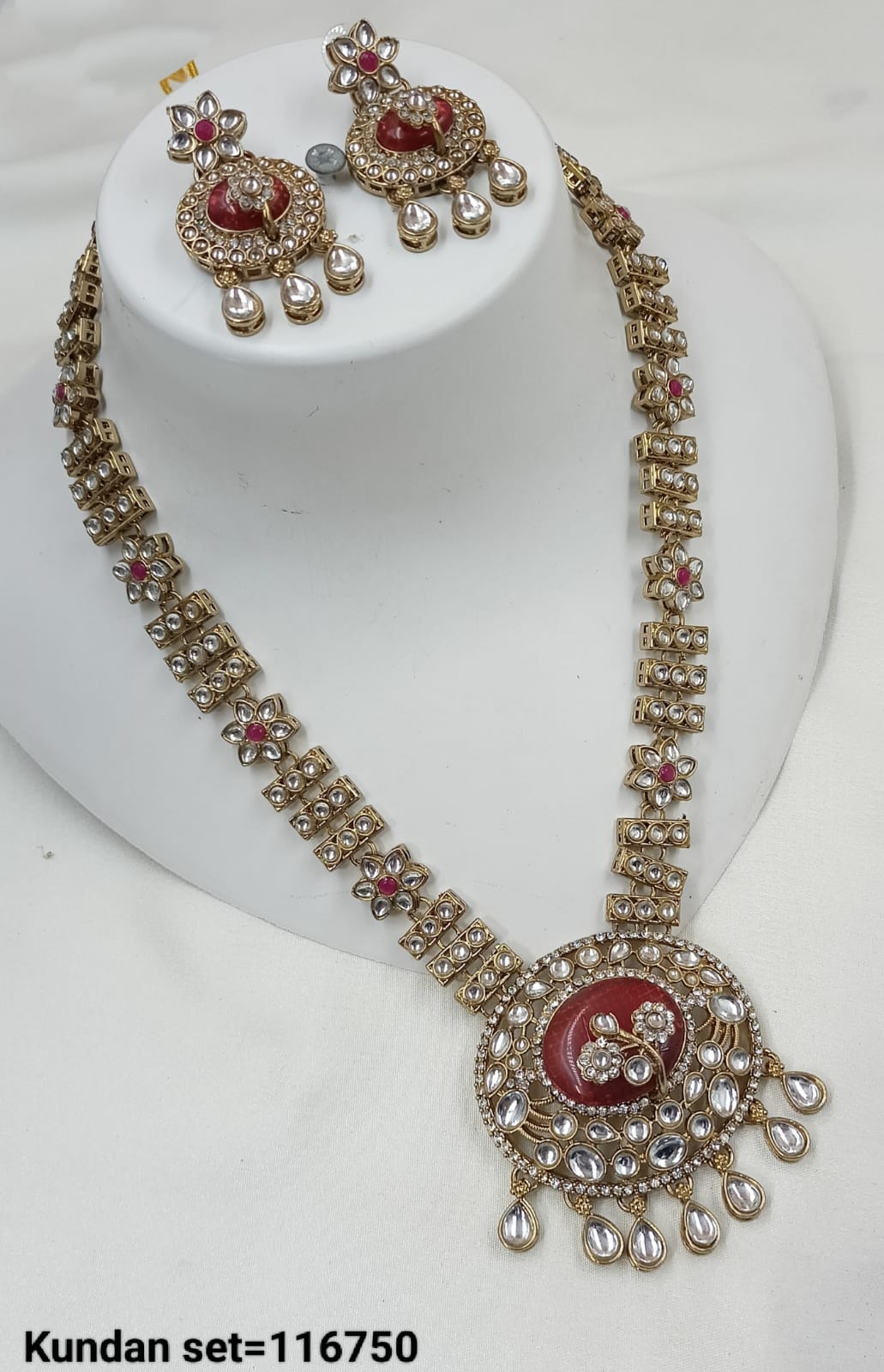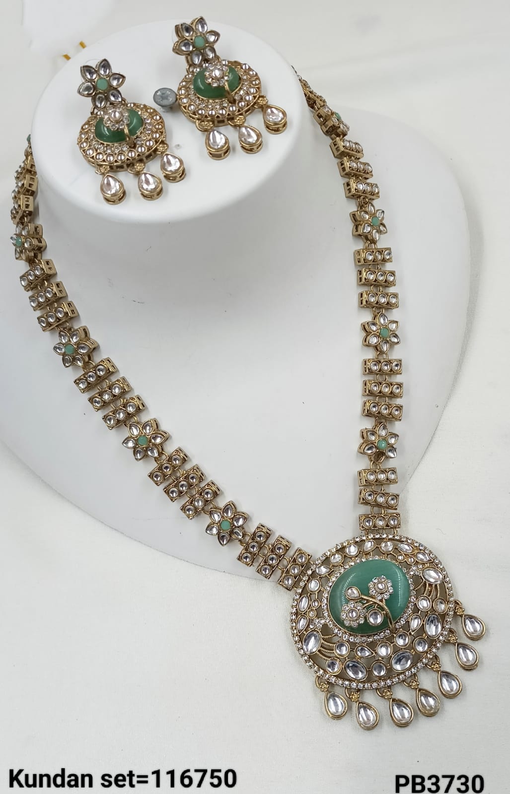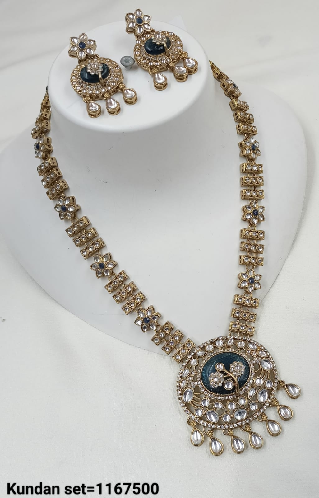 This exquisite necklace set features an antique gold plating combined with traditional Kundan craftsmanship, offering a timeless and elegant accessory for special occasions.