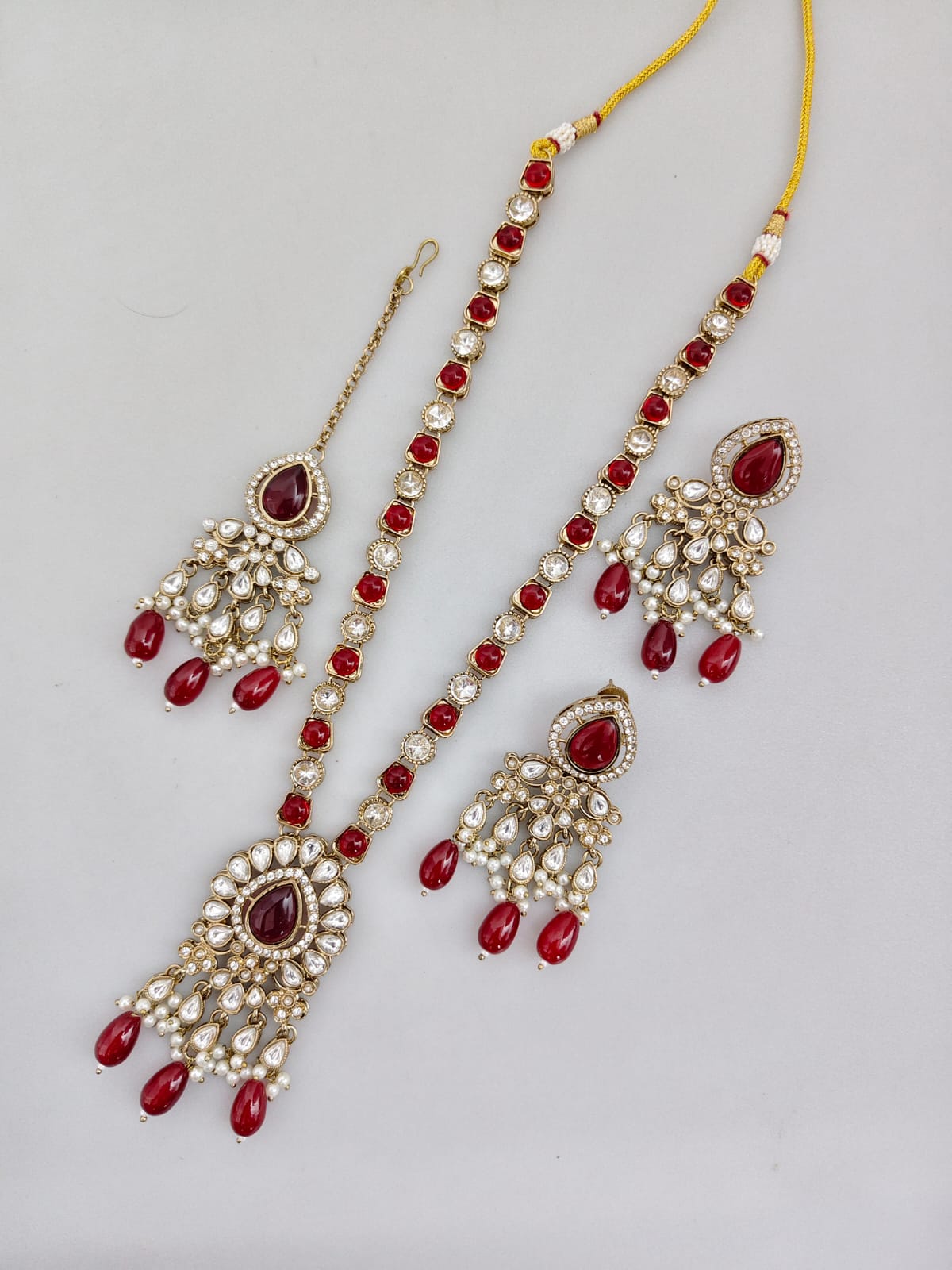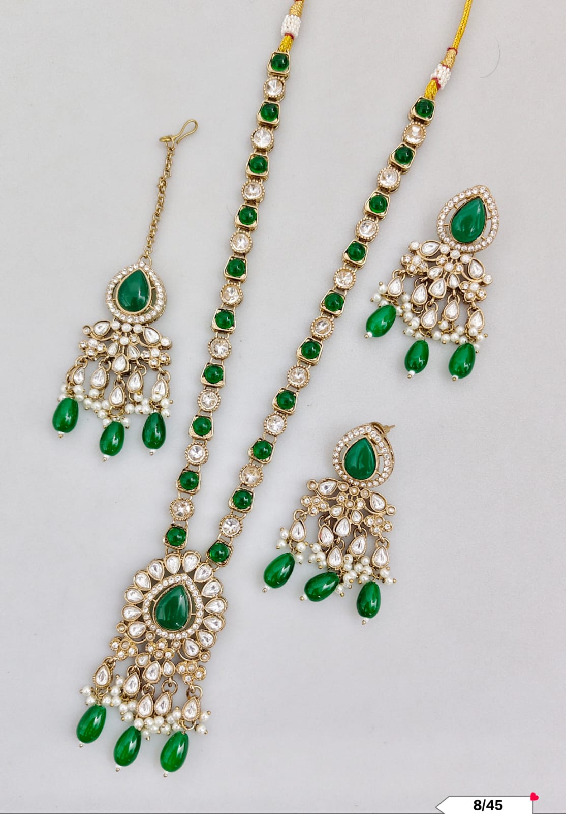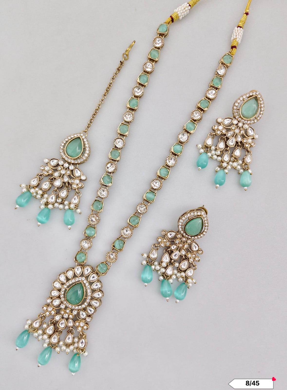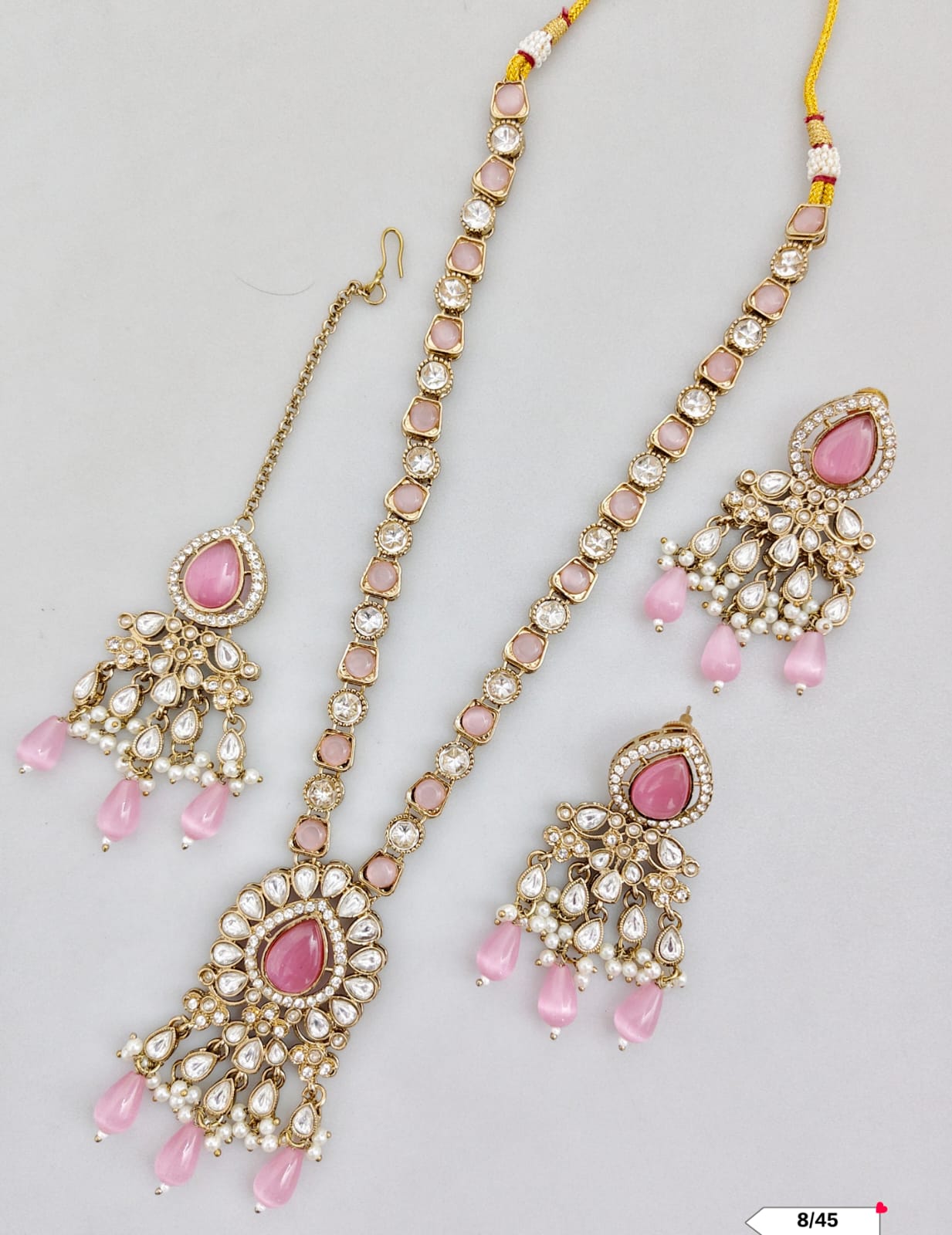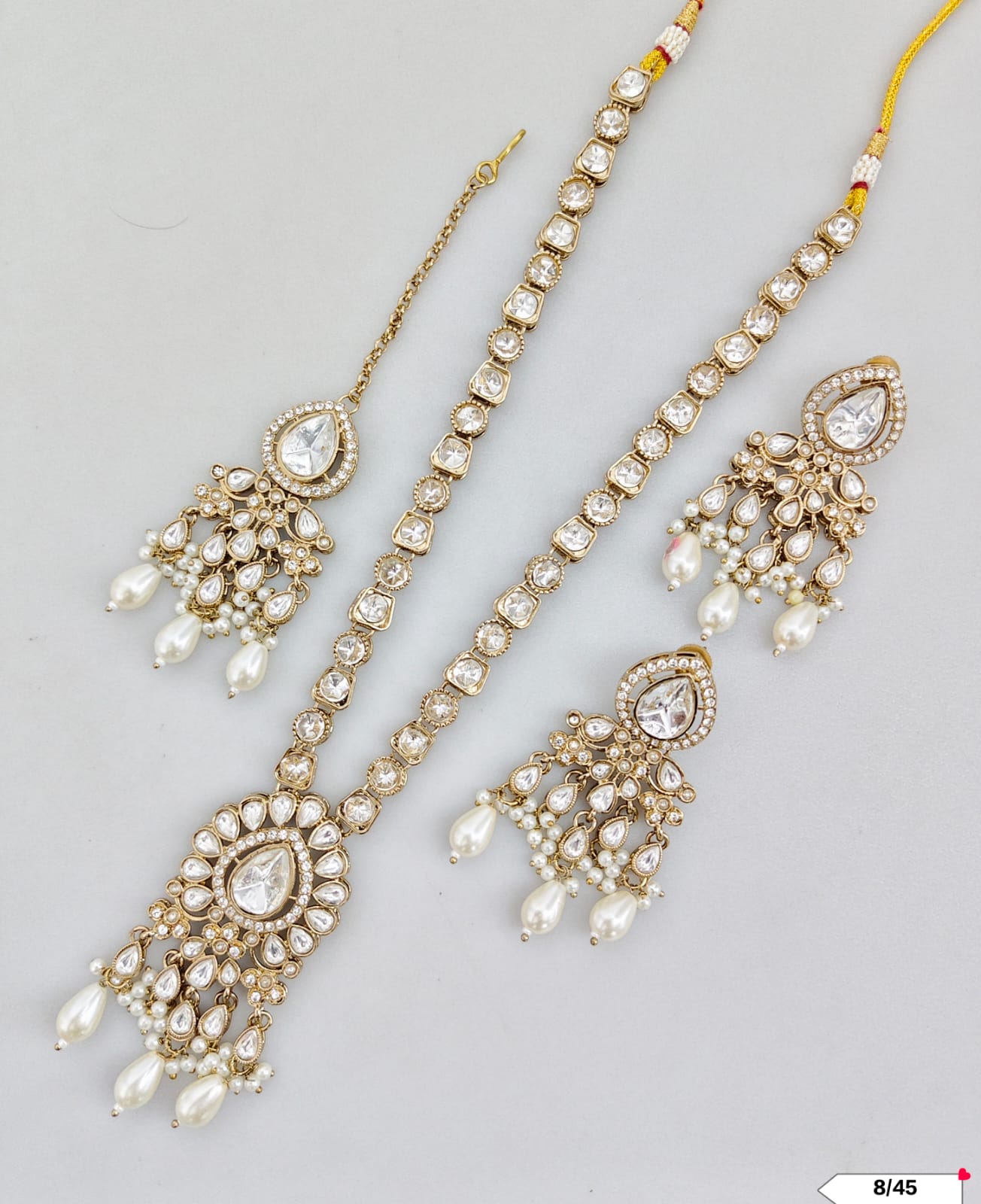 This vintage-inspired Kundan necklace set is beautifully finished with an antique gold plating, showcasing expert craftsmanship and classic elegance.