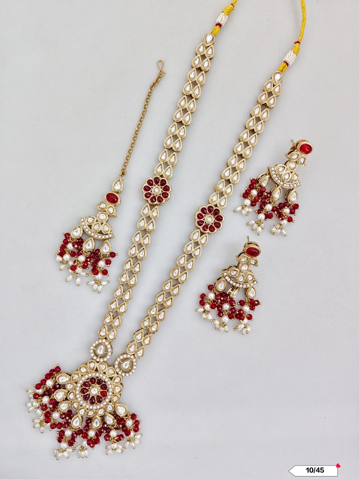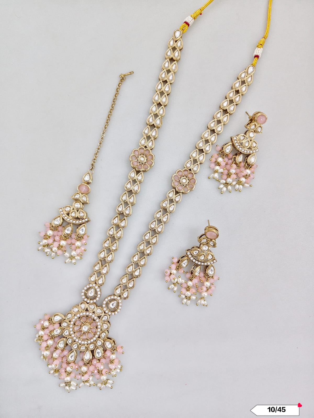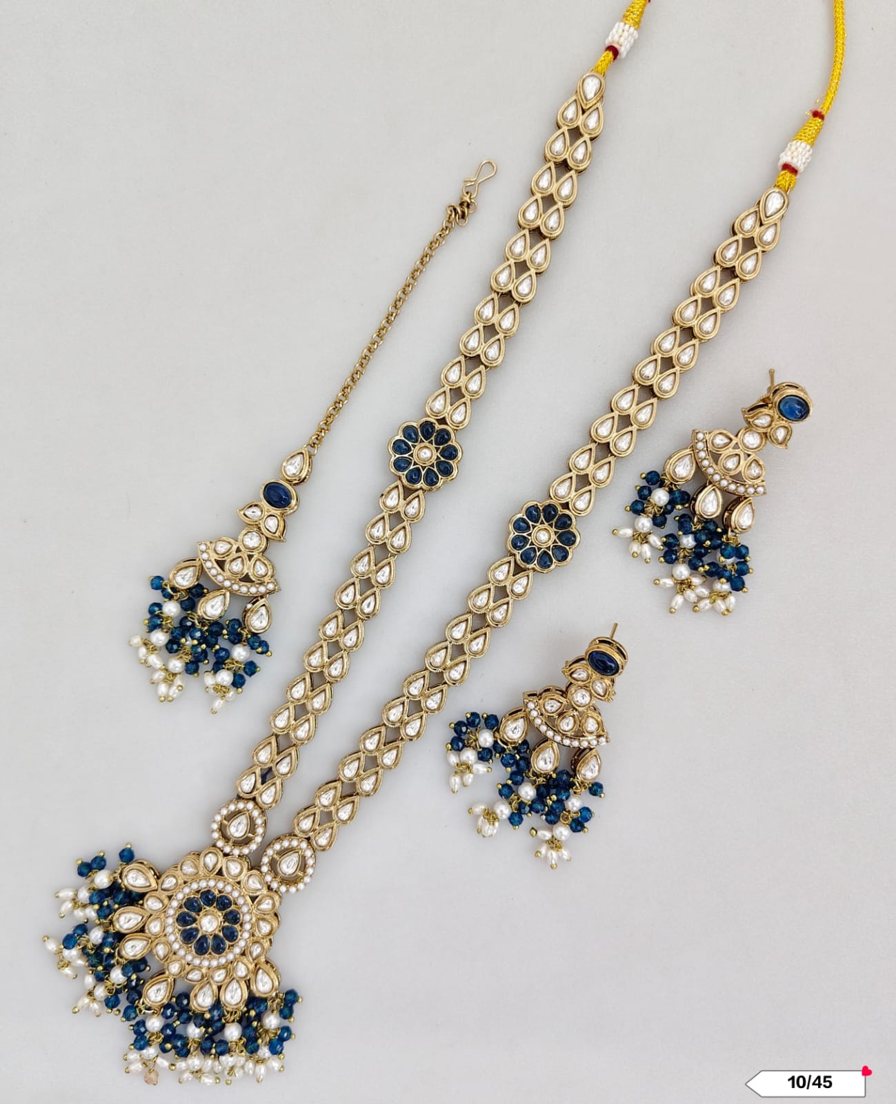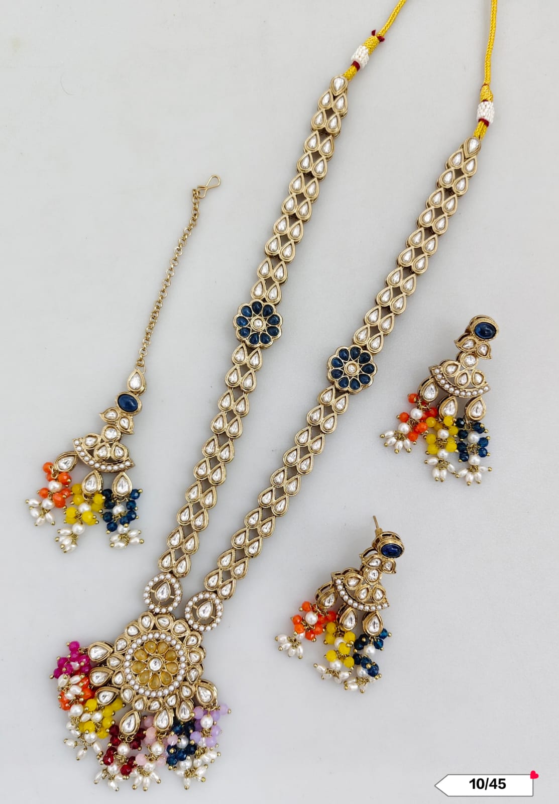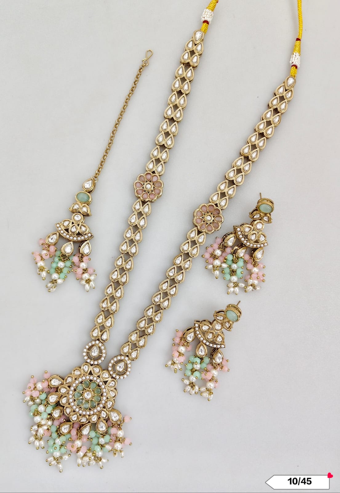 This exquisite necklace set features an antique gold plating combined with traditional Kundan craftsmanship, offering a timeless and elegant accessory for special occasions.