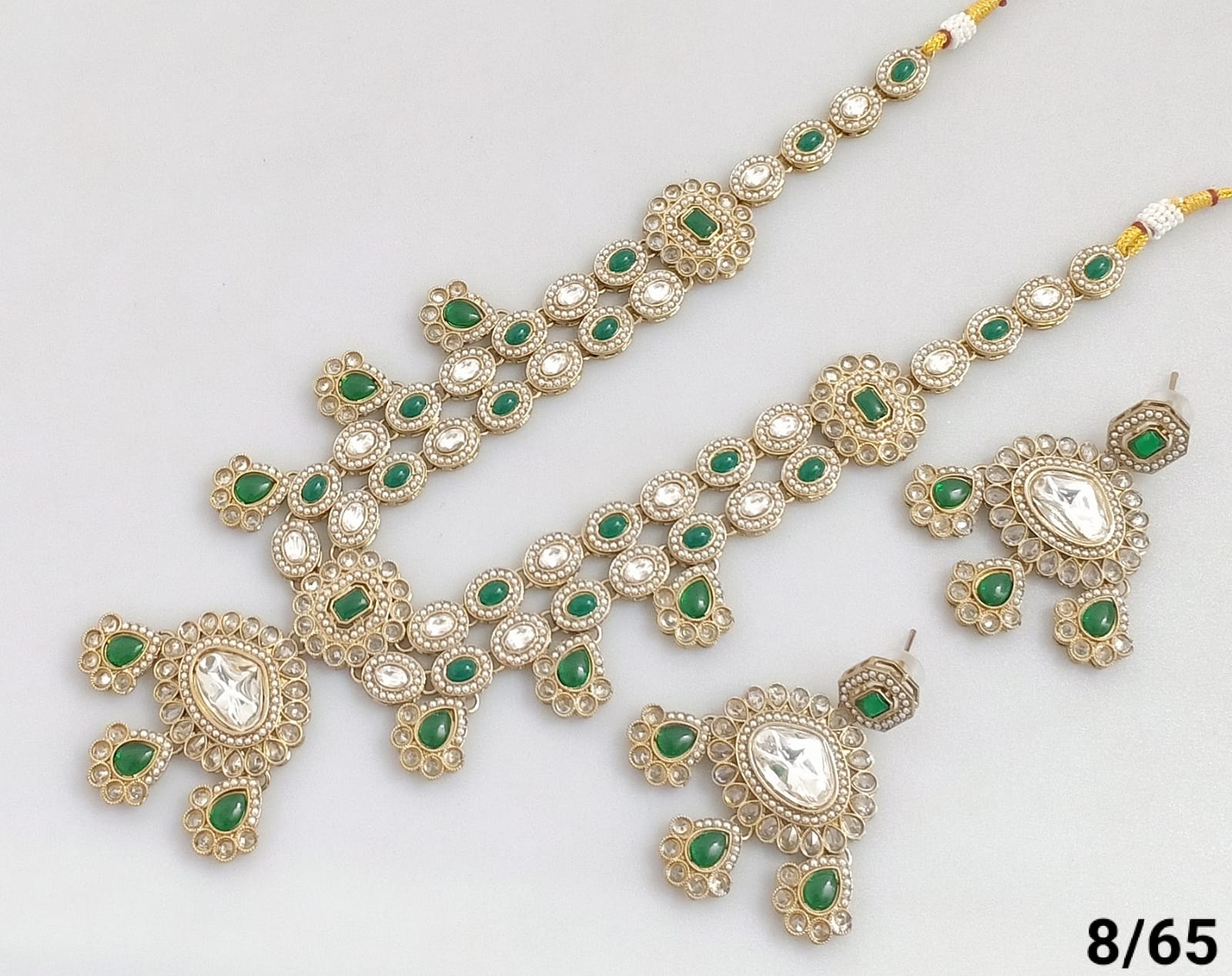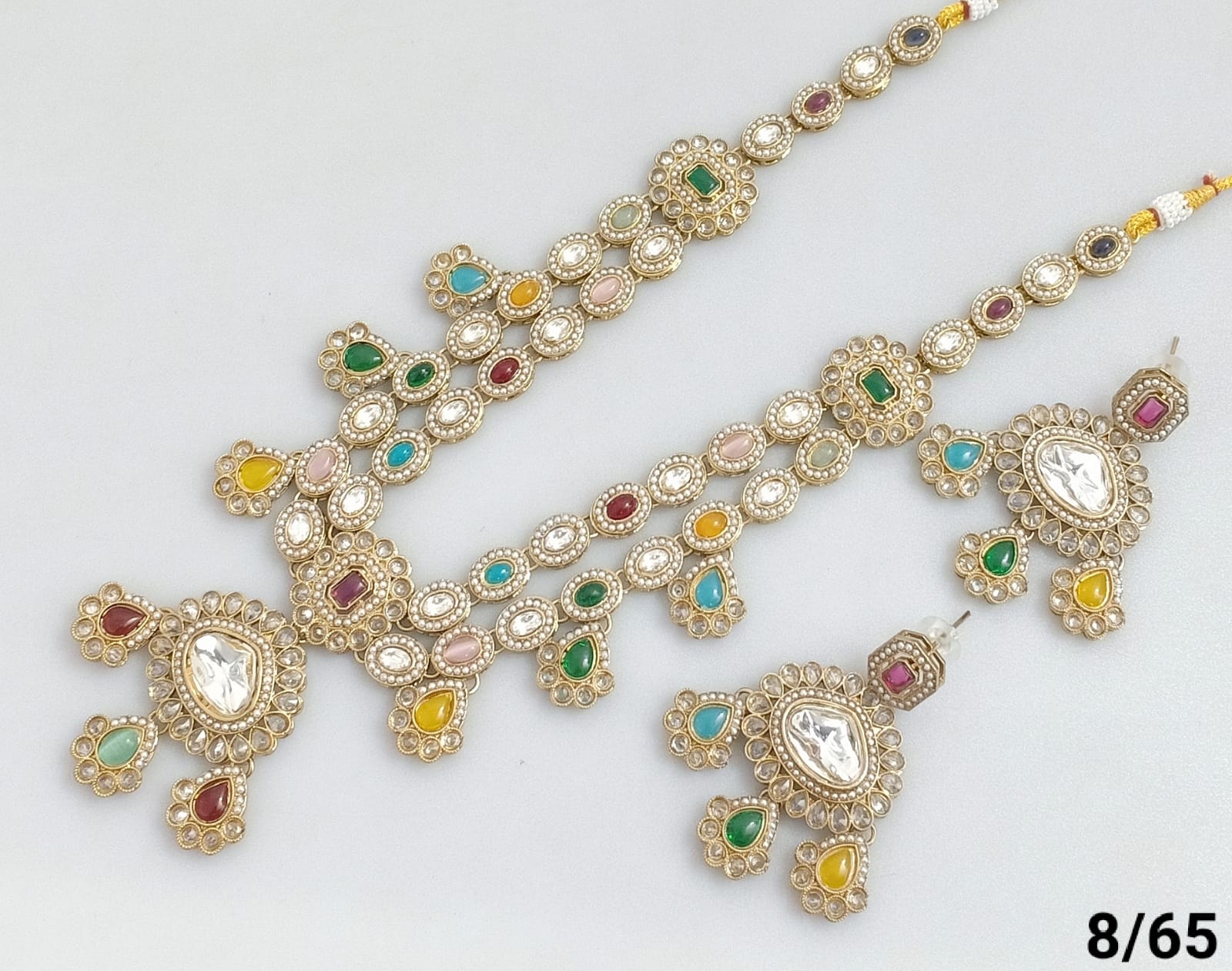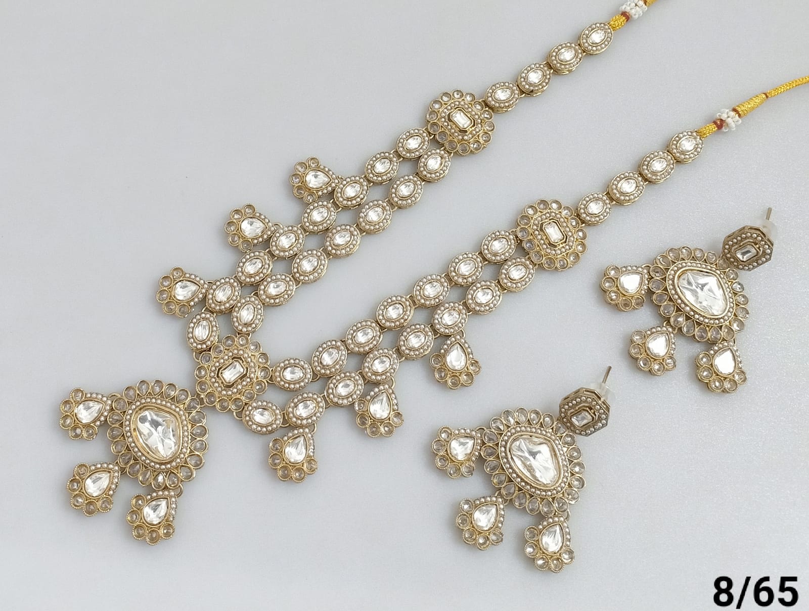 This exquisite necklace set features an antique gold plating combined with traditional Kundan craftsmanship, offering a timeless and elegant accessory for special occasions.