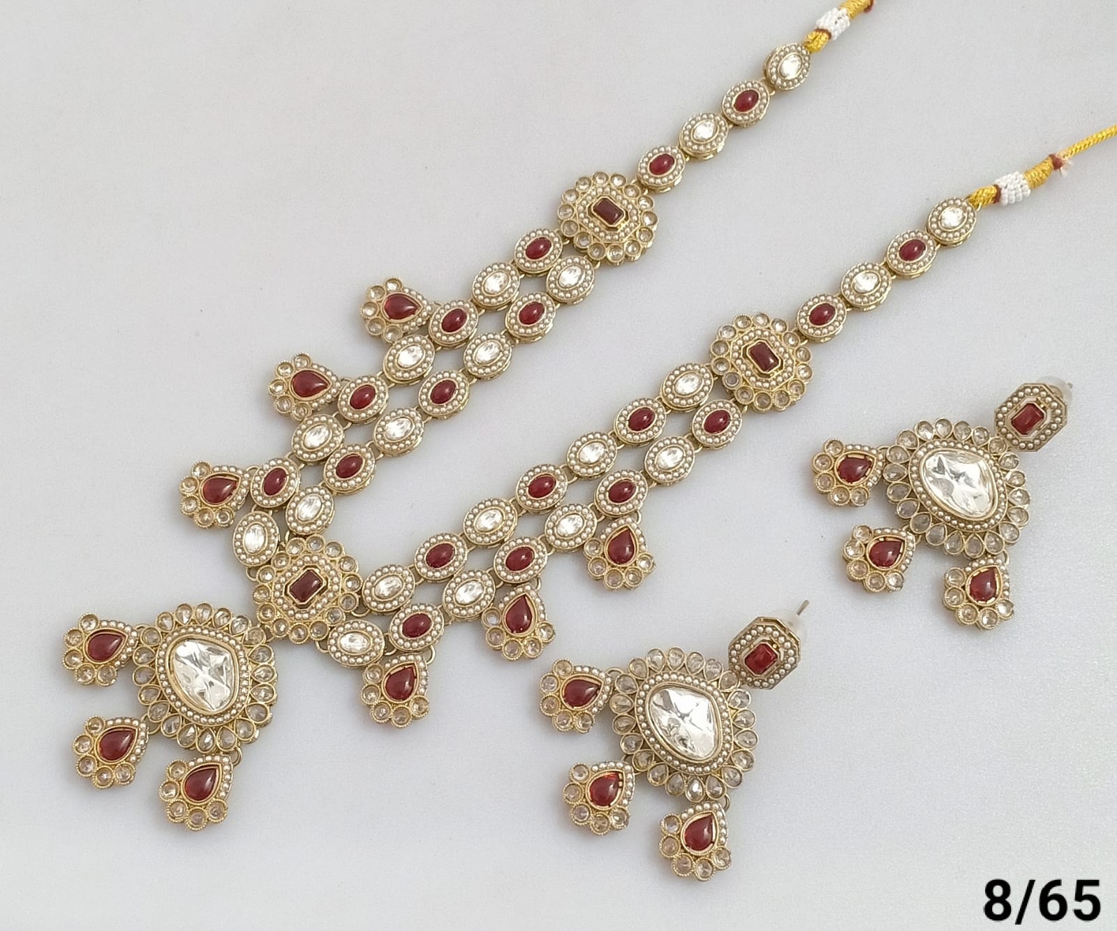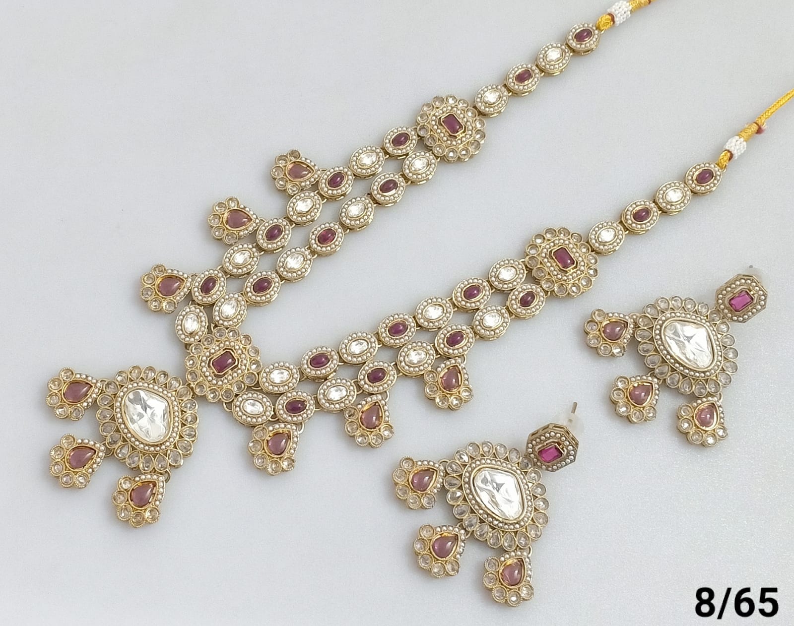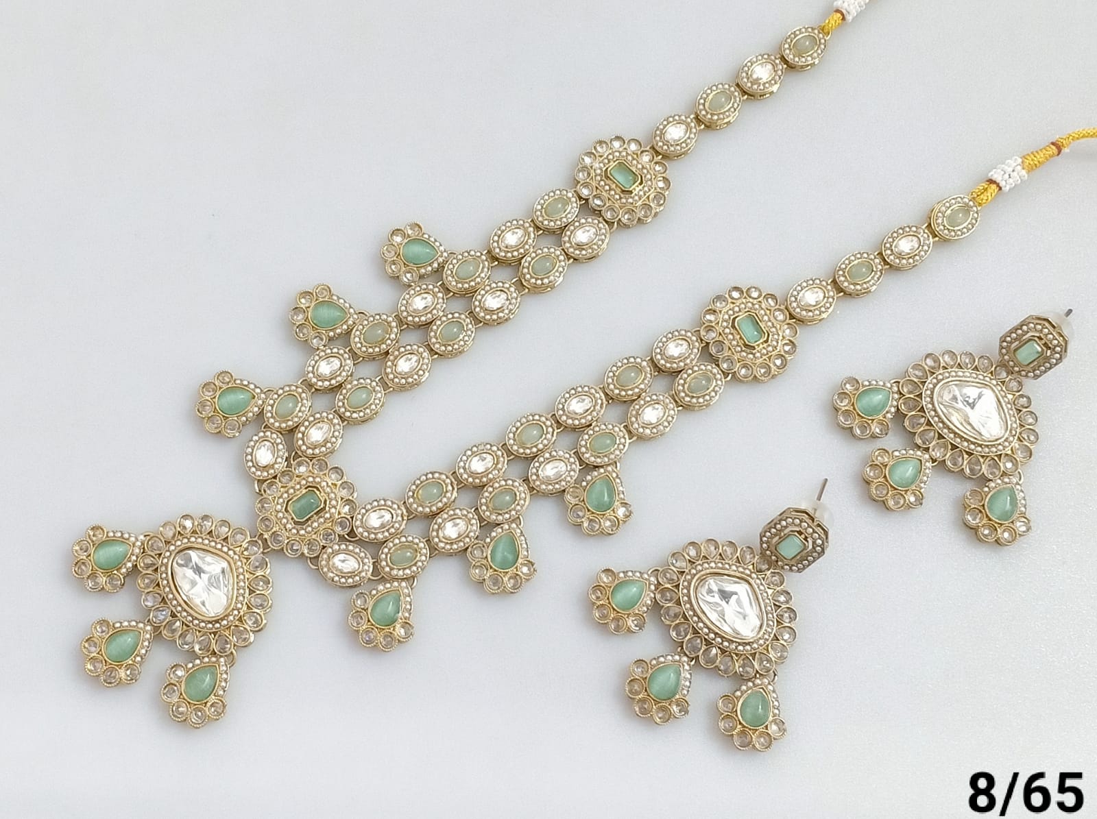 This exquisite necklace set features an antique gold plating combined with traditional Kundan craftsmanship, offering a timeless and elegant accessory for special occasions.