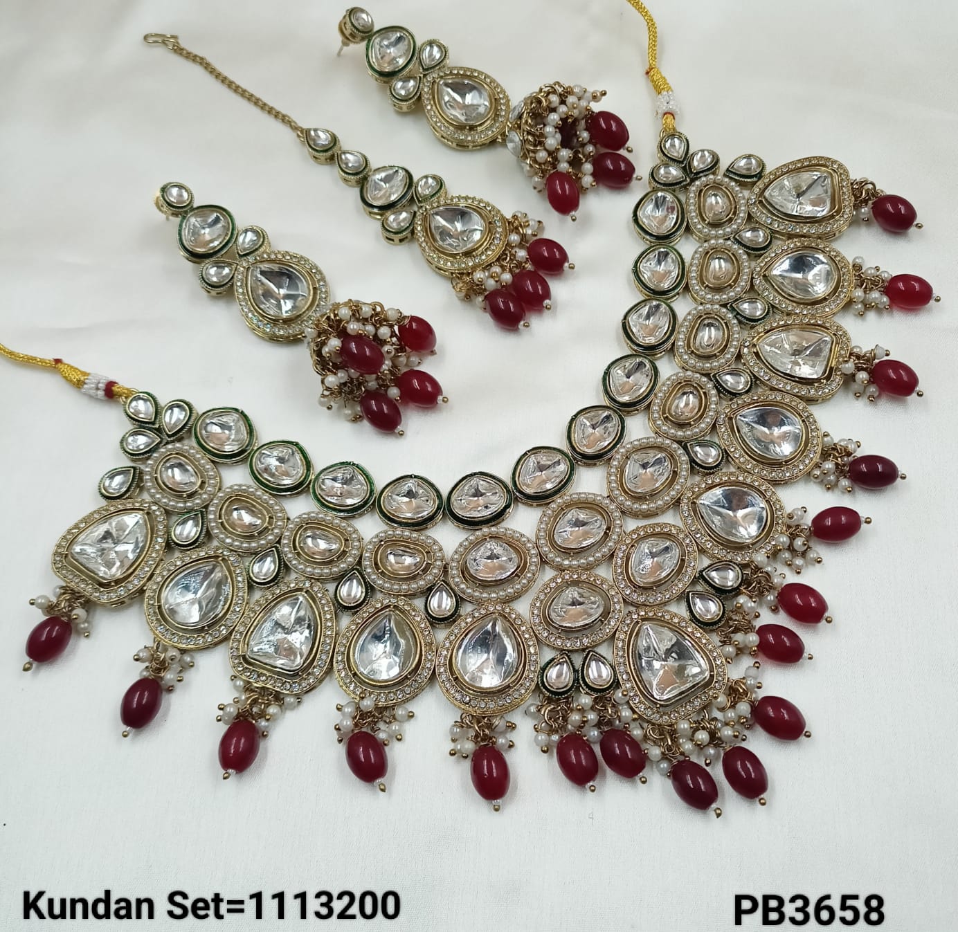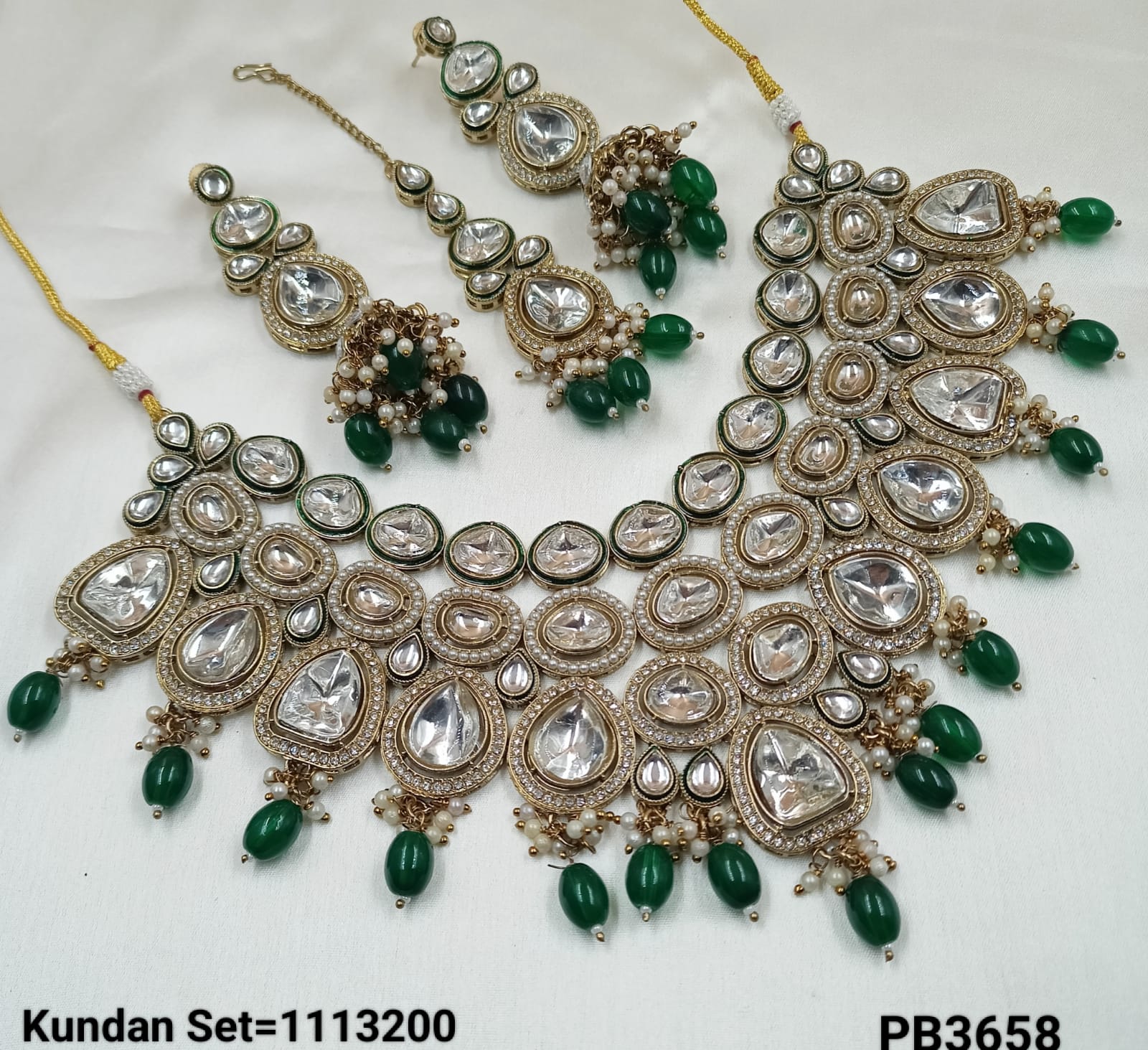 This exquisite necklace set features an antique gold plating combined with traditional Kundan craftsmanship, offering a timeless and elegant accessory for special occasions.