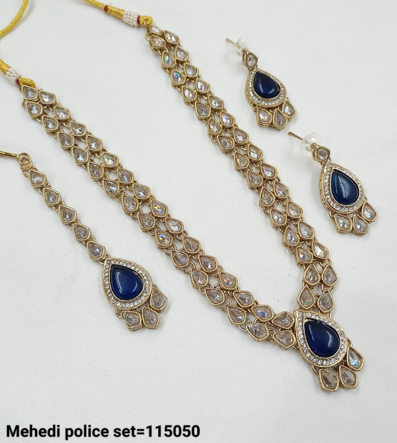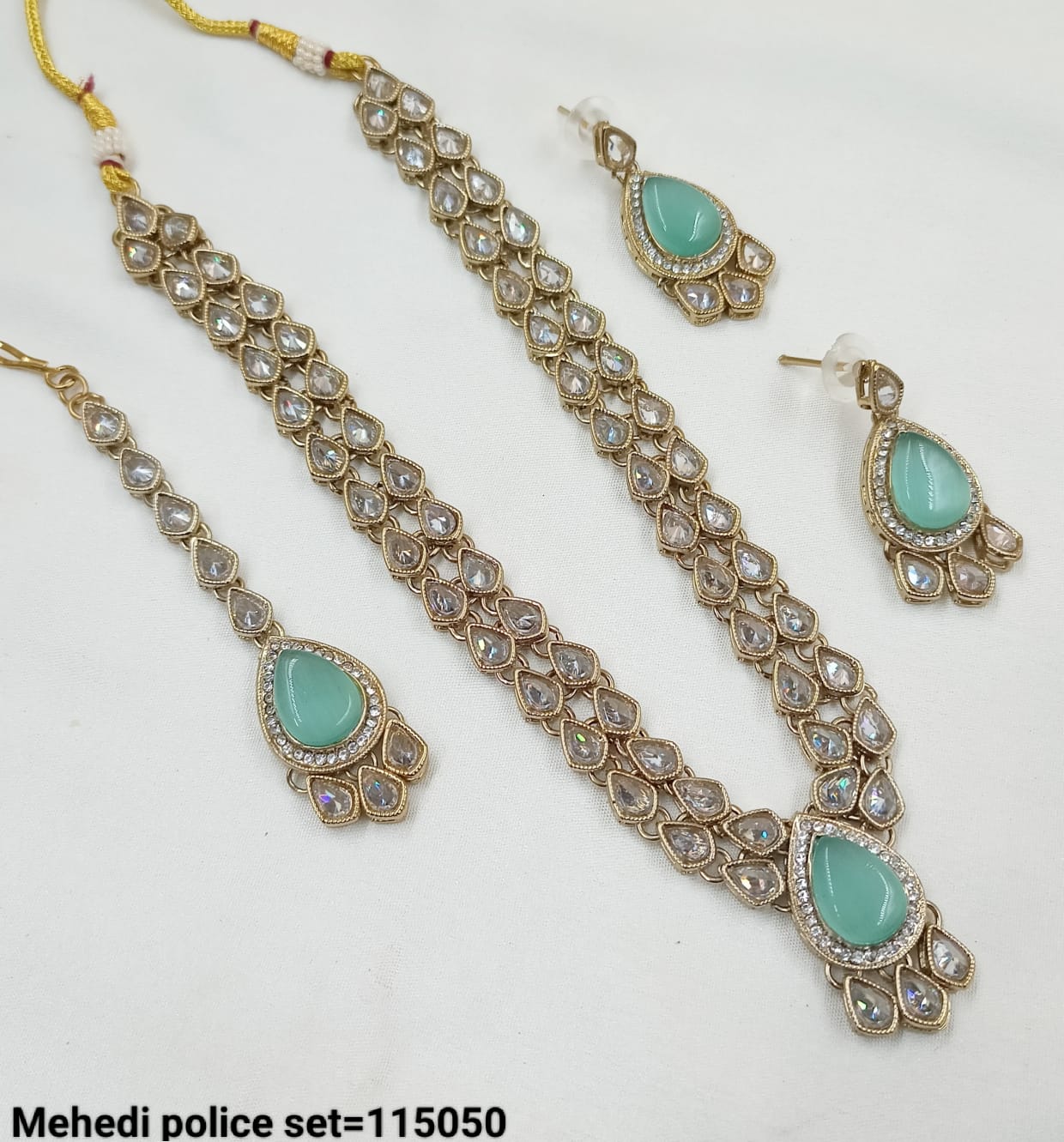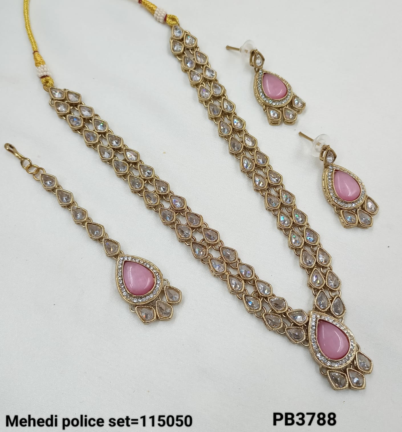 Elevate your traditional look with this exquisite Antique Gold Polki Necklace and Earring Set. Meticulously crafted with high-quality stones and detailed craftsmanship, this set includes a necklace, a pair of earrings, and a matching maang tikka. The elegant teardrop-shaped design paired with shimmering stones makes it perfect for weddings, festive occasions, or any cultural celebration. Designed to add a royal touch to your ensemble, this jewelry set is a timeless addition to your collection.