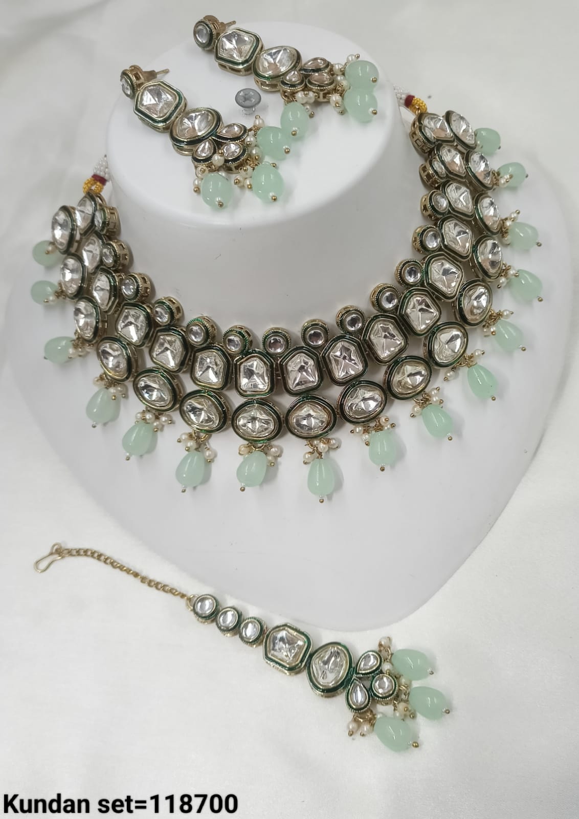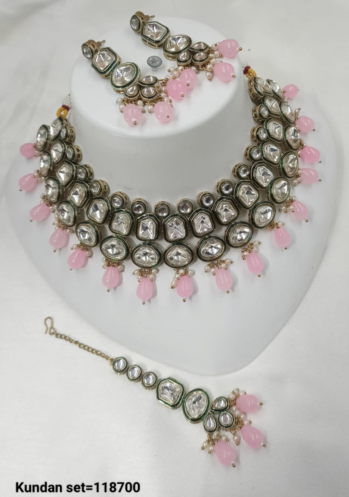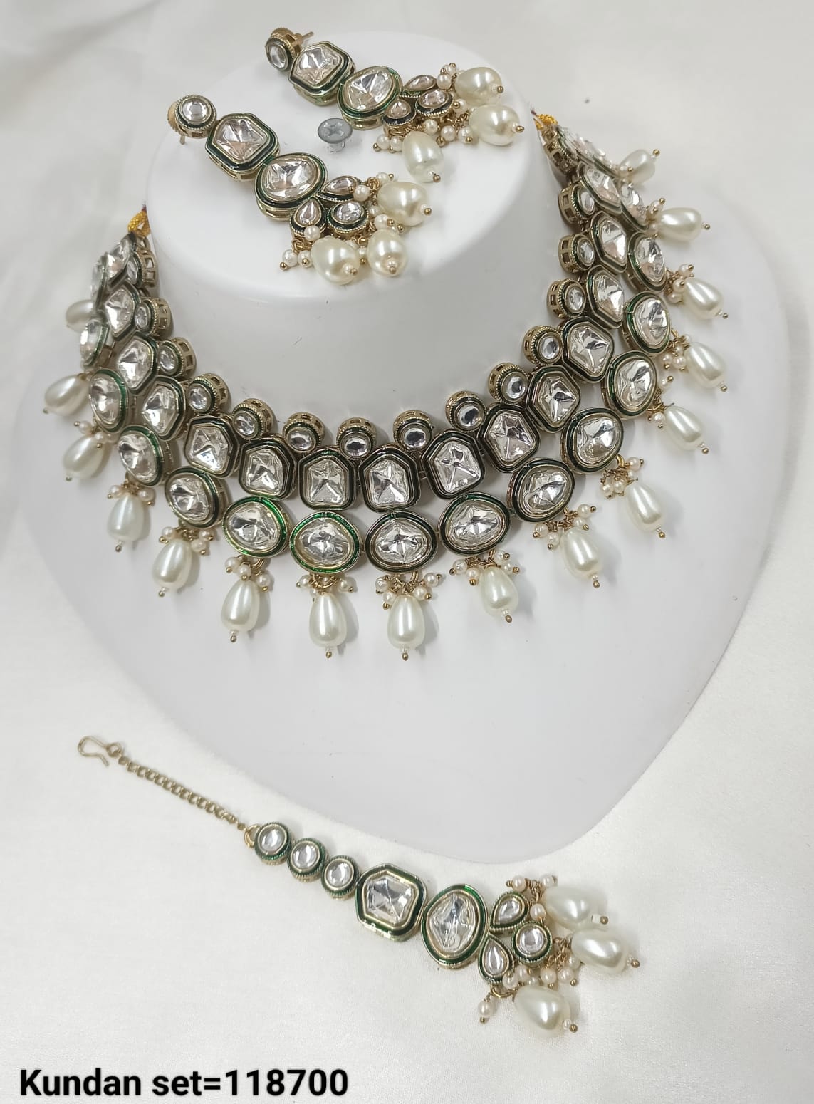 This exquisite necklace set features an antique gold plating combined with traditional Kundan craftsmanship, offering a timeless and elegant accessory for special occasions.