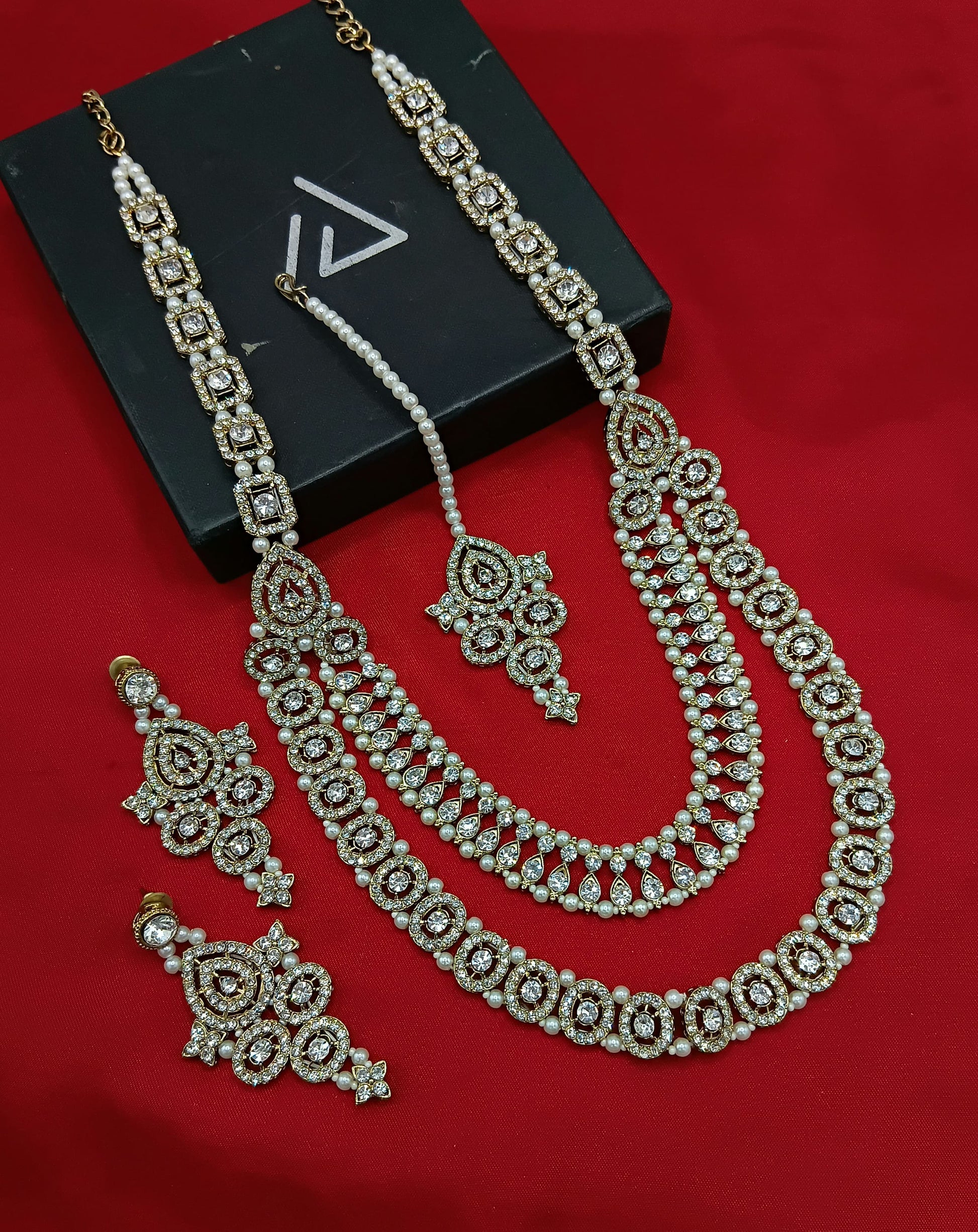 Elegant and timeless, this long jewellery set is beautifully crafted with an antique gold plating, offering a sophisticated accessory for any occasion.