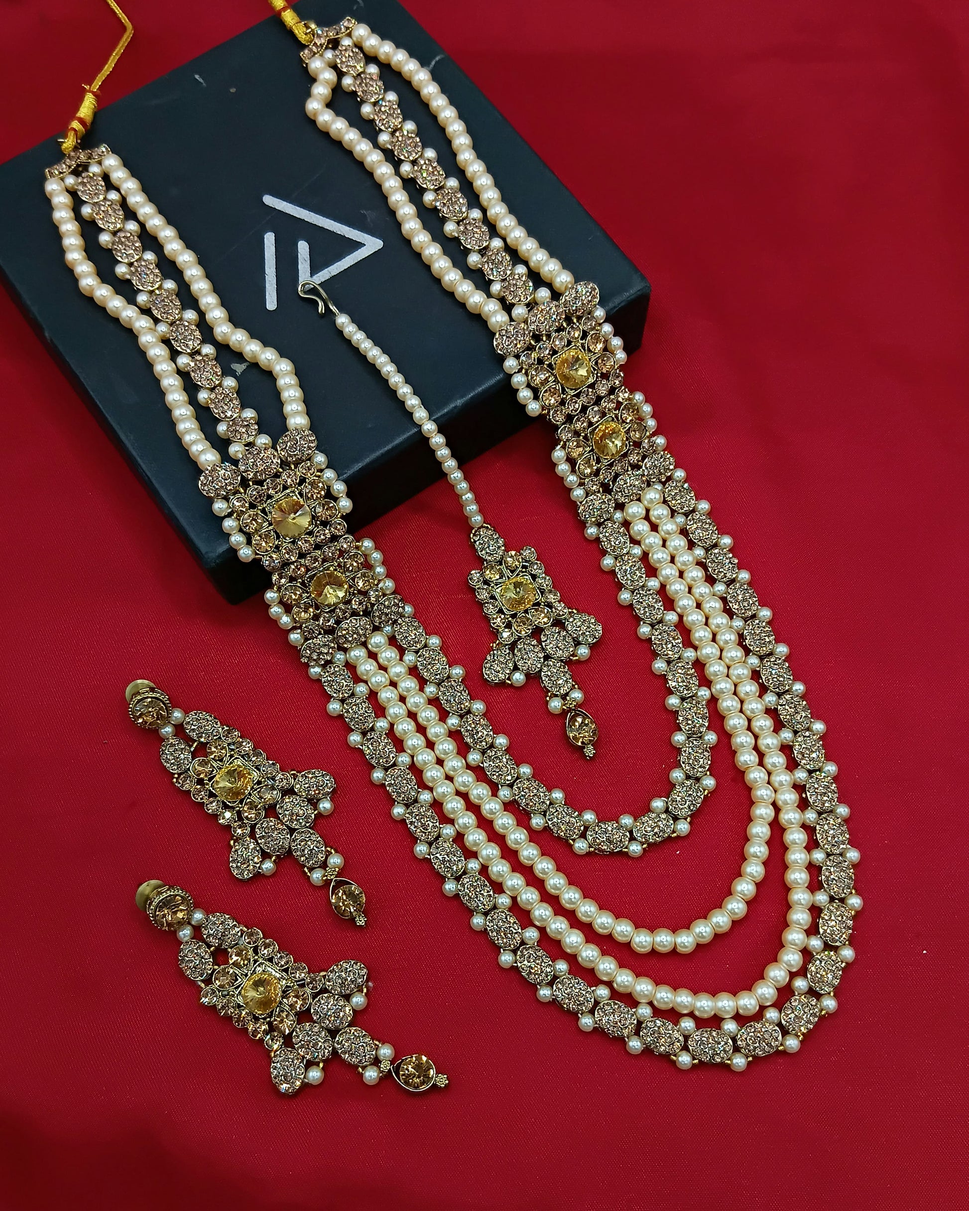 This long jewellery set features an elegant antique gold plating, showcasing expert craftsmanship and a timeless design for a distinguished appearance.