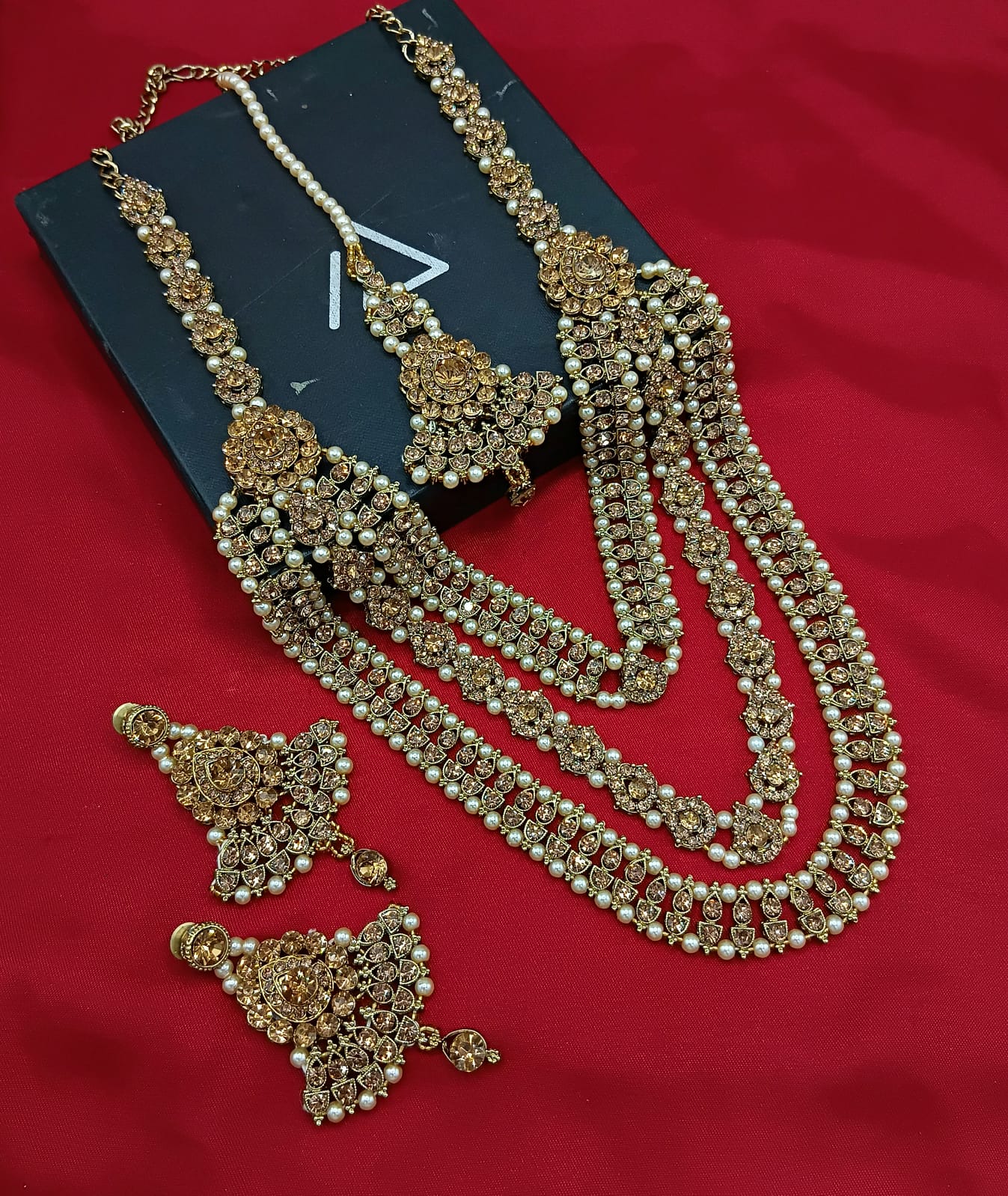 This long jewellery set features an elegant antique gold plating, expertly crafted to provide a timeless and refined accessory.