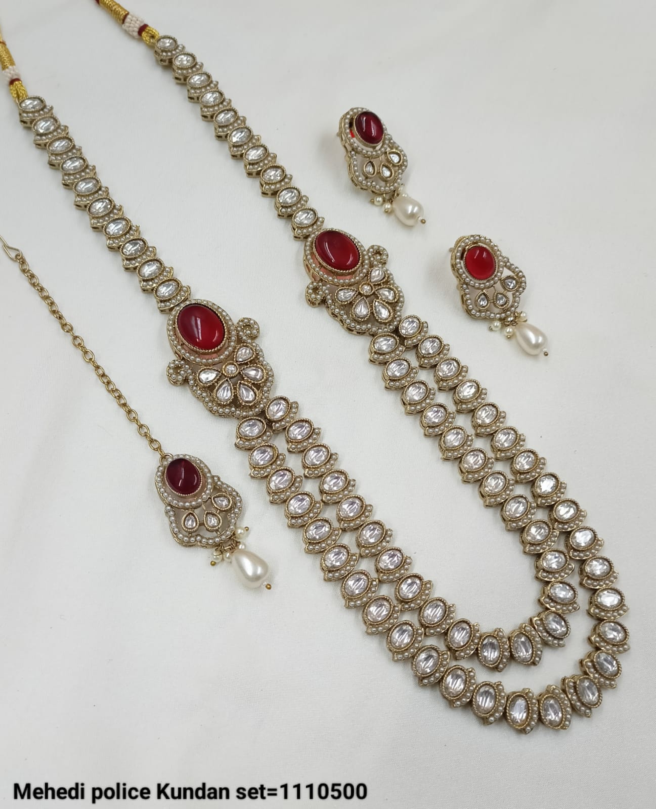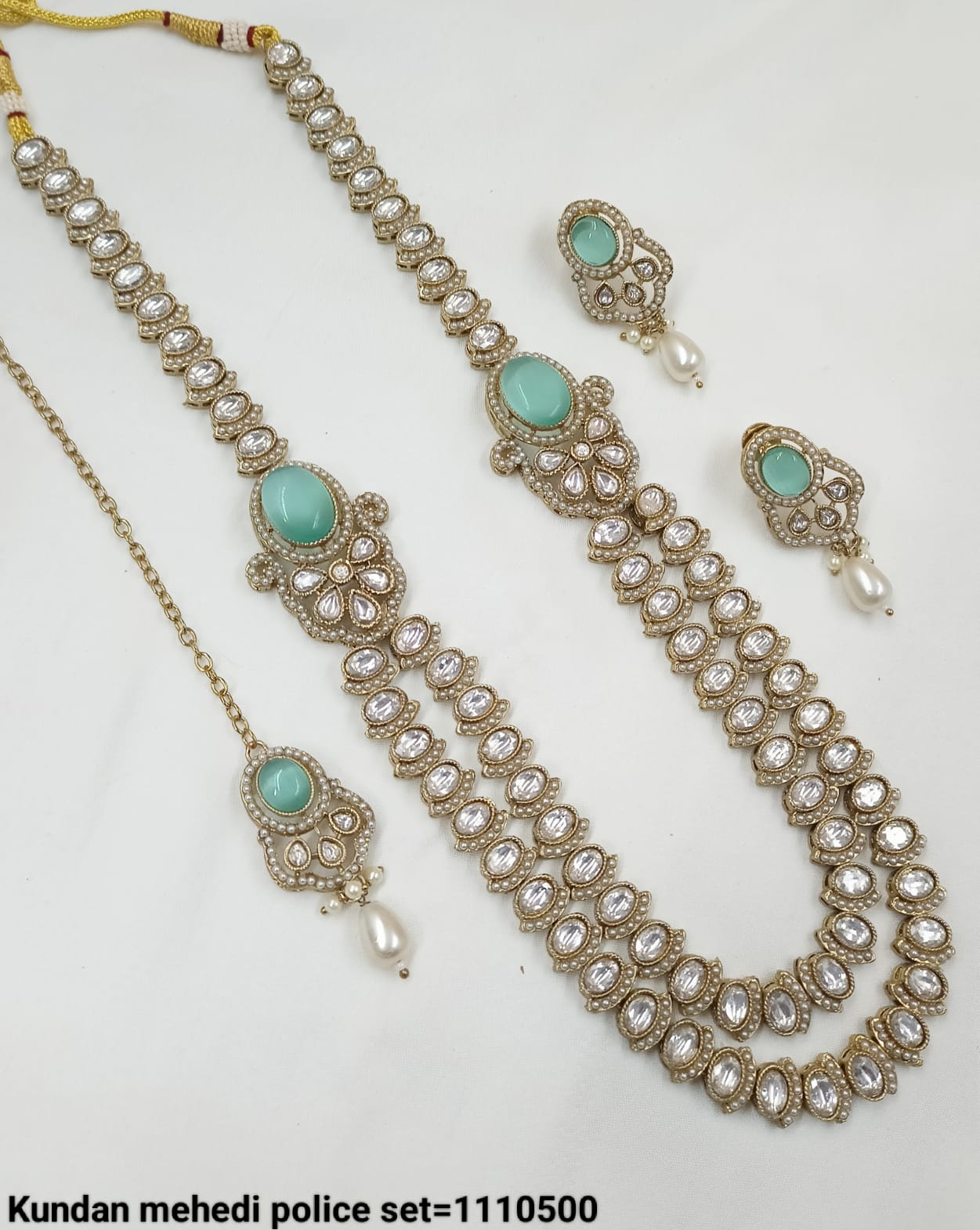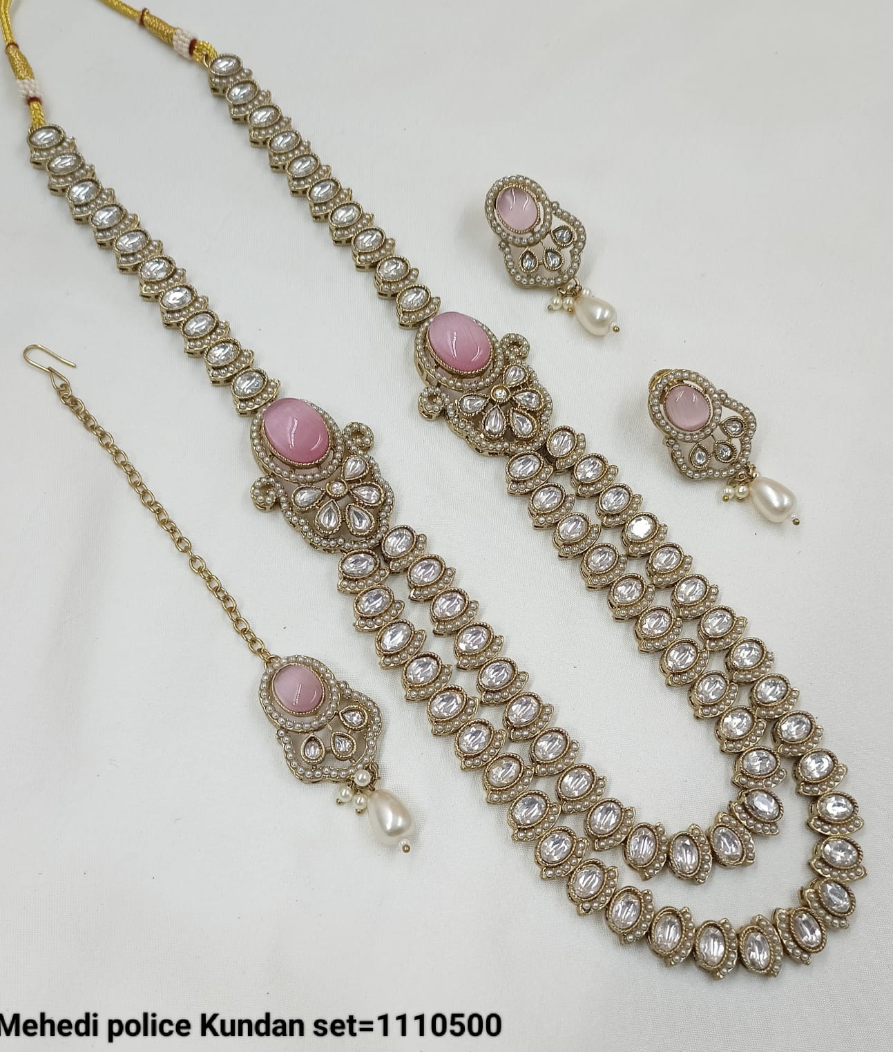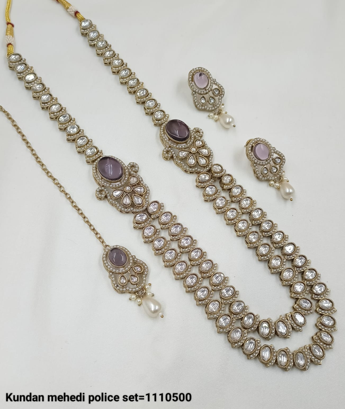 This exquisite long necklace set features an antique gold plating and intricate Kundan craftsmanship, showcasing timeless elegance and expert artistry.