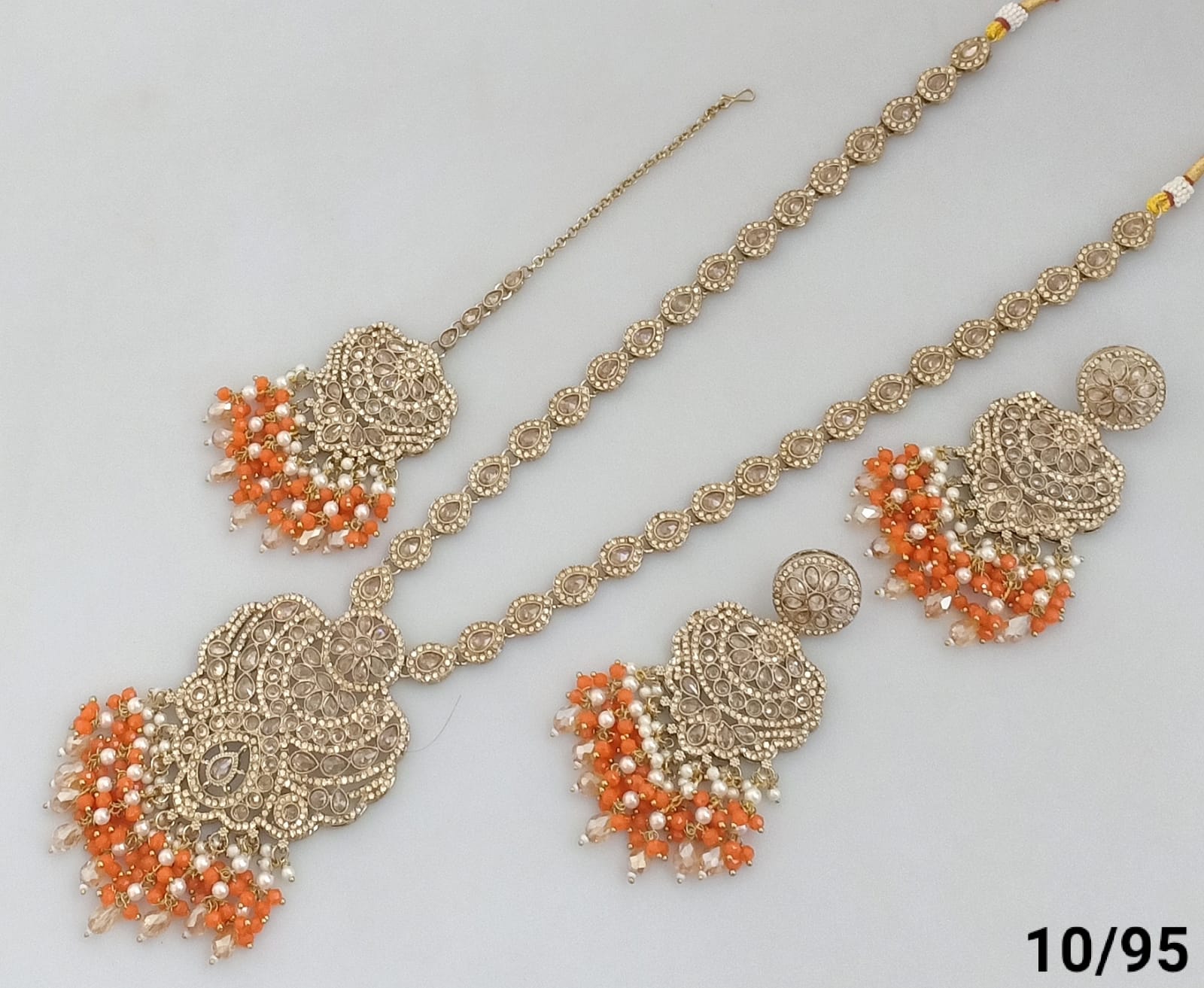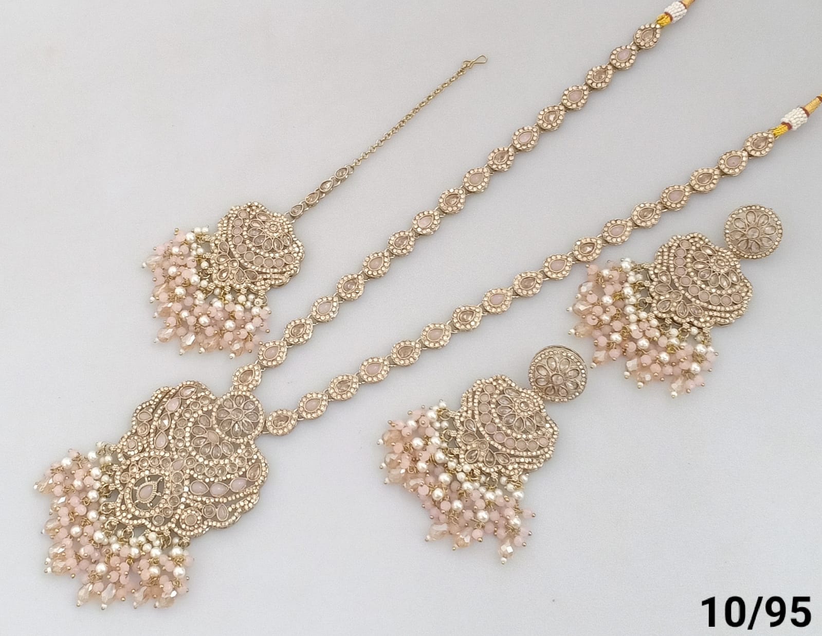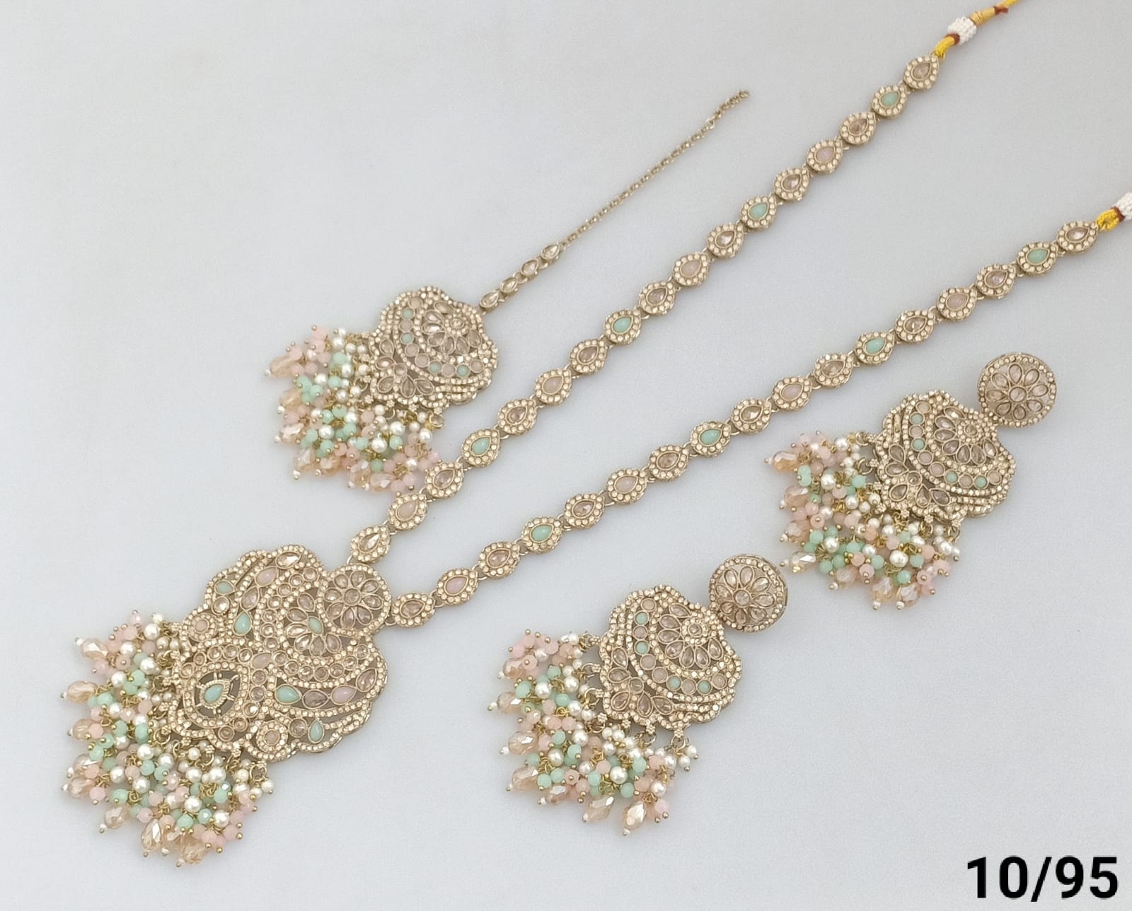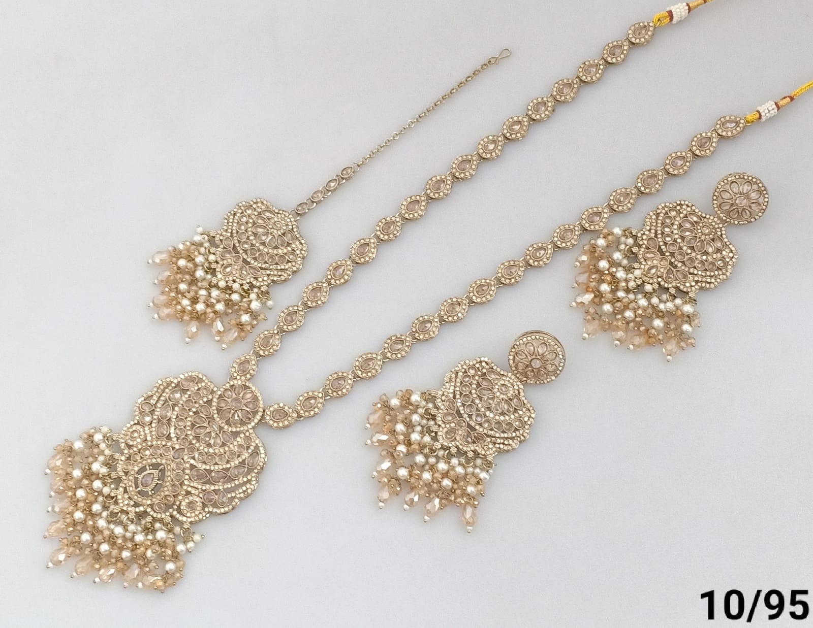 Elegant long necklace set finished with an antique gold plating, showcasing refined artistry and classic style.