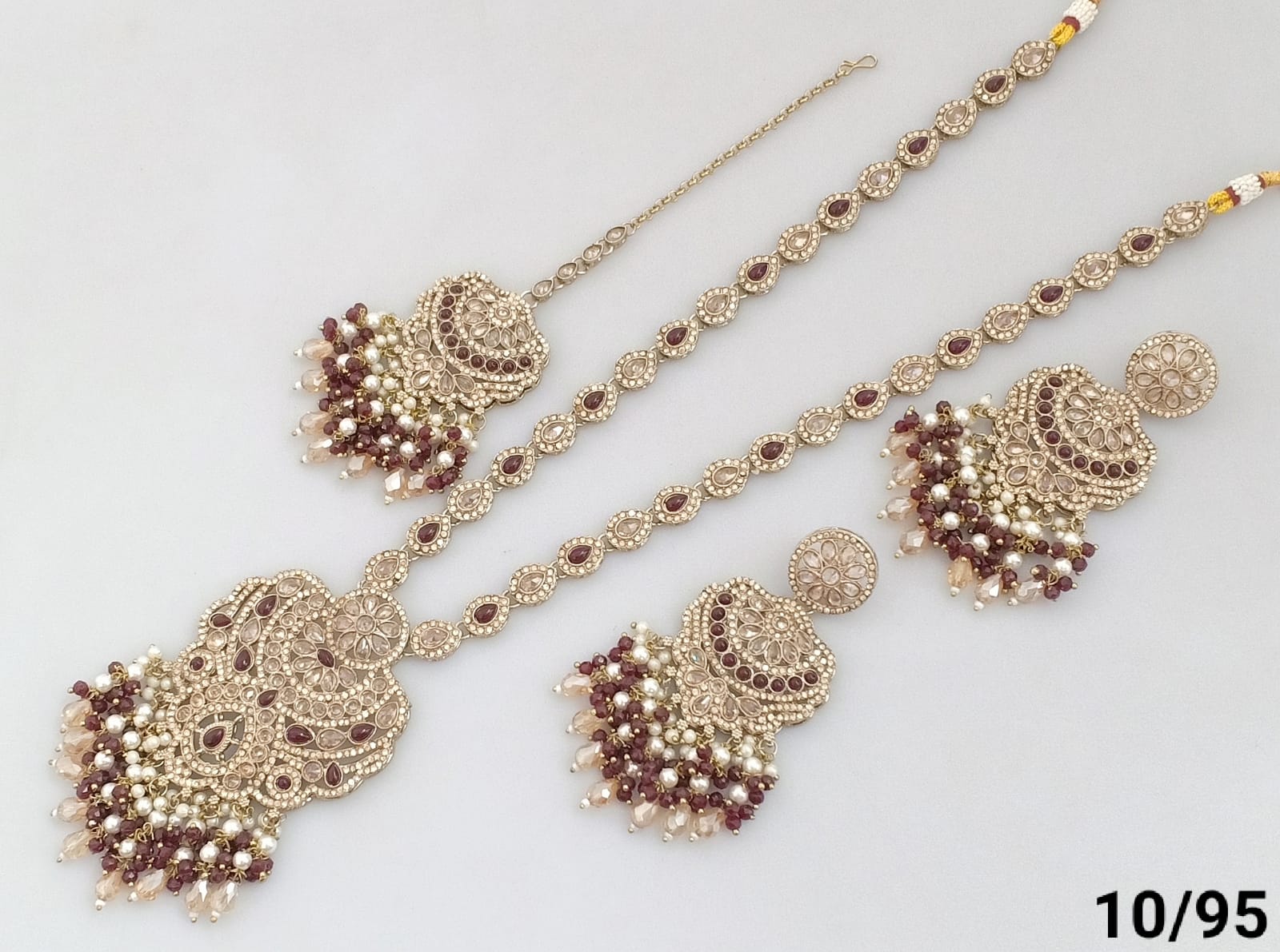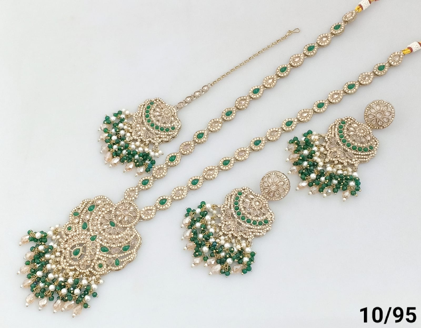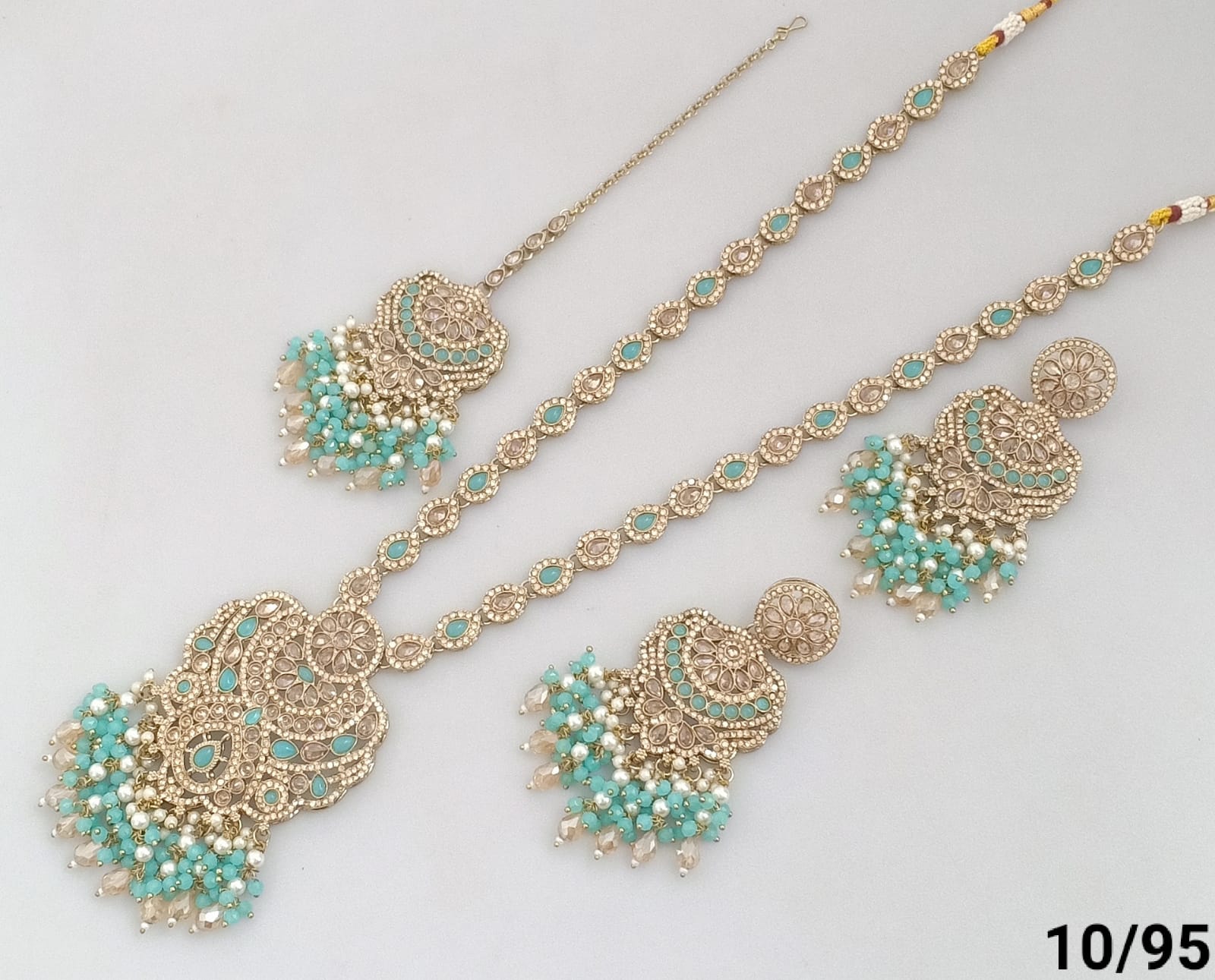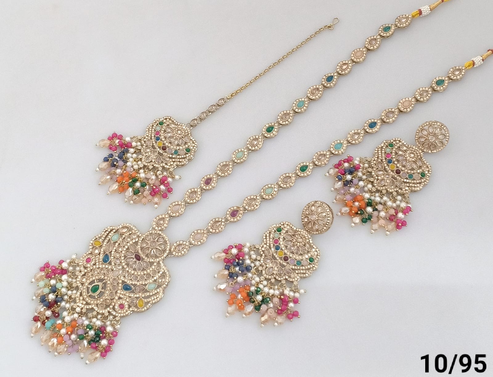 Elegant long necklace set finished with an antique gold plating, showcasing refined artistry and classic style.