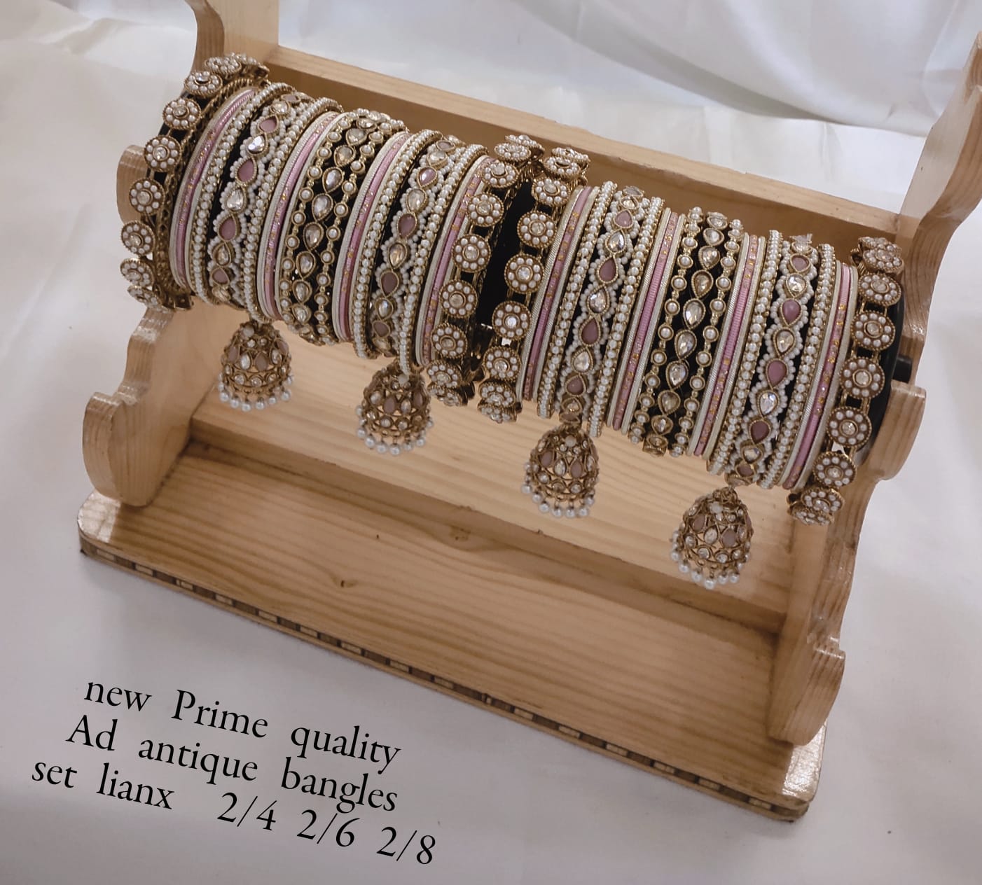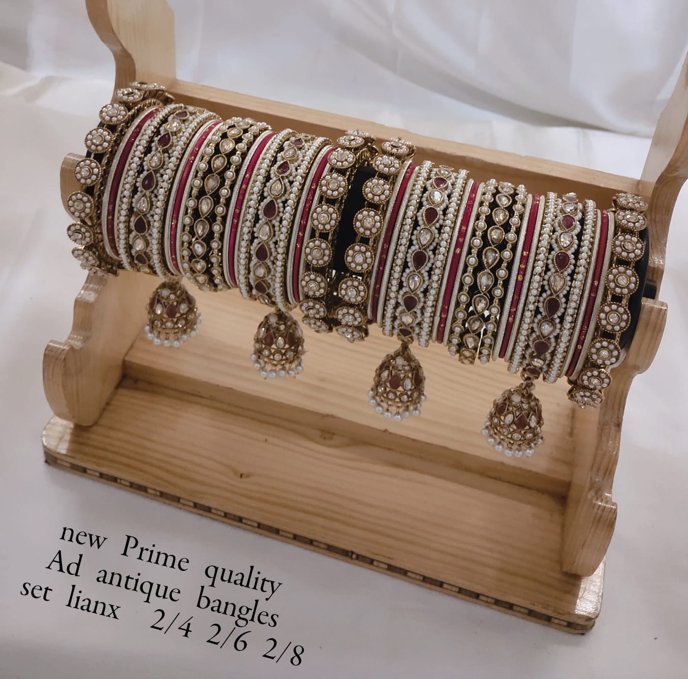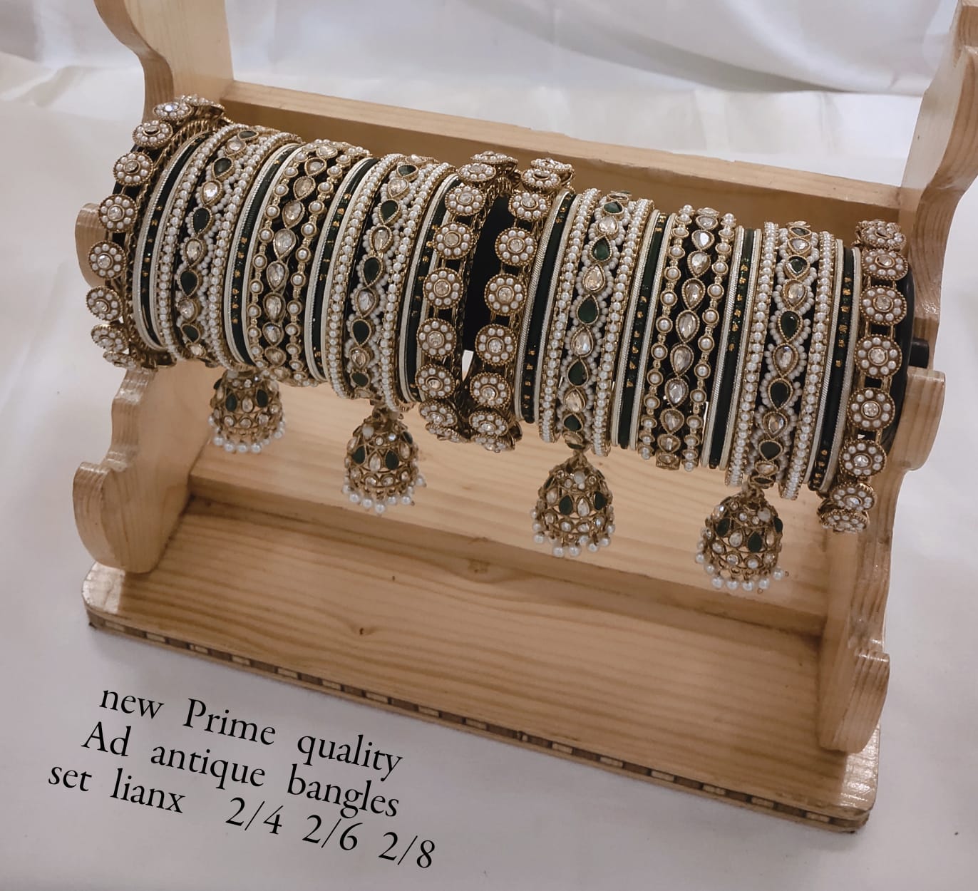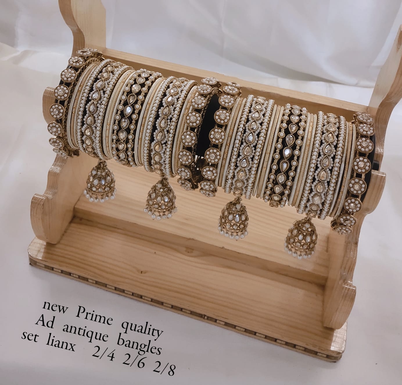 This exquisite set features an antique gold wedding chooda, meticulously crafted to enhance traditional bridal attire with timeless elegance.