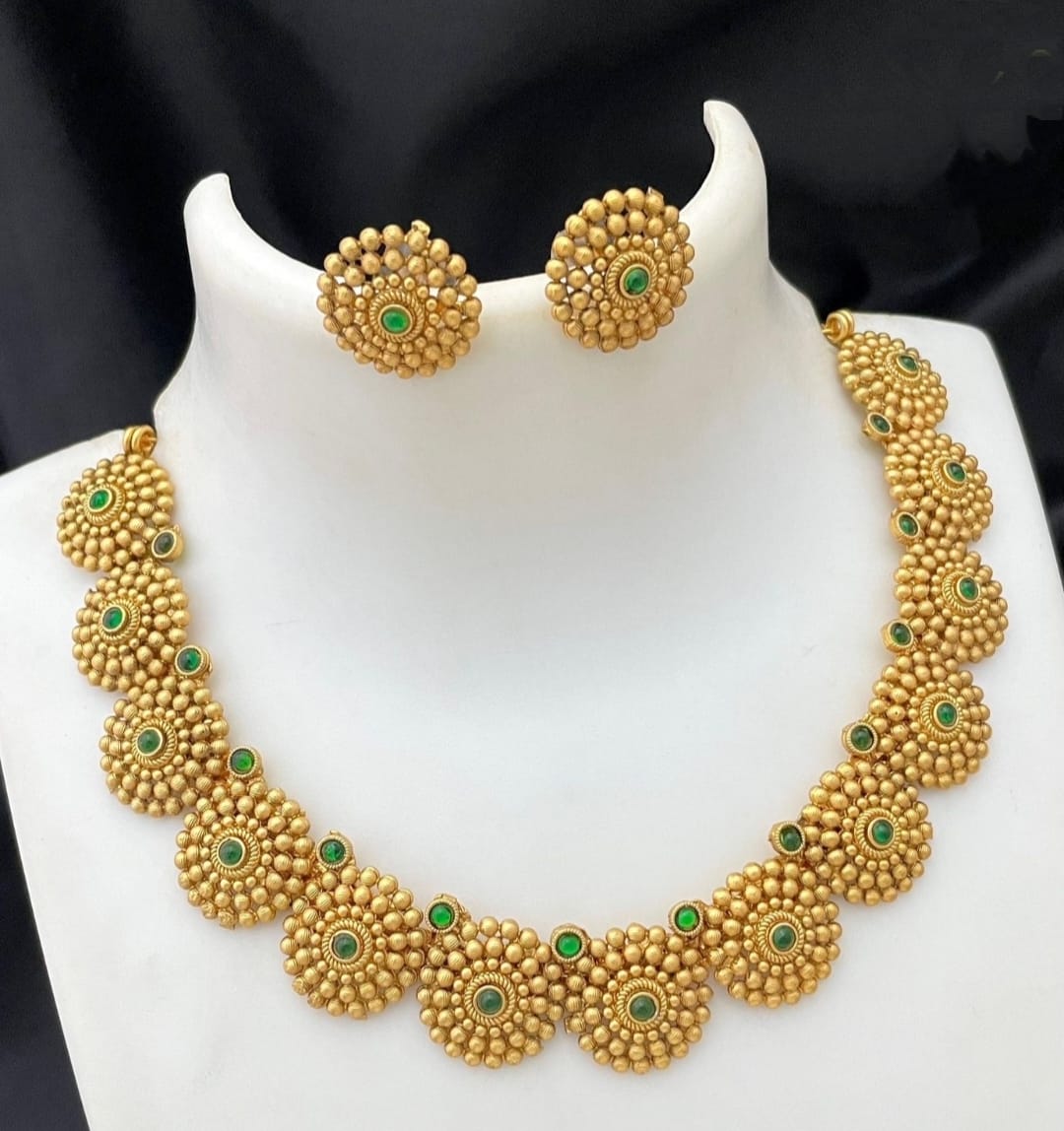 Beautiful Classic Gold Plated Flower Design Circle Shape Temple Choker Necklace With Matching Earring Jewellery Set For Women And Girls