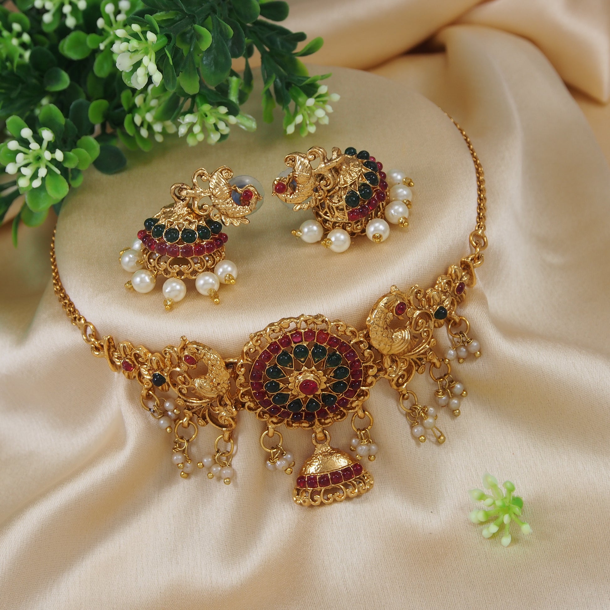 Beautiful South Indian Gold Plated Peacock Necklace Pearl Dropped Temple Jewellery Set With Jhumki Earrings For Women And Girls