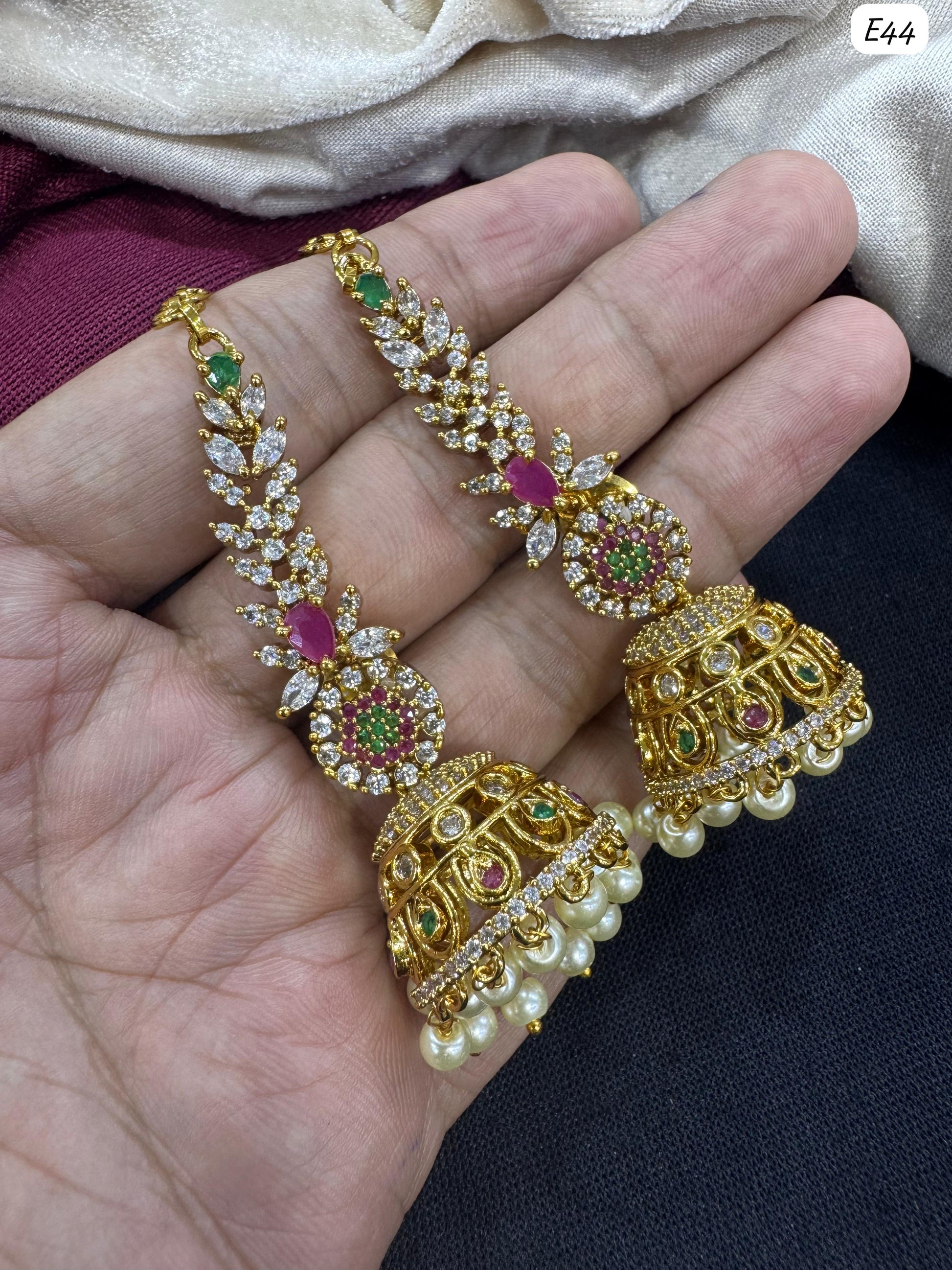 Complete your bridal or festive look with these exquisite Bridal AD Jhumka Earrings. Featuring intricate floral detailing, premium American Diamond embellishments, and elegant pearl drops, these earrings blend traditional artistry with modern elegance. The long, ornate design adds a regal touch to any ethnic outfit, making it a perfect accessory for weddings, receptions, and festive occasions.